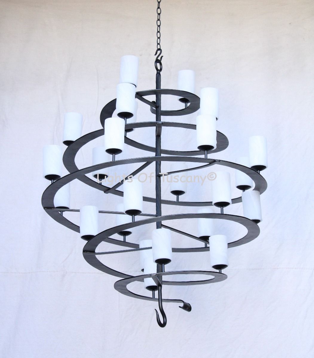 This is a heavy duty, hand forged wrought iron spiral chandelier. This extra large contemporary chandelier is perfect for large spaces and high ceilings. Available with glass candle shades or candelabra style candlesticks. This can be used for modern syle homes, or rustic transitional style home designs.