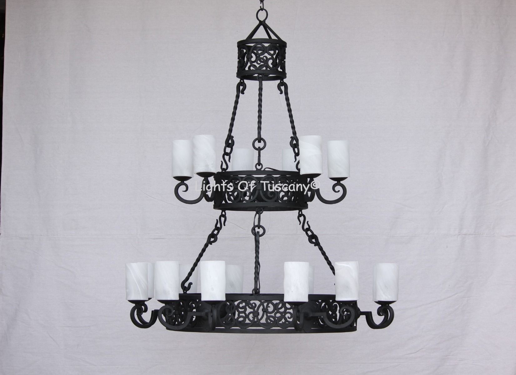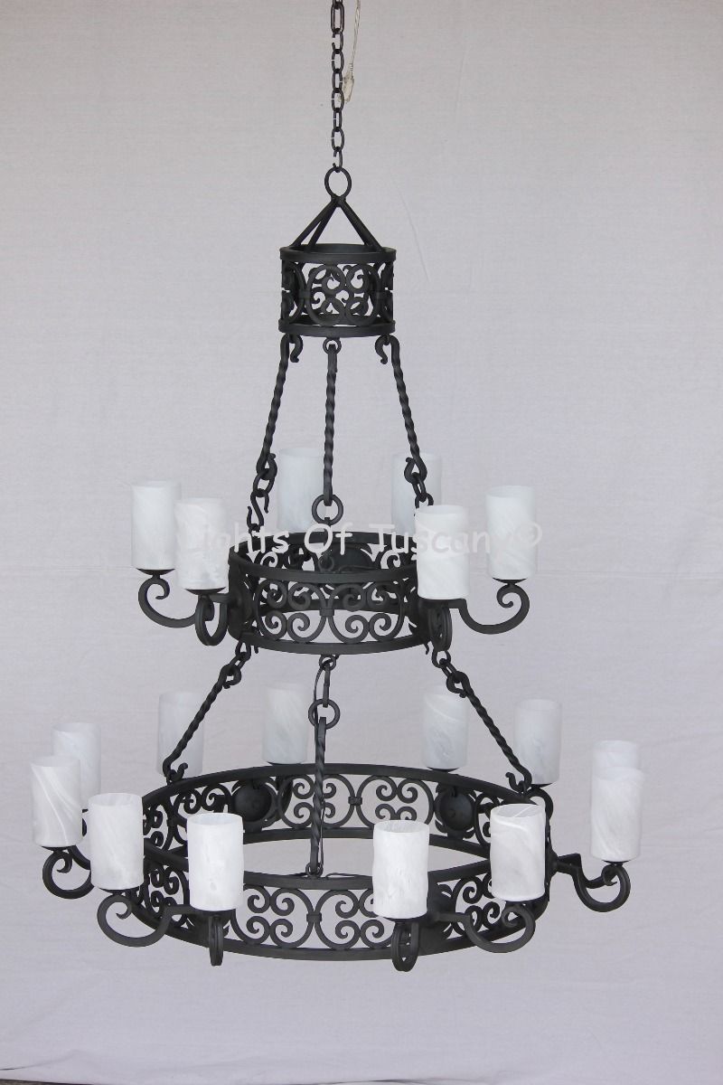 Tuscan chandelier. This two tiered, hand forged, wrought iron Tuscan chandelier will be the focal point of a large entryway or dining hall. Shown here in matte black finish with white glass candles. This is available without the glass candles (SKU 1284-18)