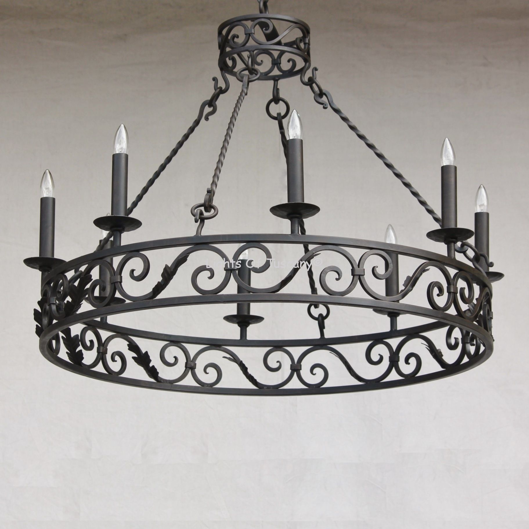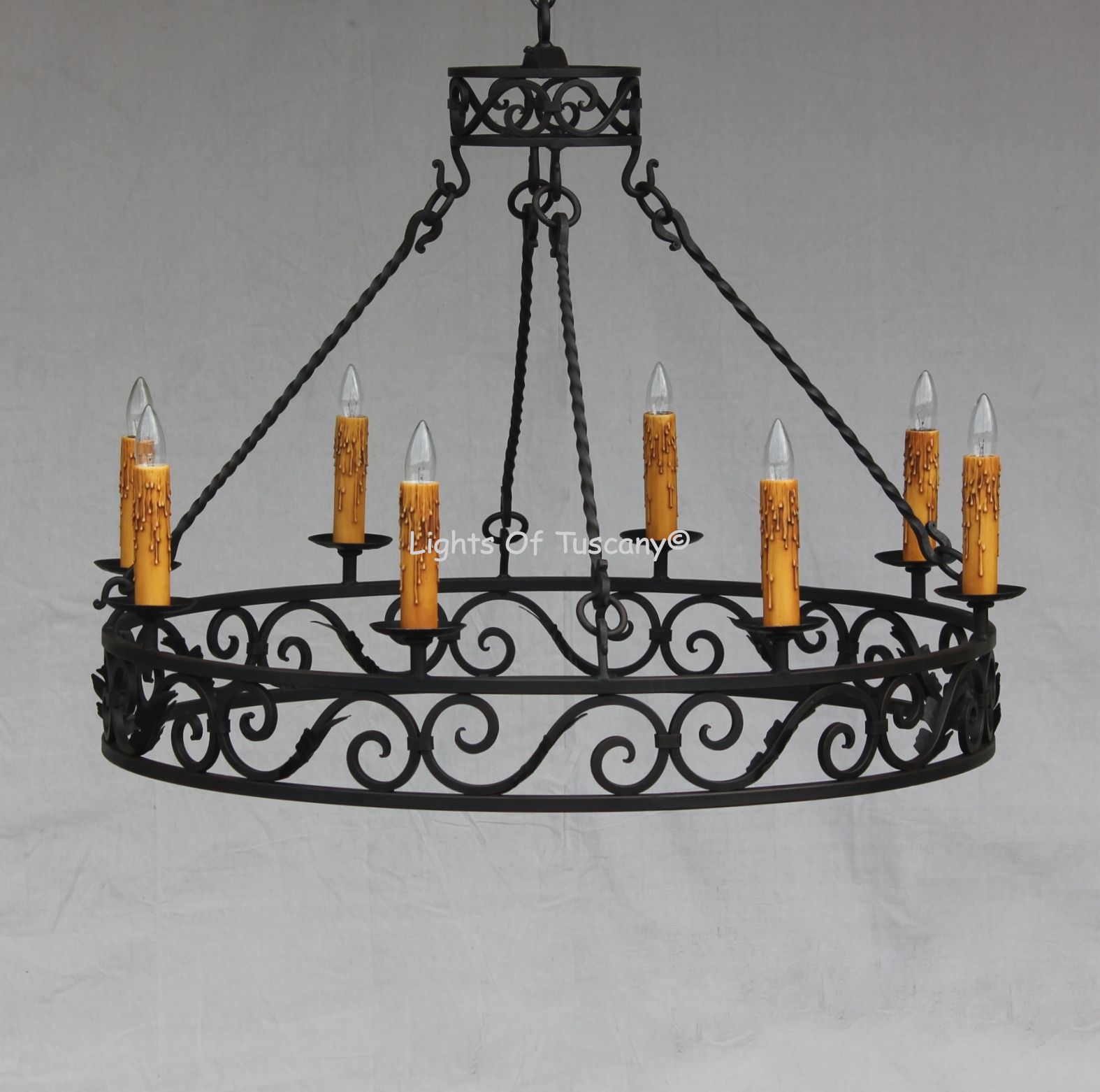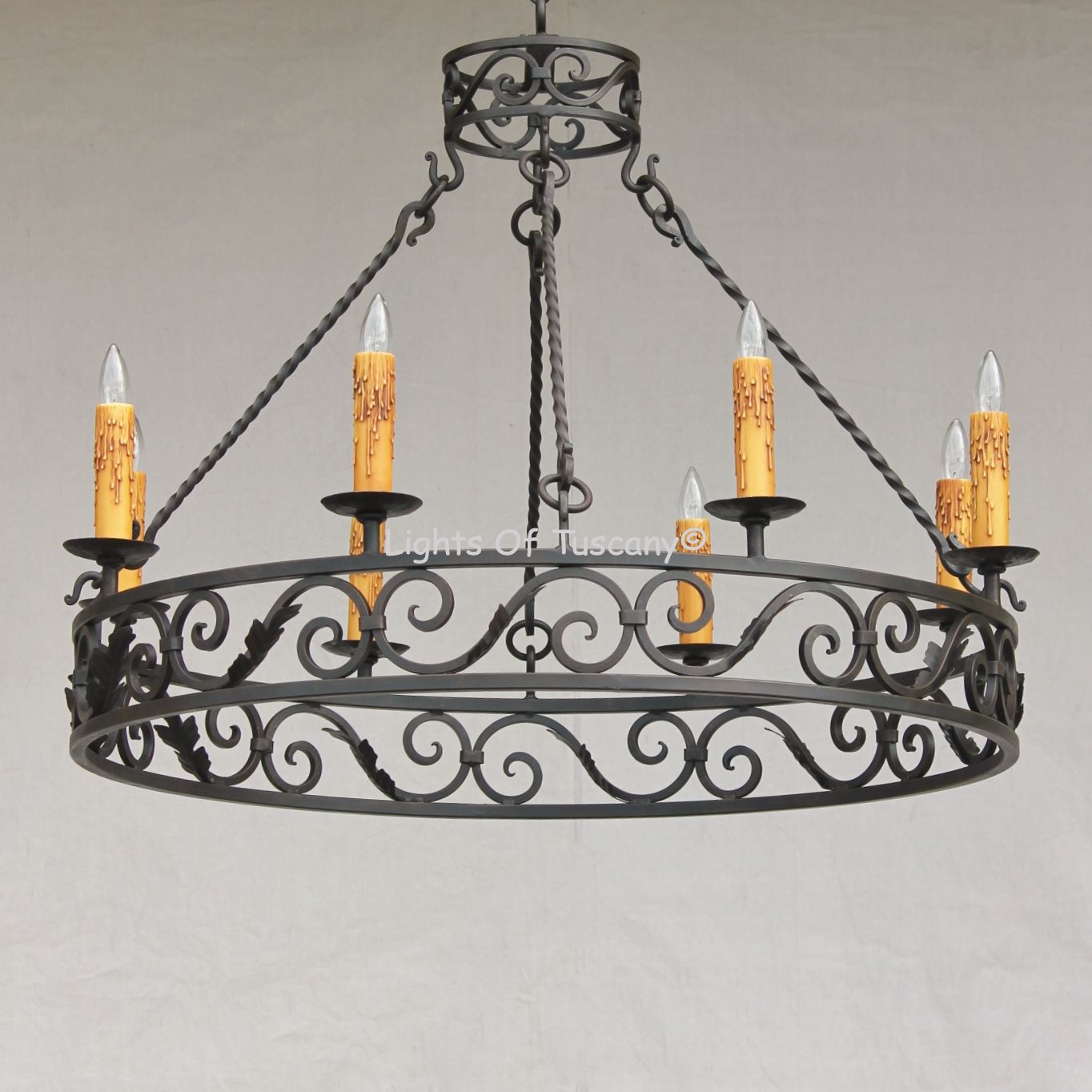 Tuscan Style Chandelier. Authentic Tuscan scrolled chandelier shown here in dark brown finish with faux beeswax candles.