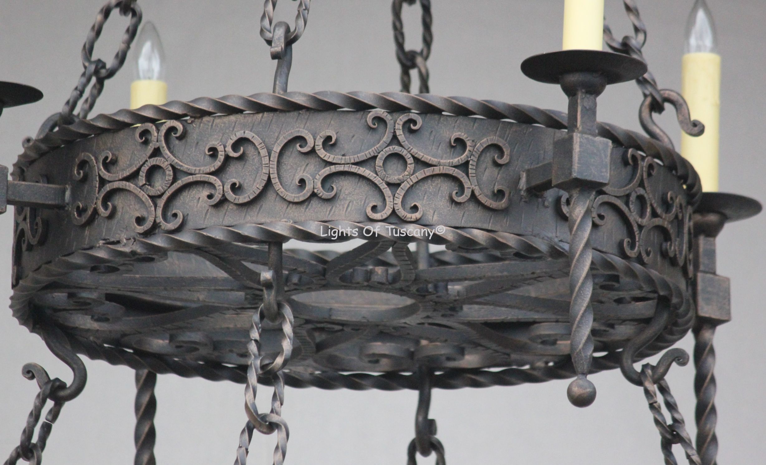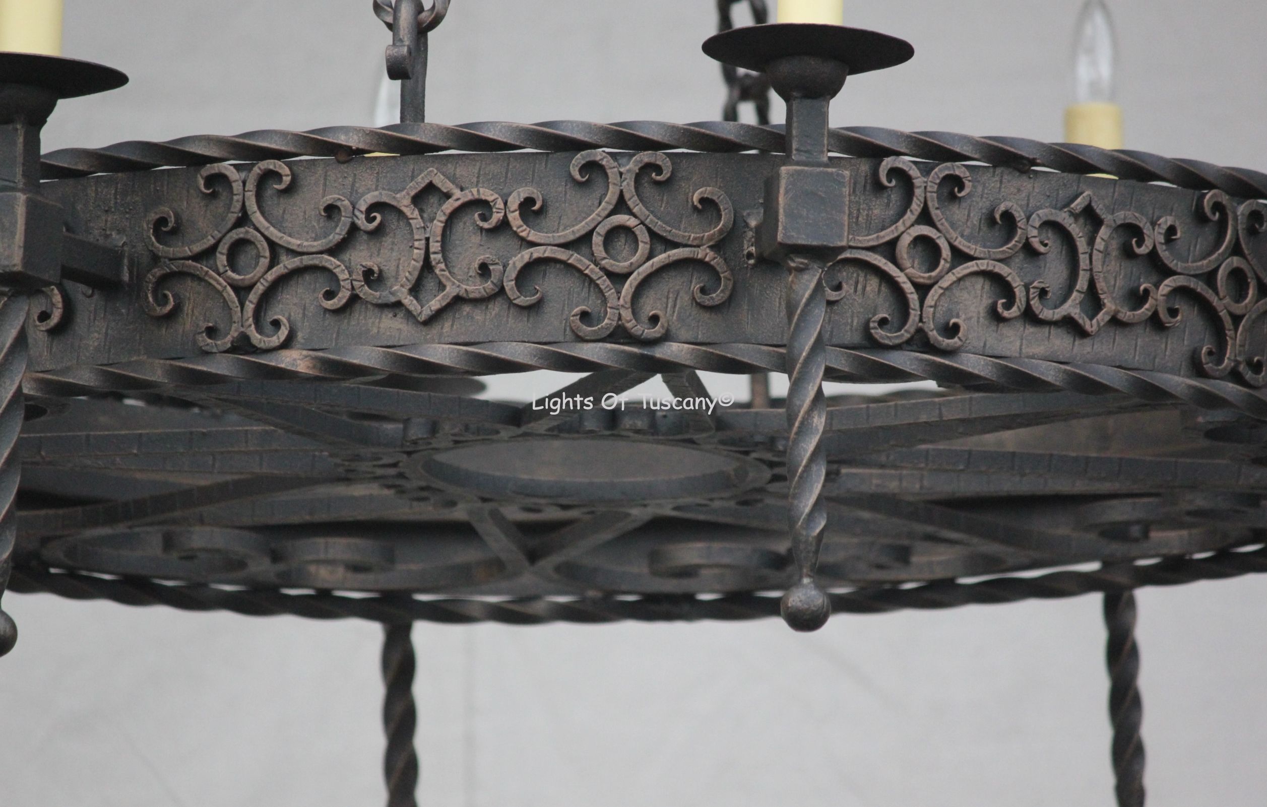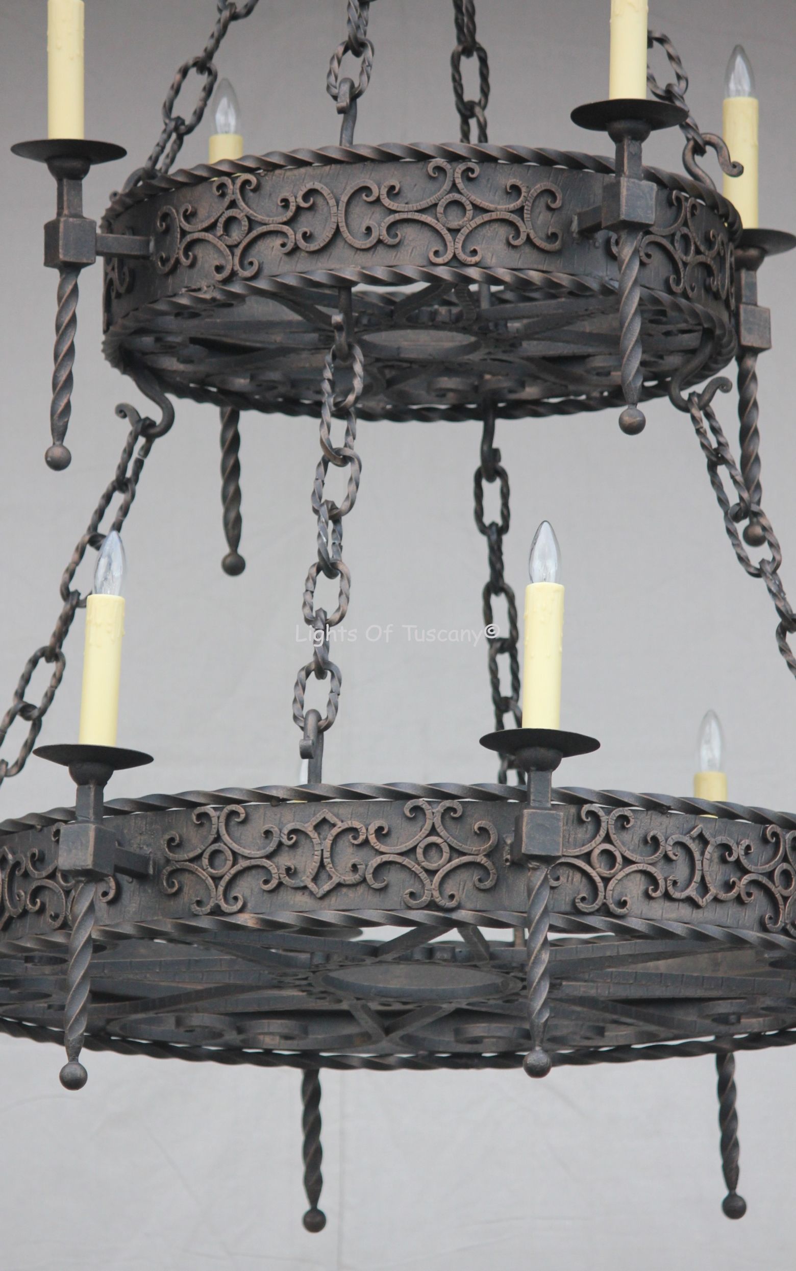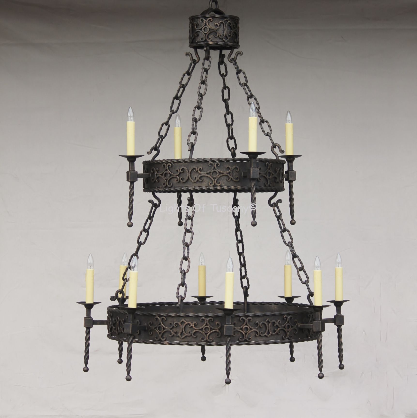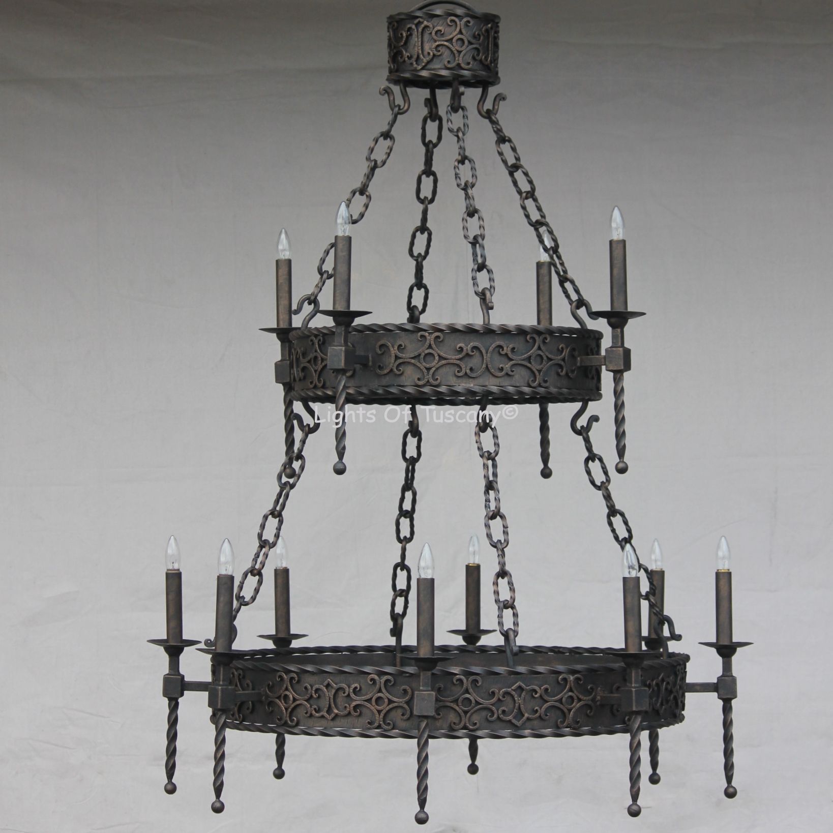 Spanish Style Wrought Iron Chandelier. Height: 56" Width: 48" Uses 12 candelabra base E12 LED light bulbs, 7W/60W equivalent, dimmable, bulbs not included. Weight: 150 lbs. This Chandelier is available in many finishes, candle, and glass options. Custom sizes available.