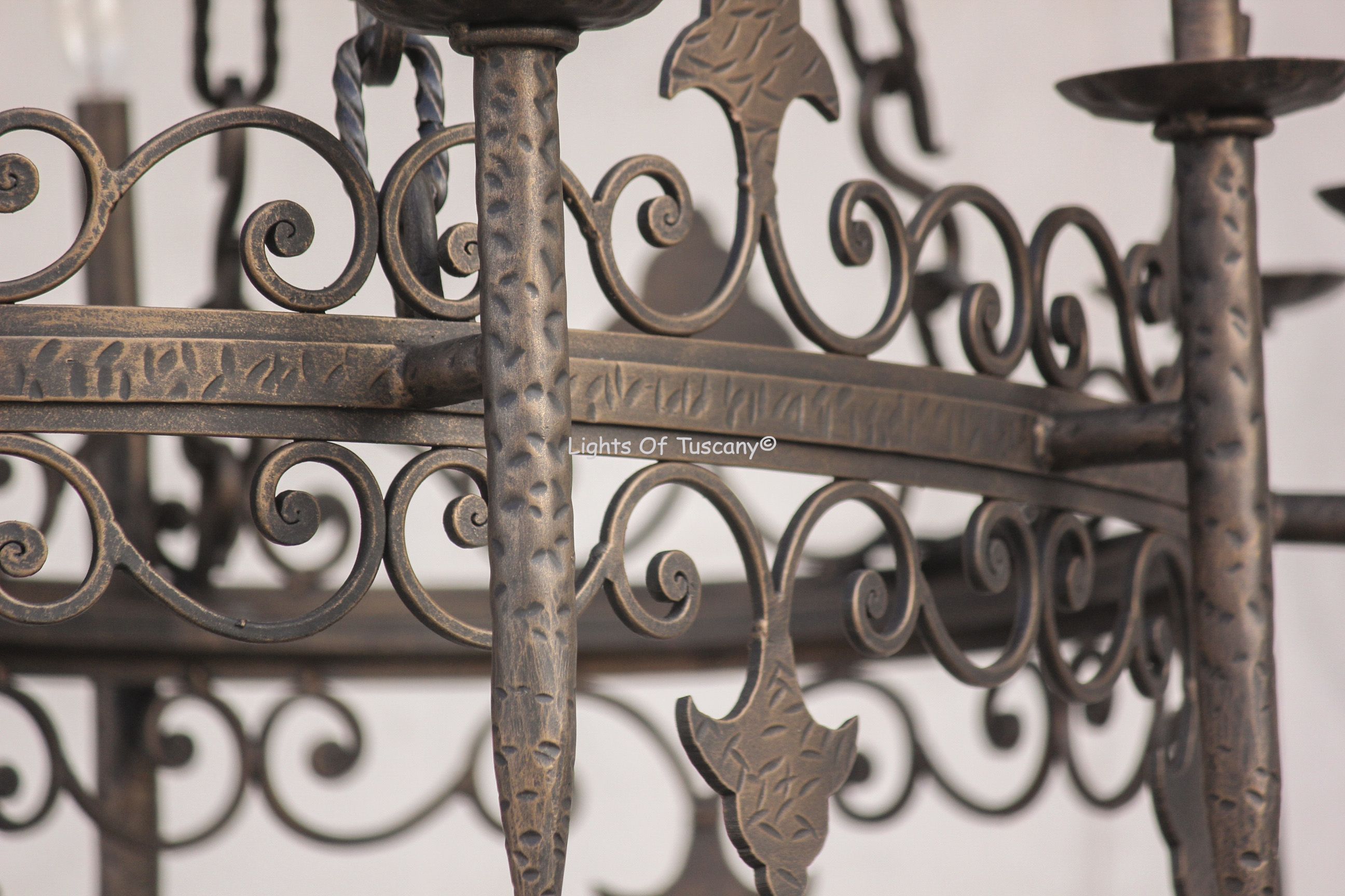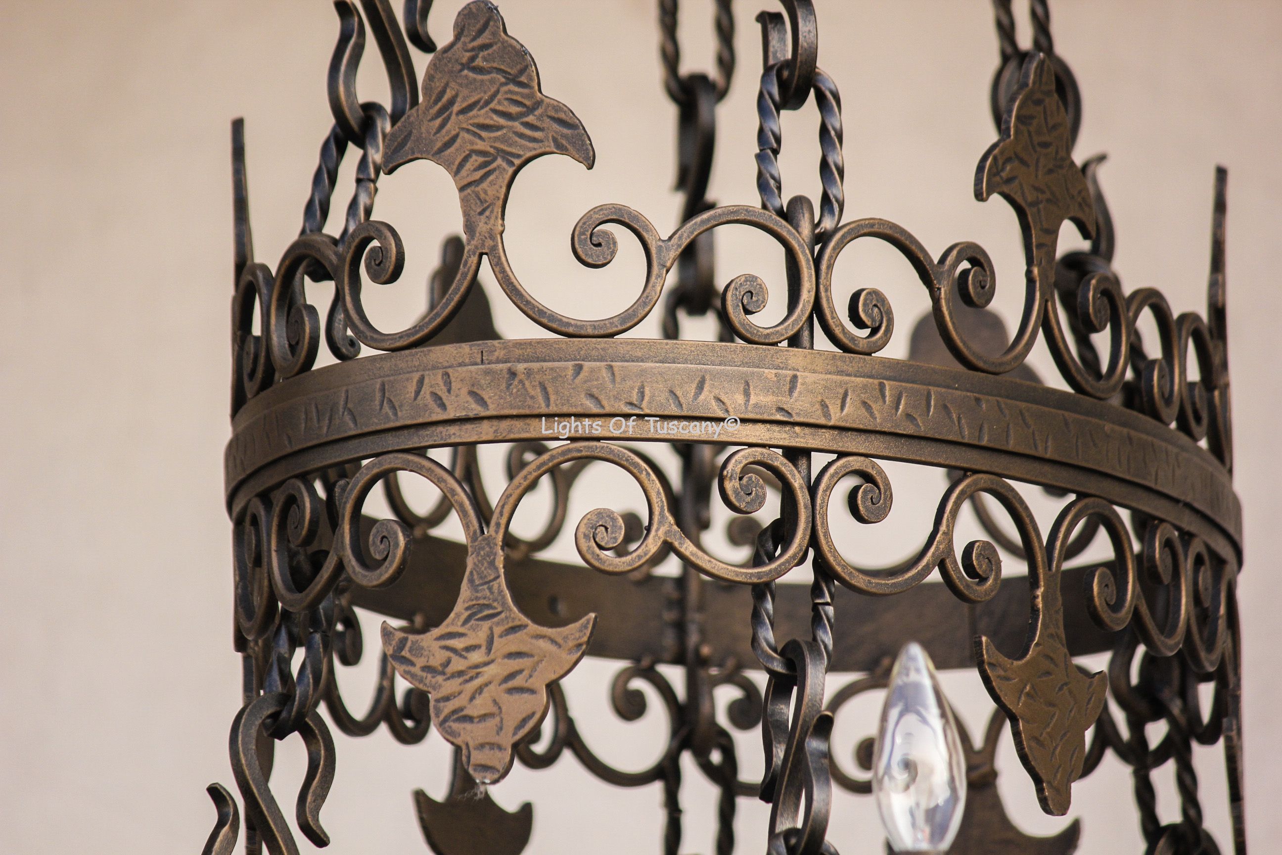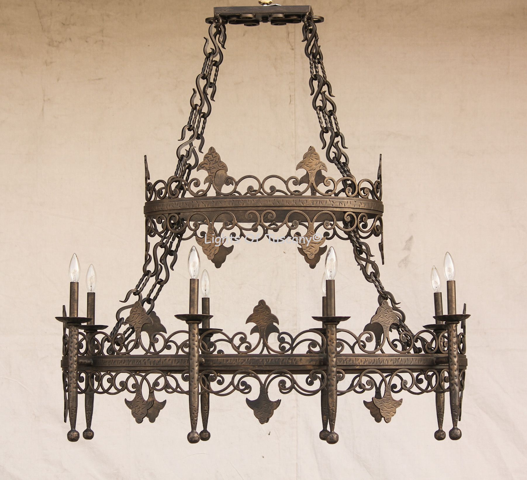 Wrought iron oval chandelier that has been distressed by being hand hammered. Hand cut details and delicate scrolls create an elegant design. Suitable above long dining room tables or kitchen islands, can also be used as a Spanish style pot rack.