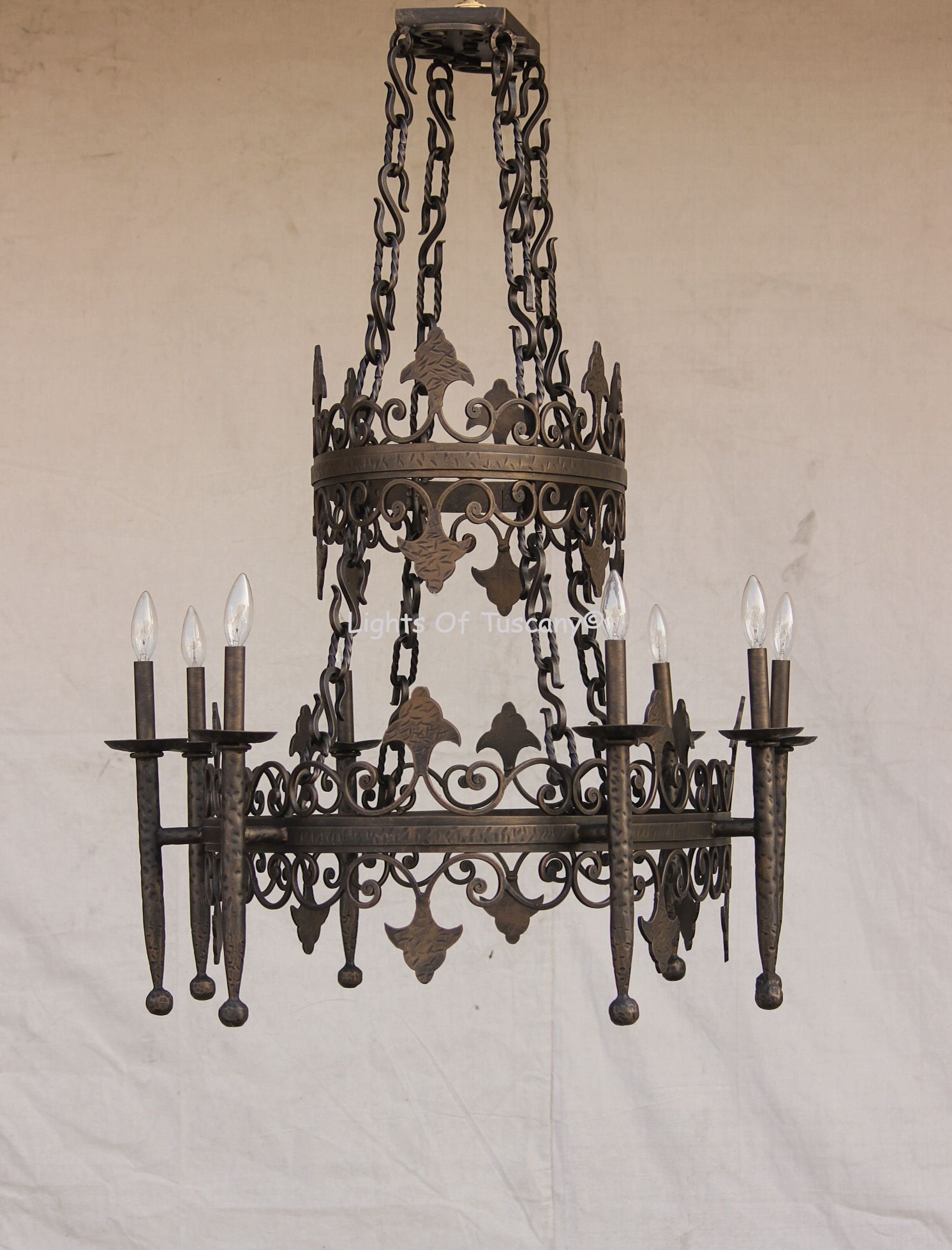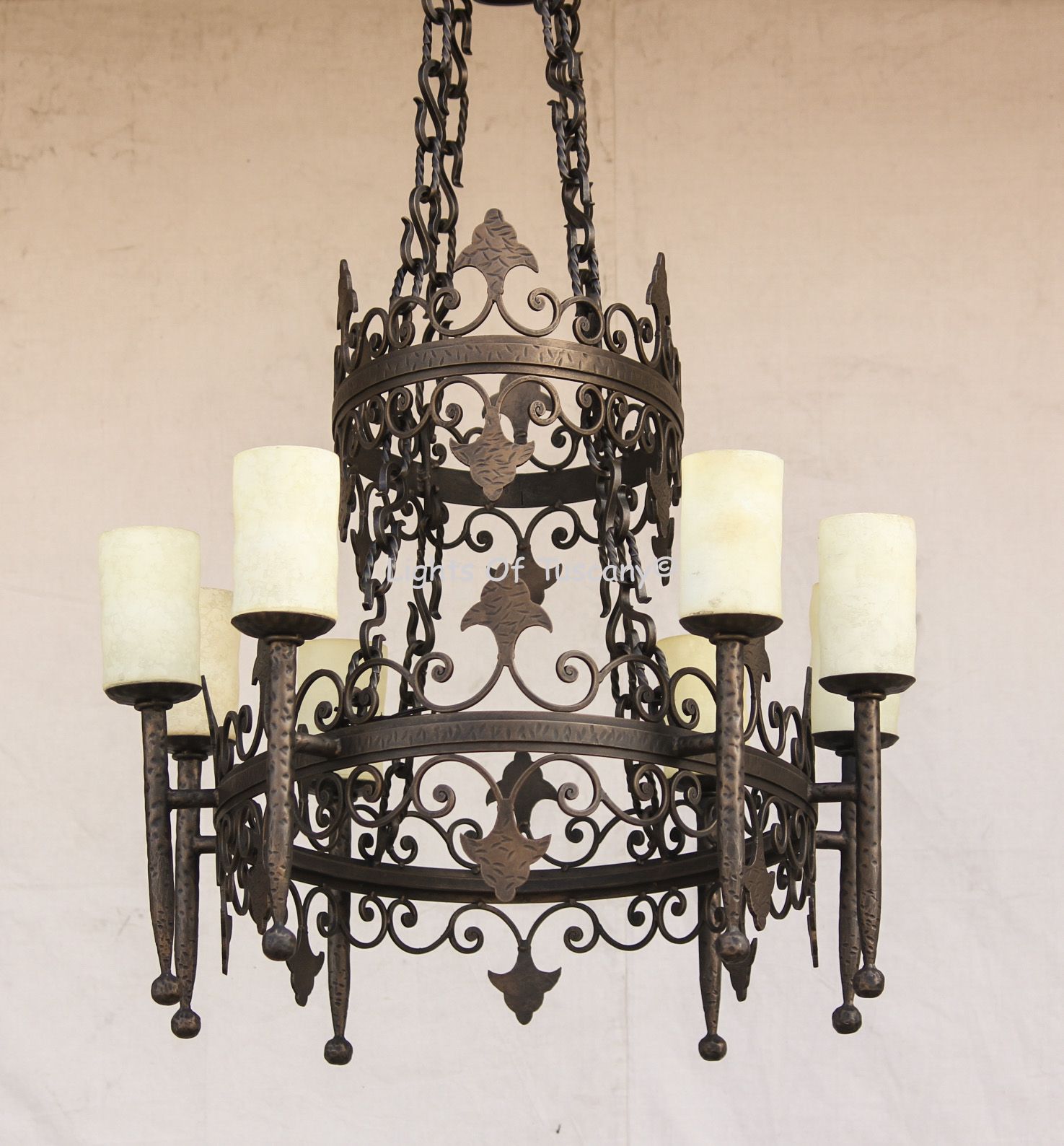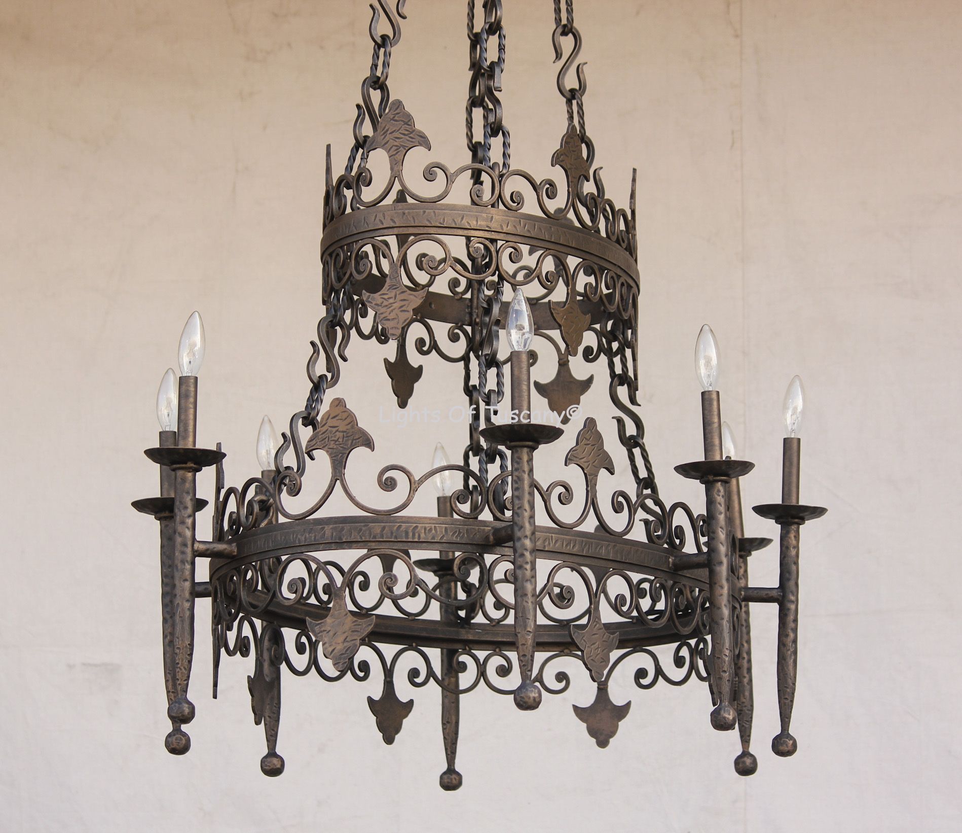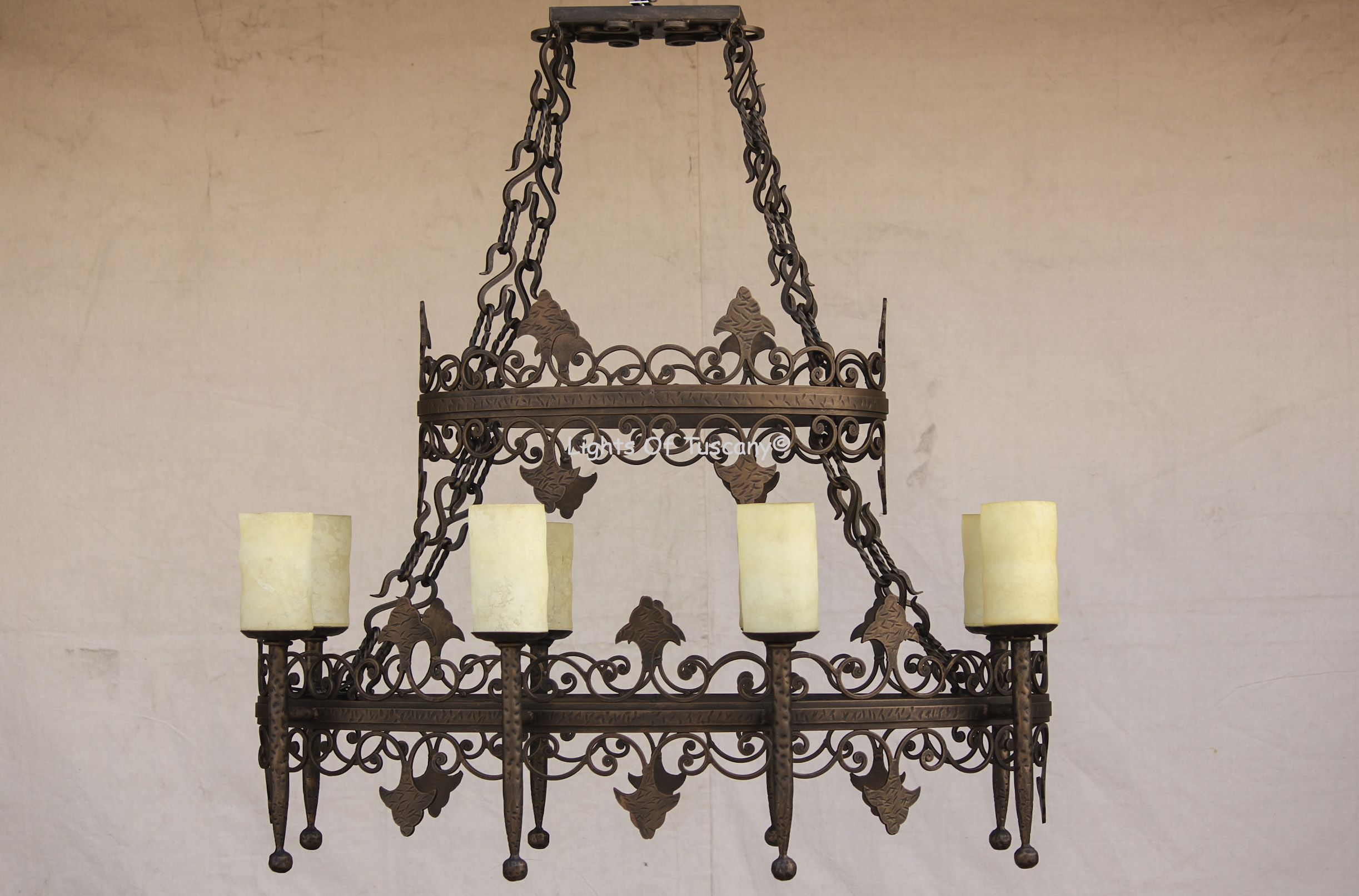 Wrought iron oval chandelier that has been distressed by being hand hammered. Hand cut details and delicate scrolls create an elegant design. Suitable above long dining room tables or kitchen islands, can also be used as a Spanish style pot rack.