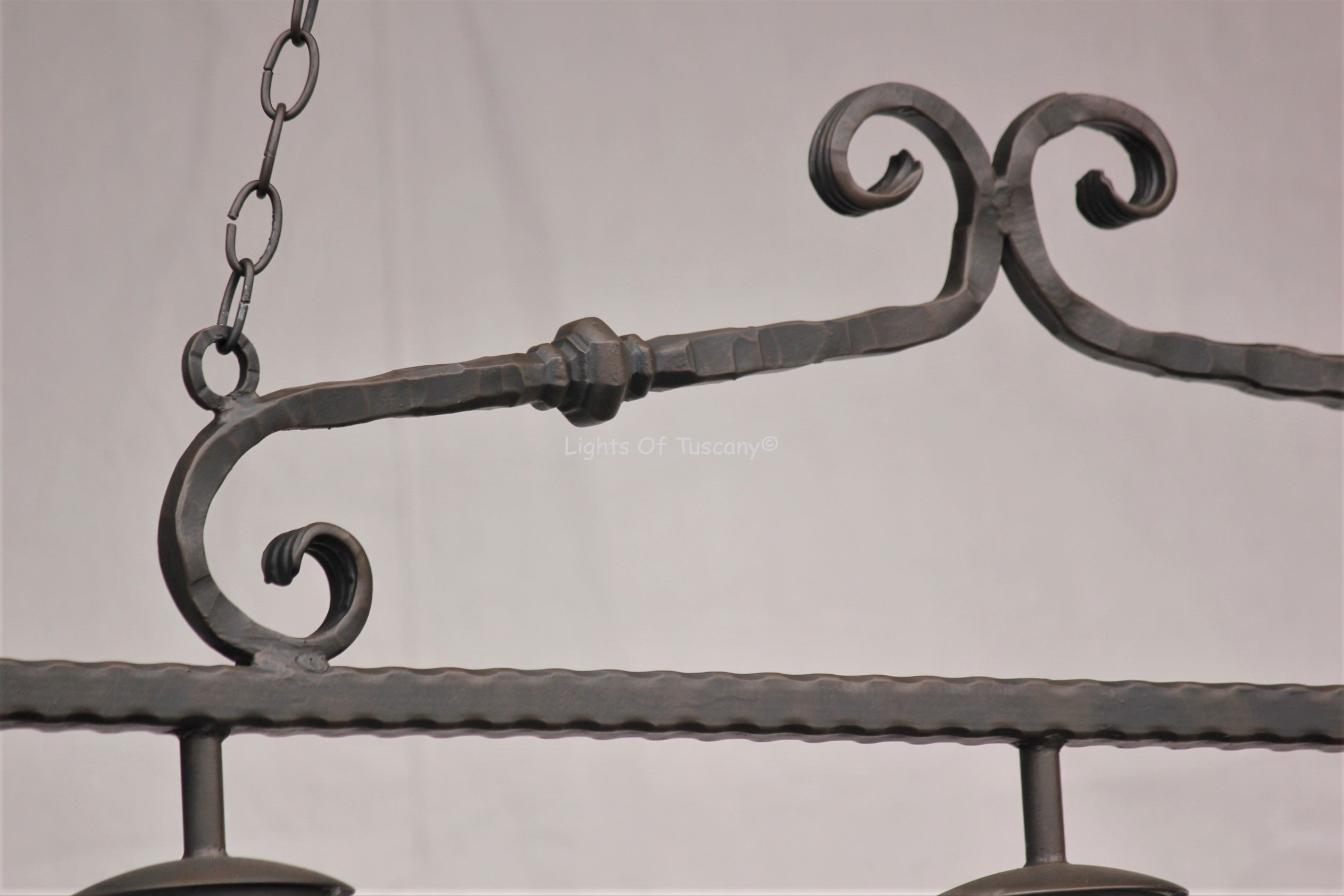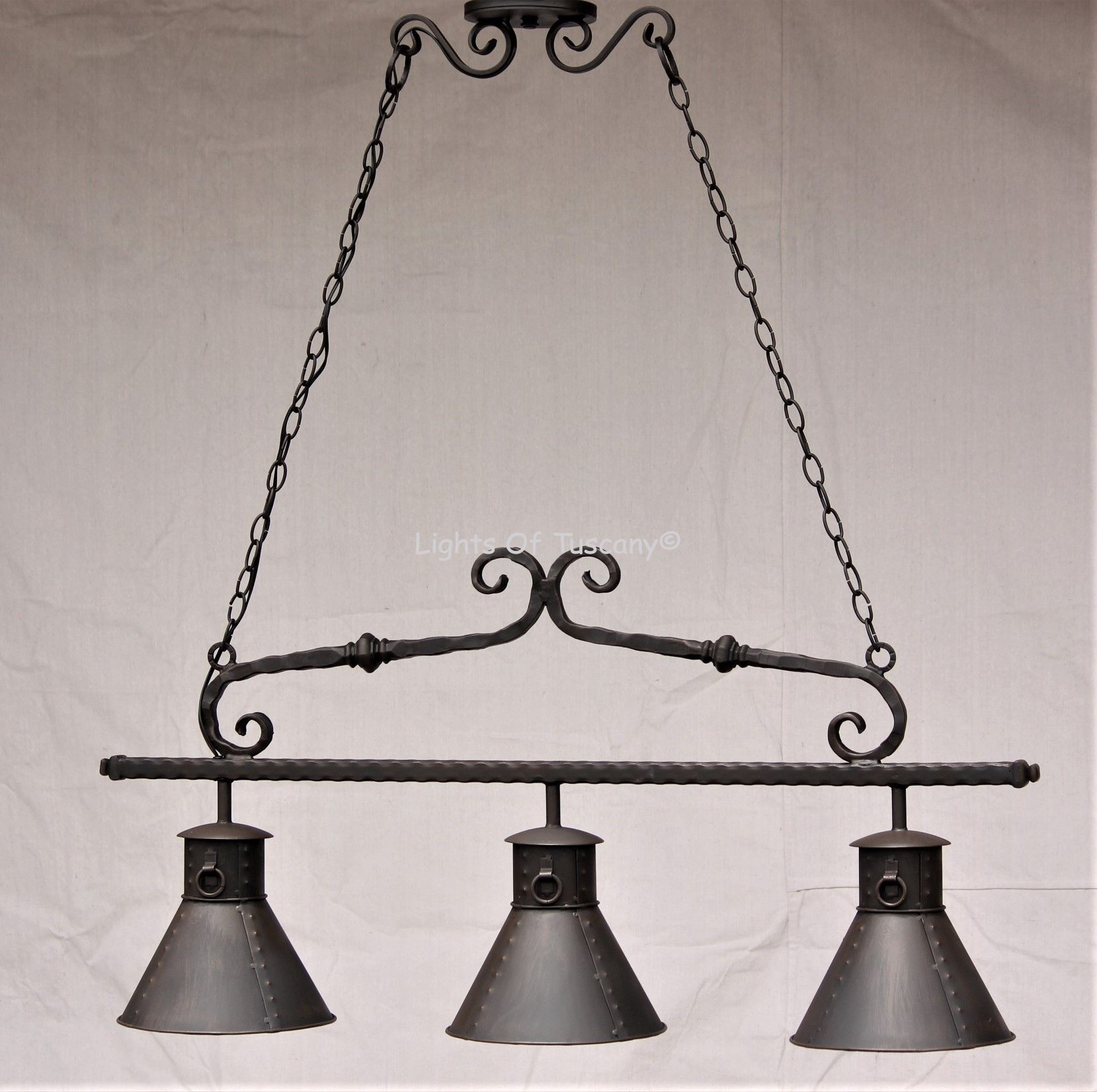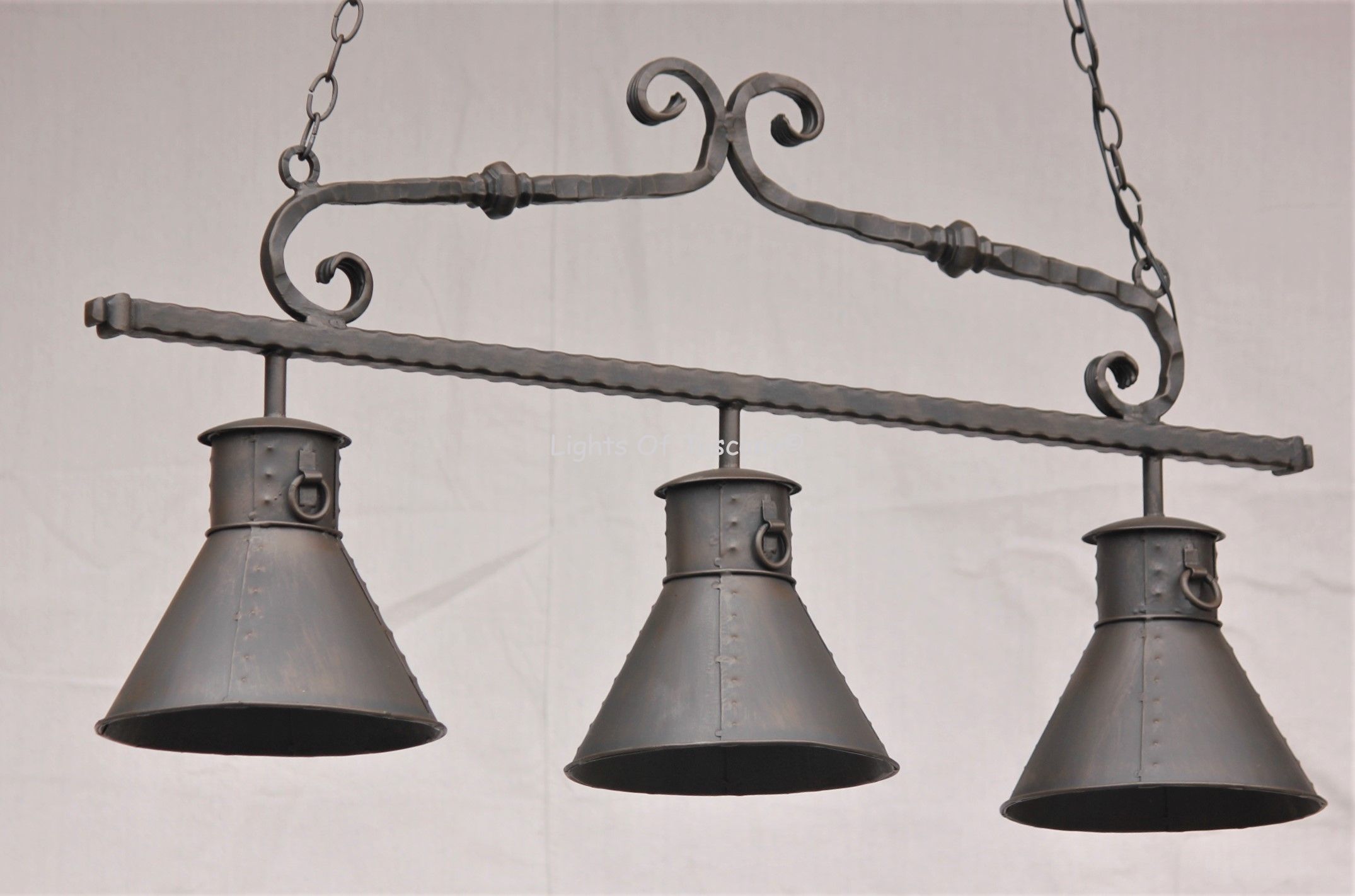 Hand forged wrought iron bell shade Italian Rustic Country Hanging Light. Perfect for over the pool table, kitchen nook, island, living room, bars and dining rooms.