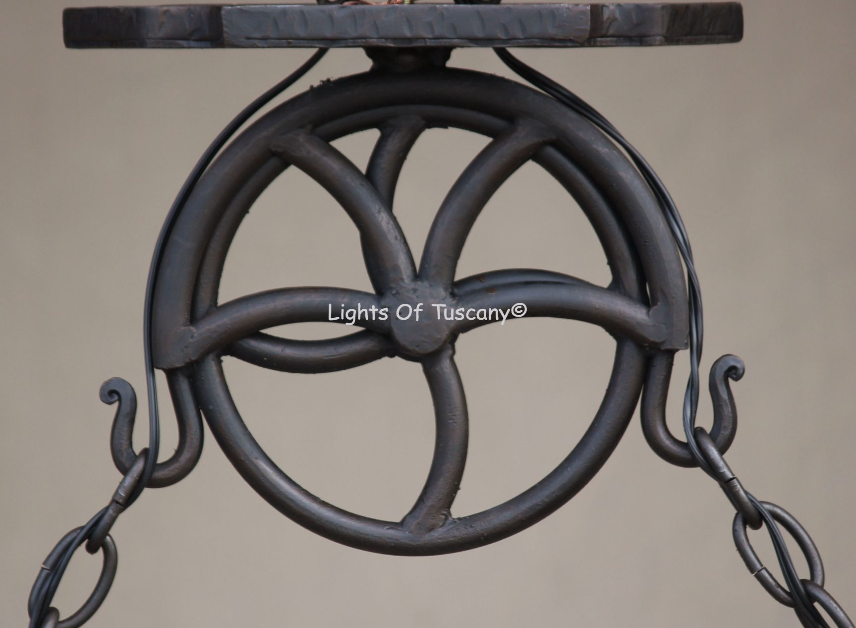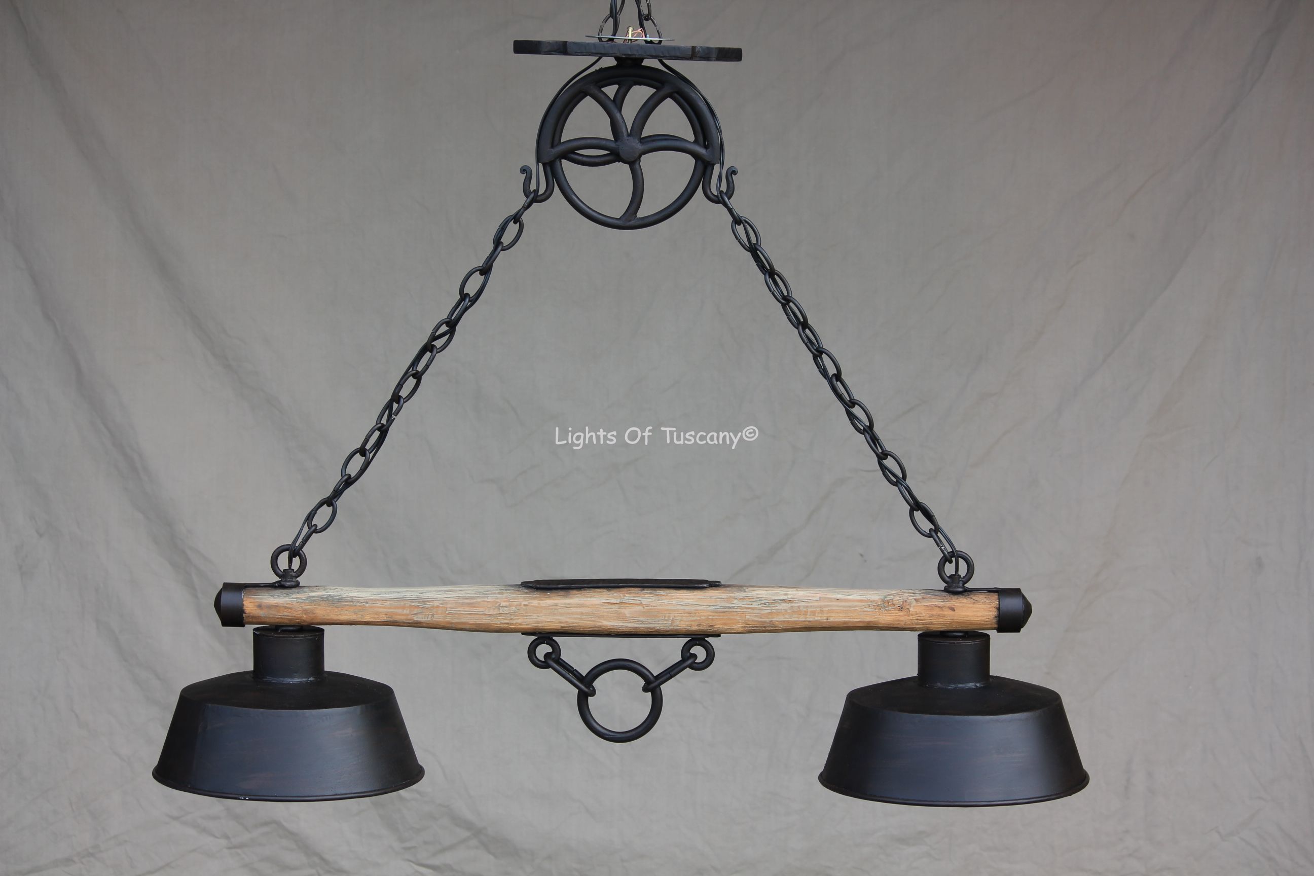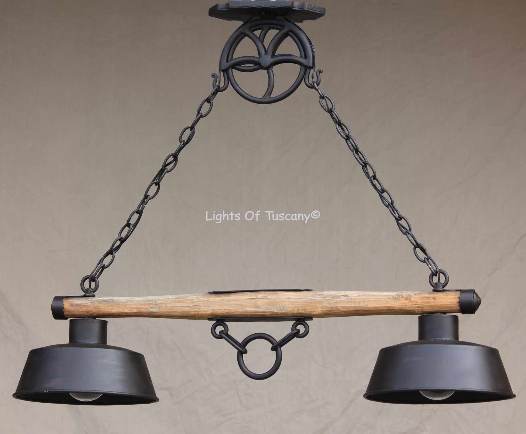 Tuscan country wooden rustic chandelier. Suitable for a kitchen island or a cabin. Shown in Natural wood and dark brown metal finish. Made from Hand forged wrought Iron.