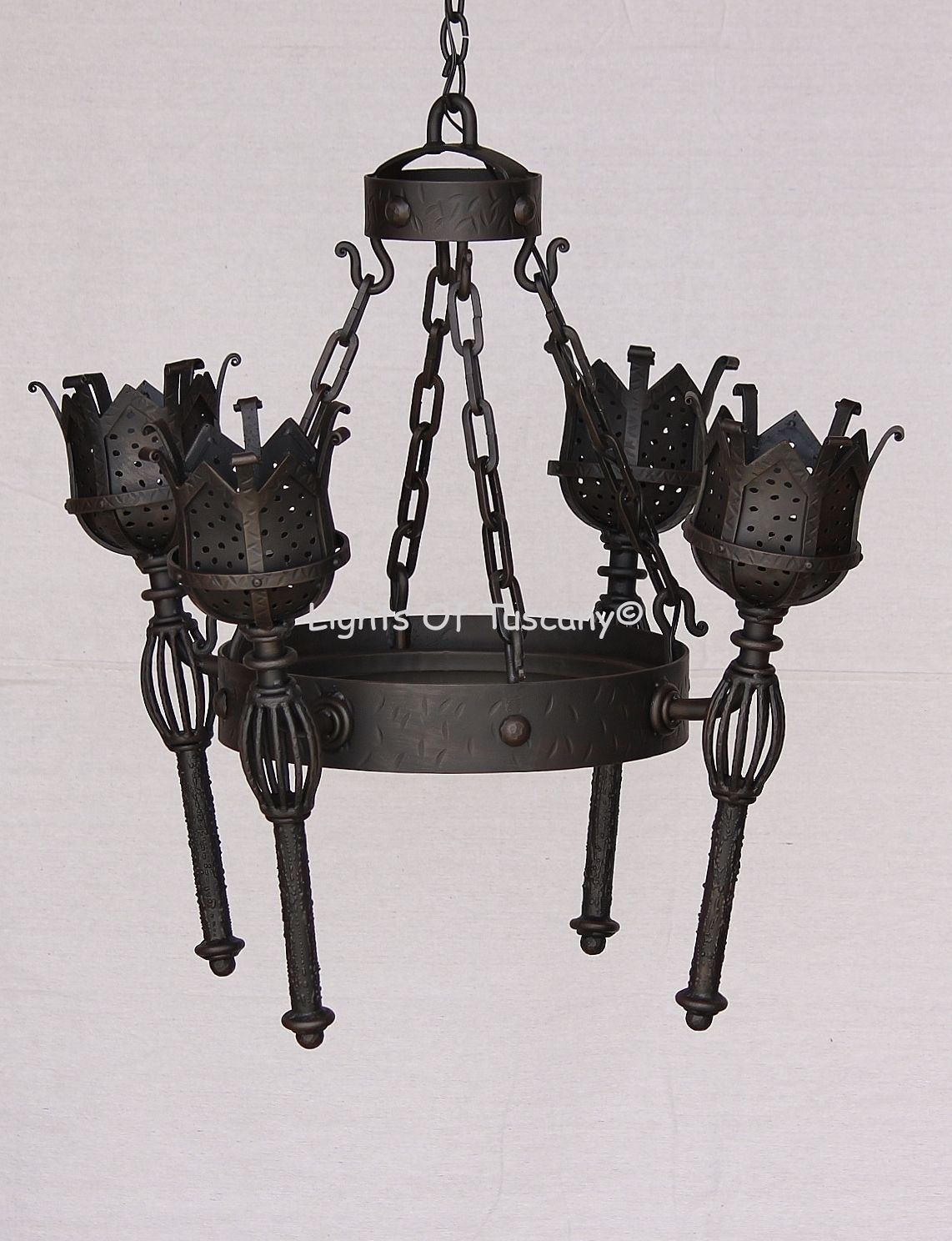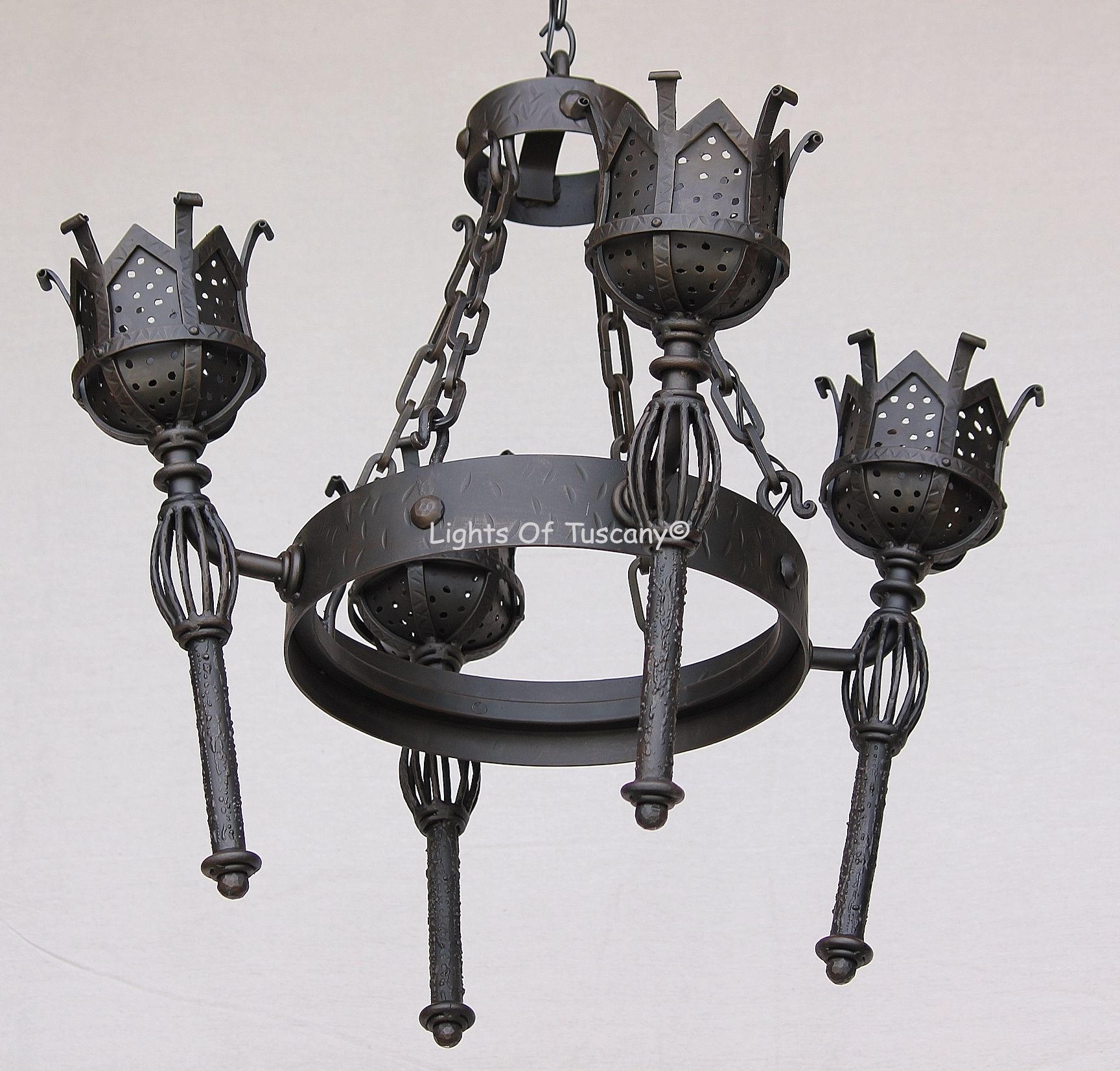 Heavy gauge Gothic Torch Chandelier. Hand forged wrought iron with hammered look. Ideal for a medieval / Castle look. The height can be adjusted by adding or removing chain. It is 33" wide, 31" high and approximately 35 lb. Can be ordered in larger sizes. Shown in our Dark brown finish. Available in all our finishes in our option section. Can be ordered in the outdoor version.