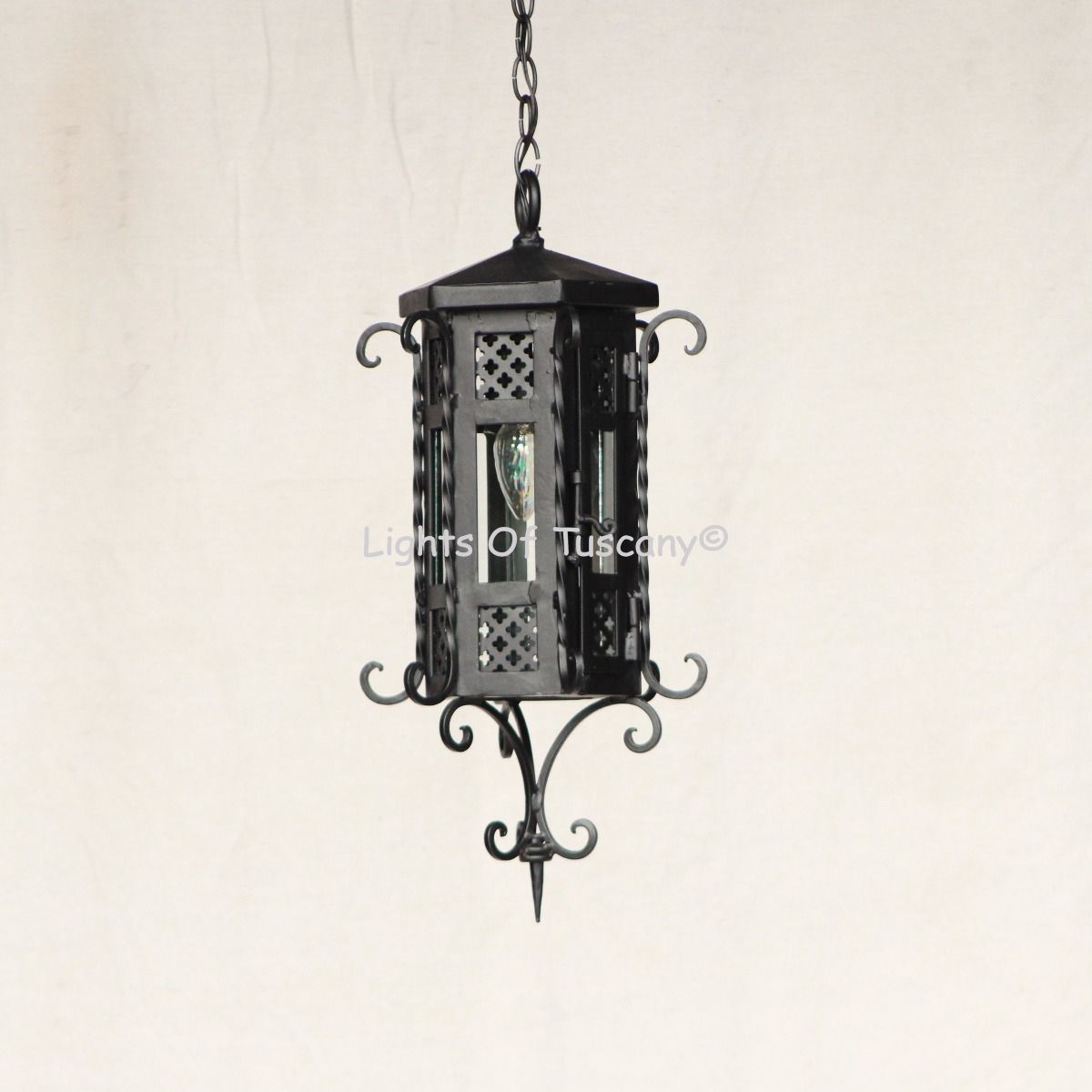 This beautiful hanging light is authentic hand forged wrought iron. Decorated with beautiful hand made iron accents. This fixture is perfect for entryways, dining room, over kitchen islands, outdoor covered areas (dry/damp rated locations), and any living space. Made to order in your choice finish and additional available options at check out.