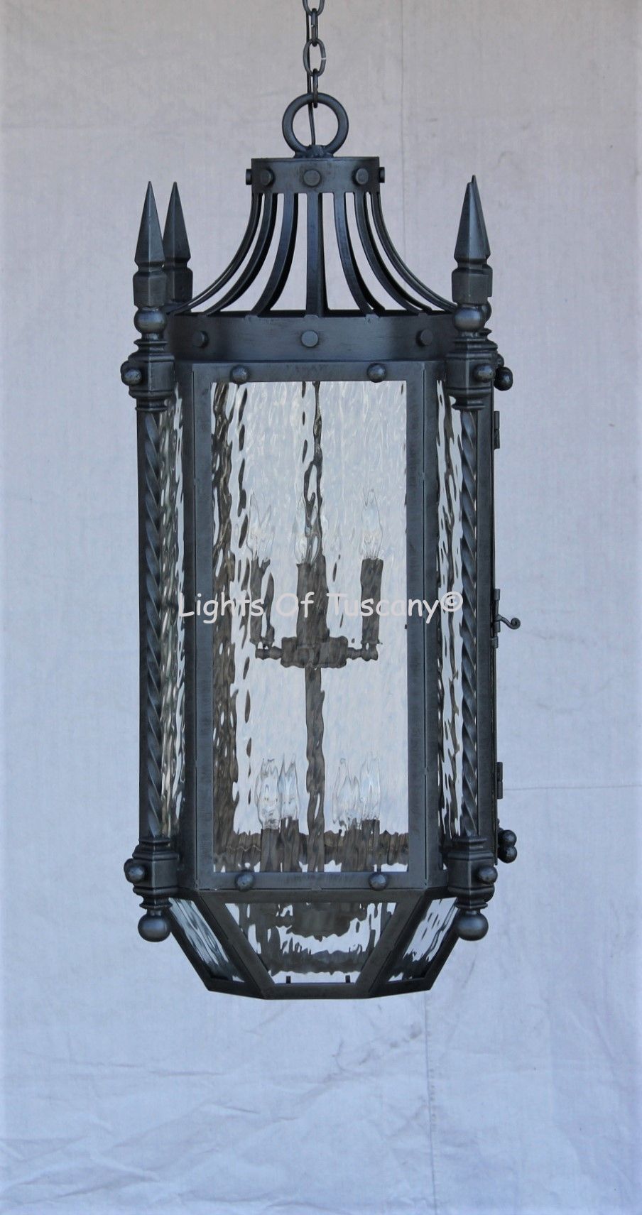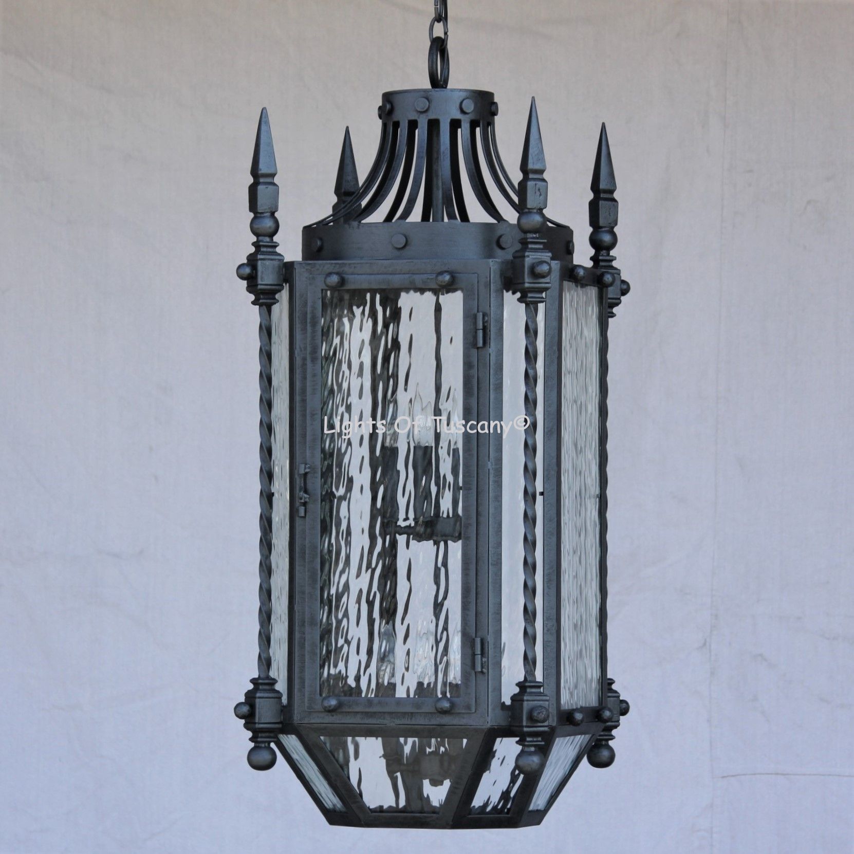 Hand forged wrought iron Gothic Medieval Style Hanging Lantern. Perfect for entryway, living room, bedroom, vanity, and closets.