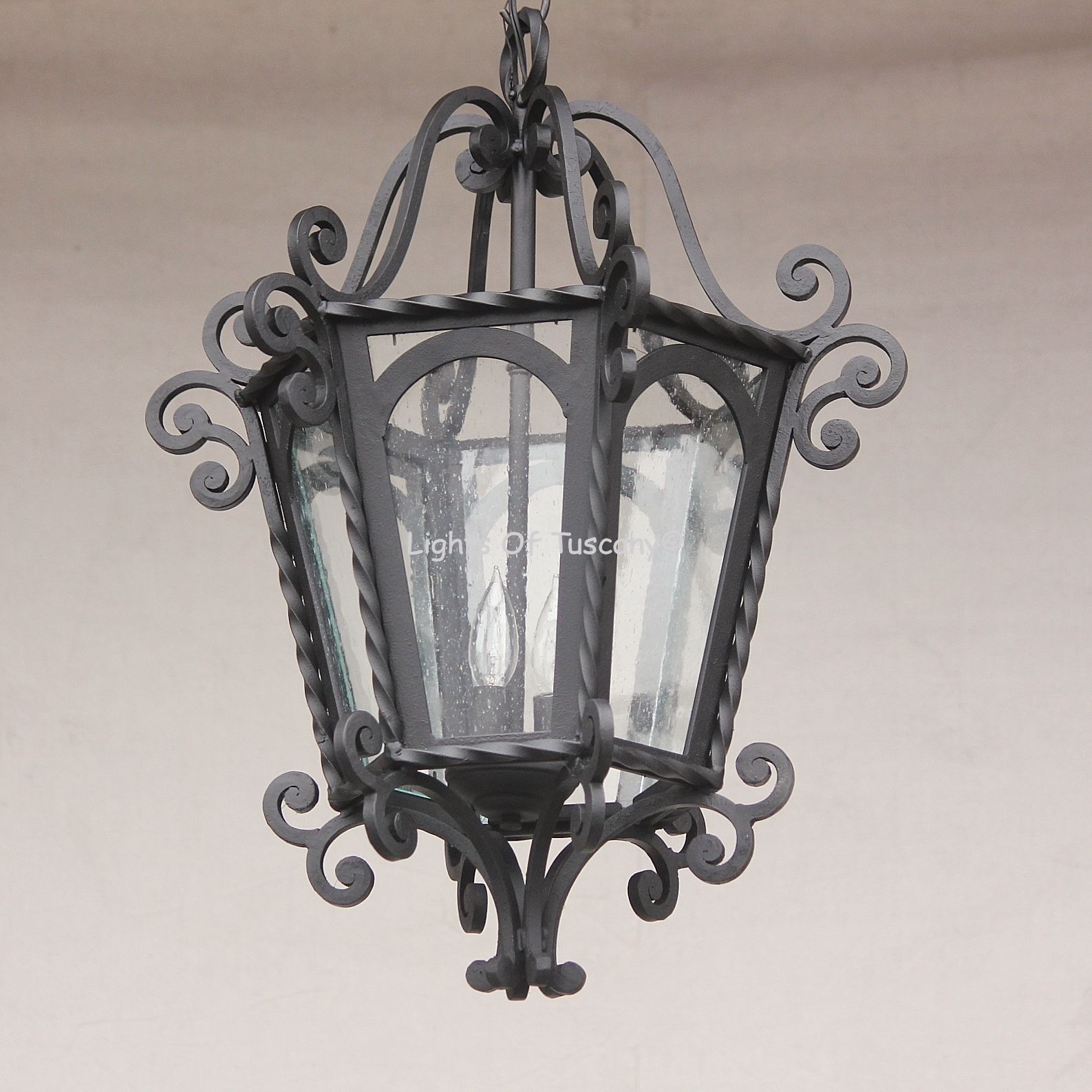 Beautiful authentic hand forged wrought iron lighting fixture. This large outdoor hanging fixture is decorated with scroll designs and twisted iron to give it a Spanish/Mediterranean style look. Can be ordered closed on top for outdoor wet location. Available in different sizes and also matching wall and post light for a matching whole home design. Available in your selection of finish options.