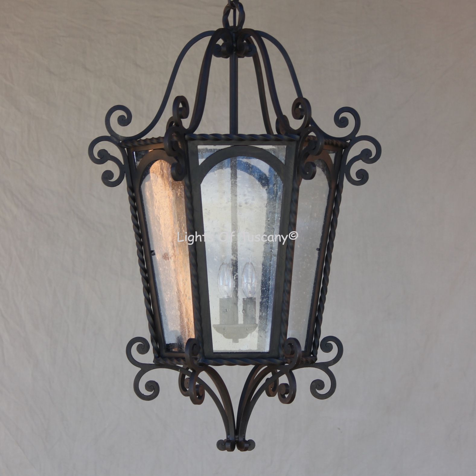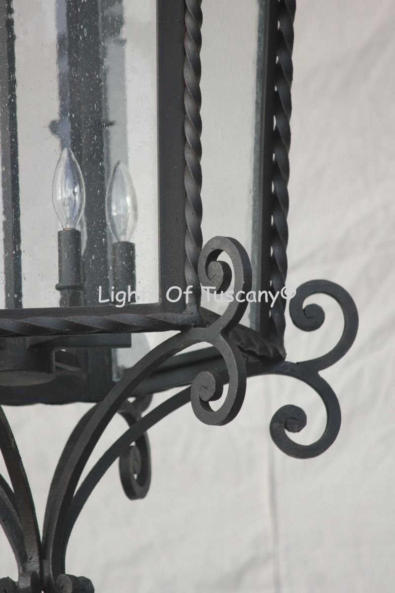 Beautiful authentic hand forged wrought iron lighting fixture. Available in other sizes and in wall light and post light for a matching whole home design.