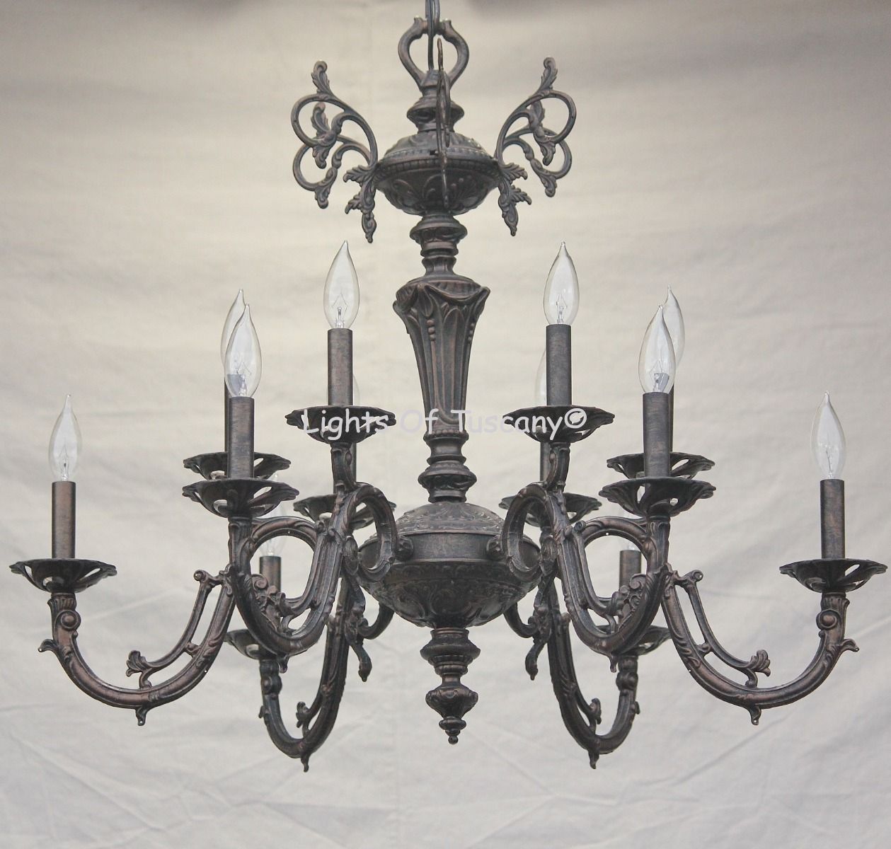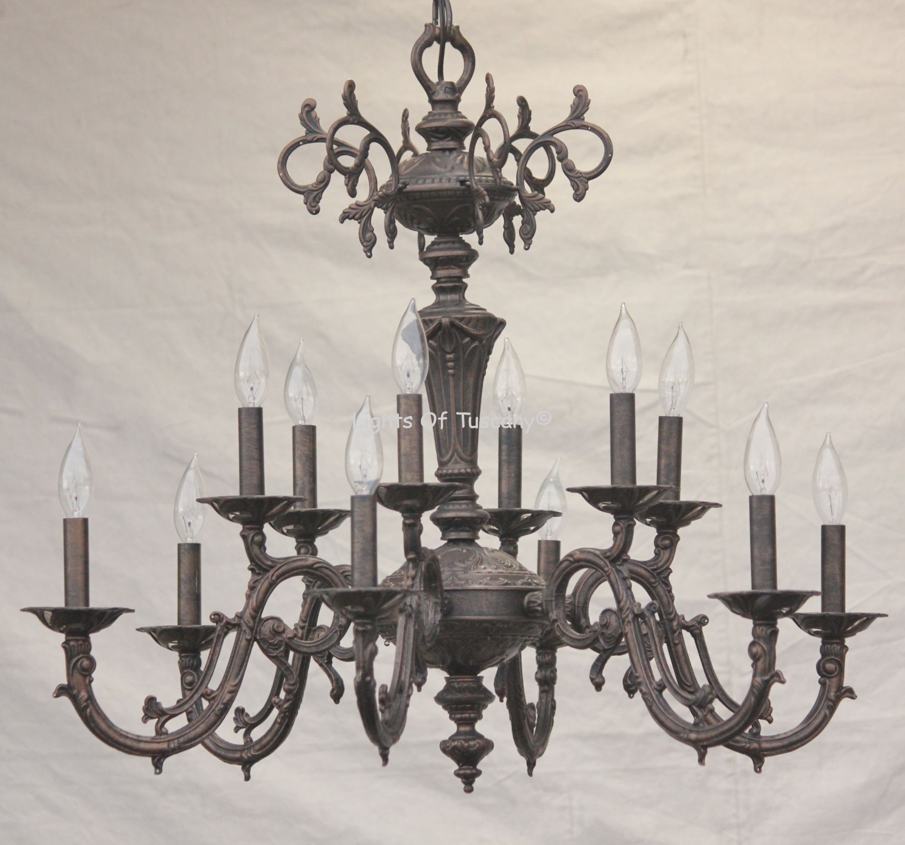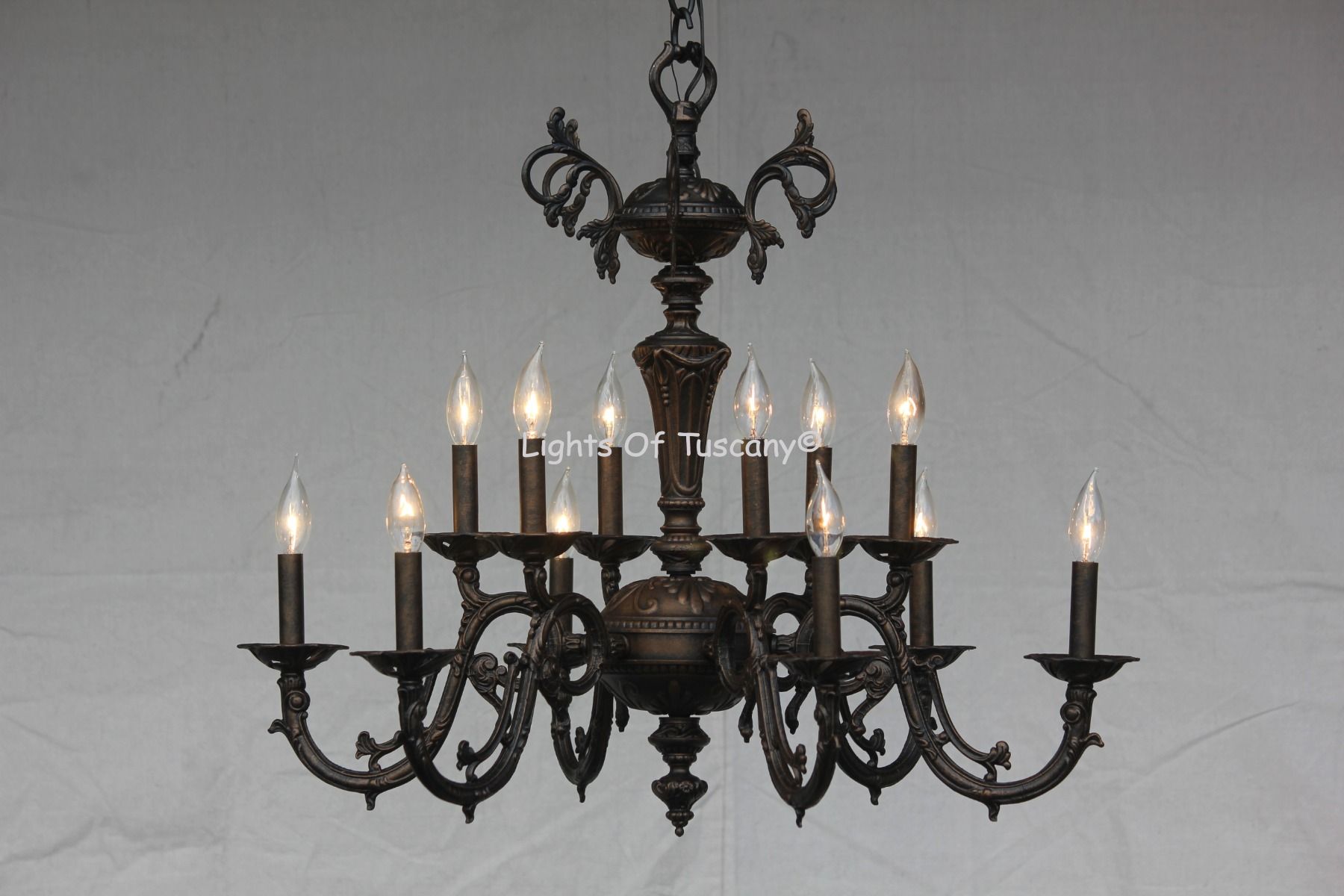 This Vintage look is seen with Antique Bronze Finish. Please see our options section for all the Finish colors and Candle choices. Weight 45 LBS ; Dimensions Height: 28" Width: 32” ; Uses 12 candelabra base E12 LED light bulbs, 7W/60W equivalent, dimmable, bulbs not included ; Contact Customer Service at 619-276-5267 to answer other questions