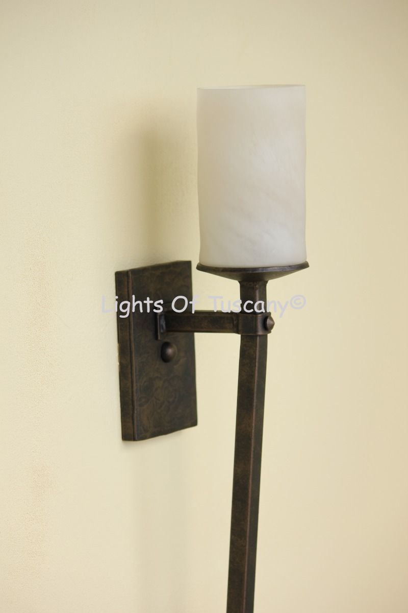 Hand forged wrought iron Rustic Spanish Style Spear Torch Light with Glass Candle. Simple spear/torch style with bolt accents and double back plate secures to your wall. This fixture is perfect for hallways, or entryways. Available with a glass candle cover, please inquire when ordering. Shown in matte black finish with standard candle.