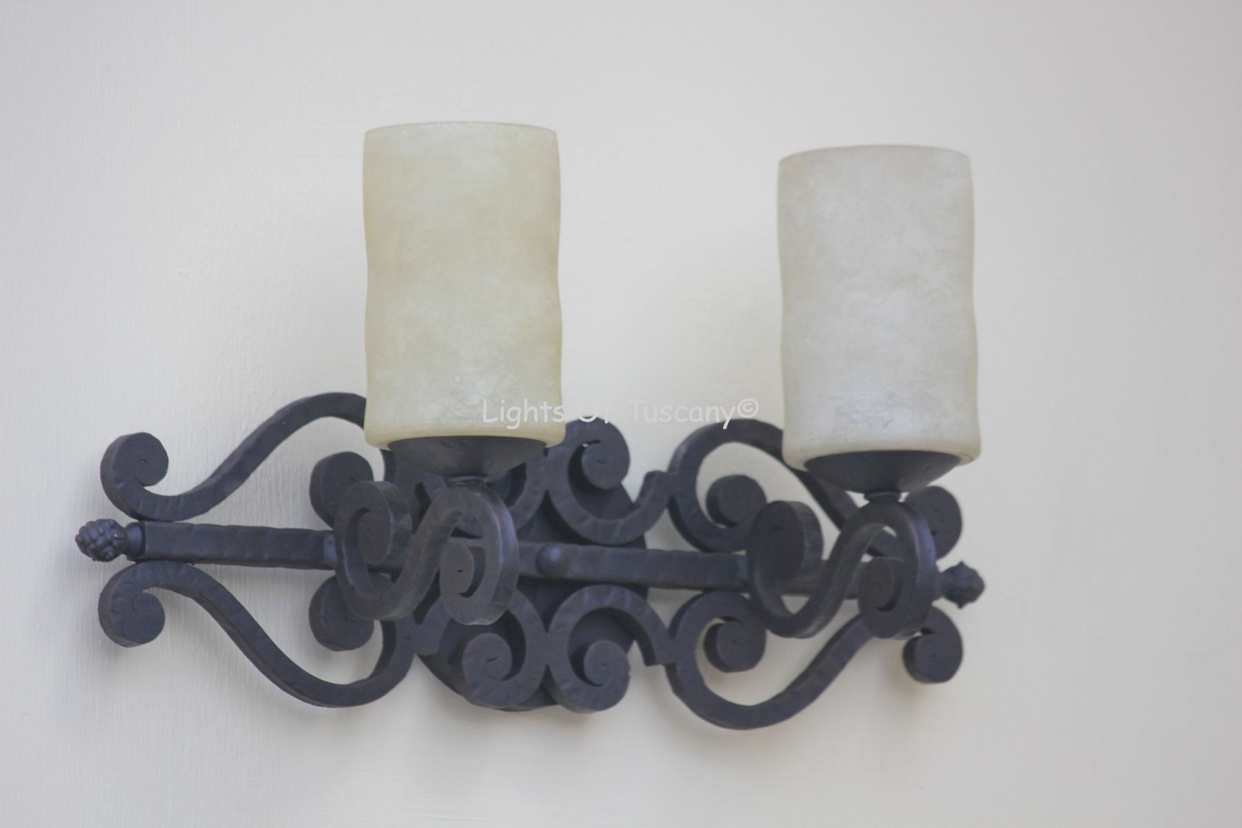 Hand forged wrought iron two bar bath light. Various color and glass options available.