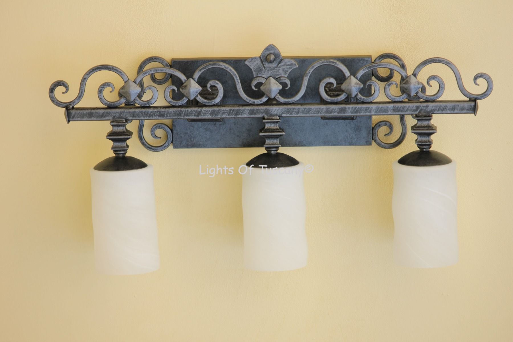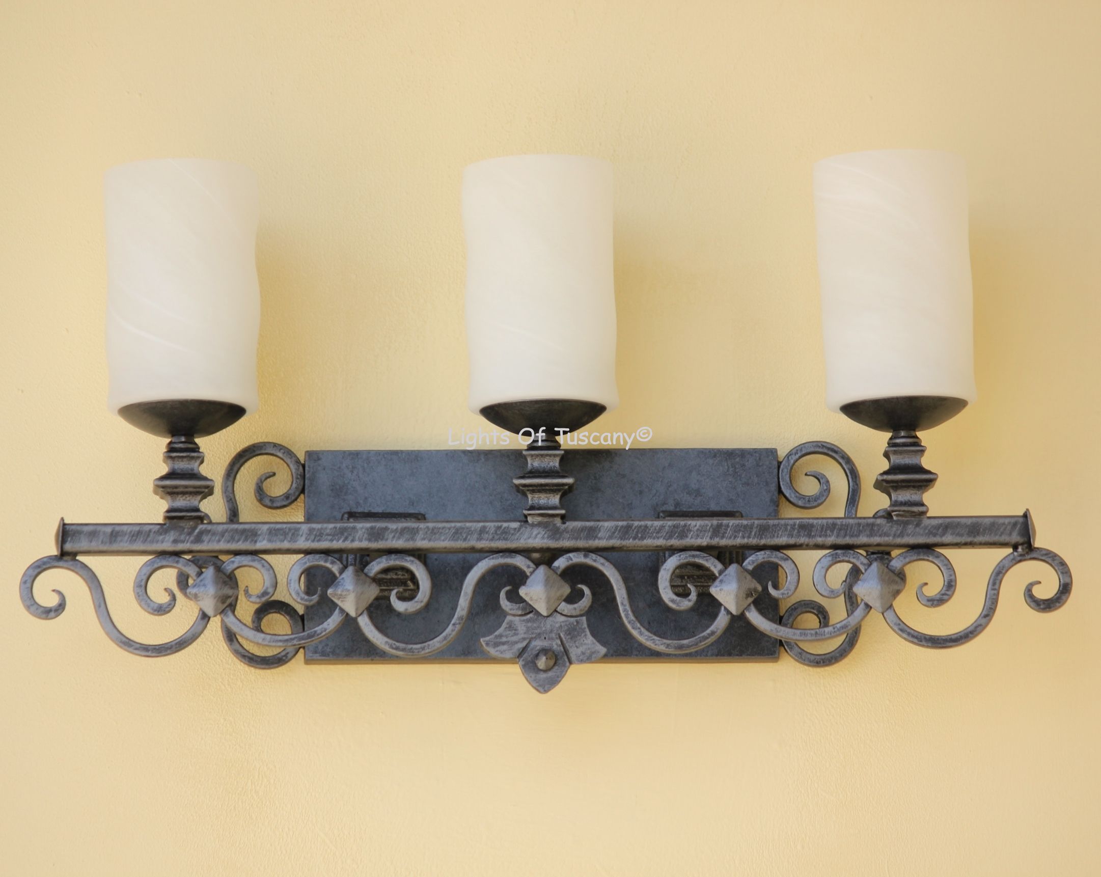 Mediterranean Style vanity bath bar light. Can be installed face down or up. Shown in old iron finish with off white candle shapped glass. Please see our available finishes and glass selection in our option section. 26" wide, 13" high 7" extention. 9" Height / distance from the attachment point to the top of the fixture (lights facing up). Back plate size 18" wide 5" high.