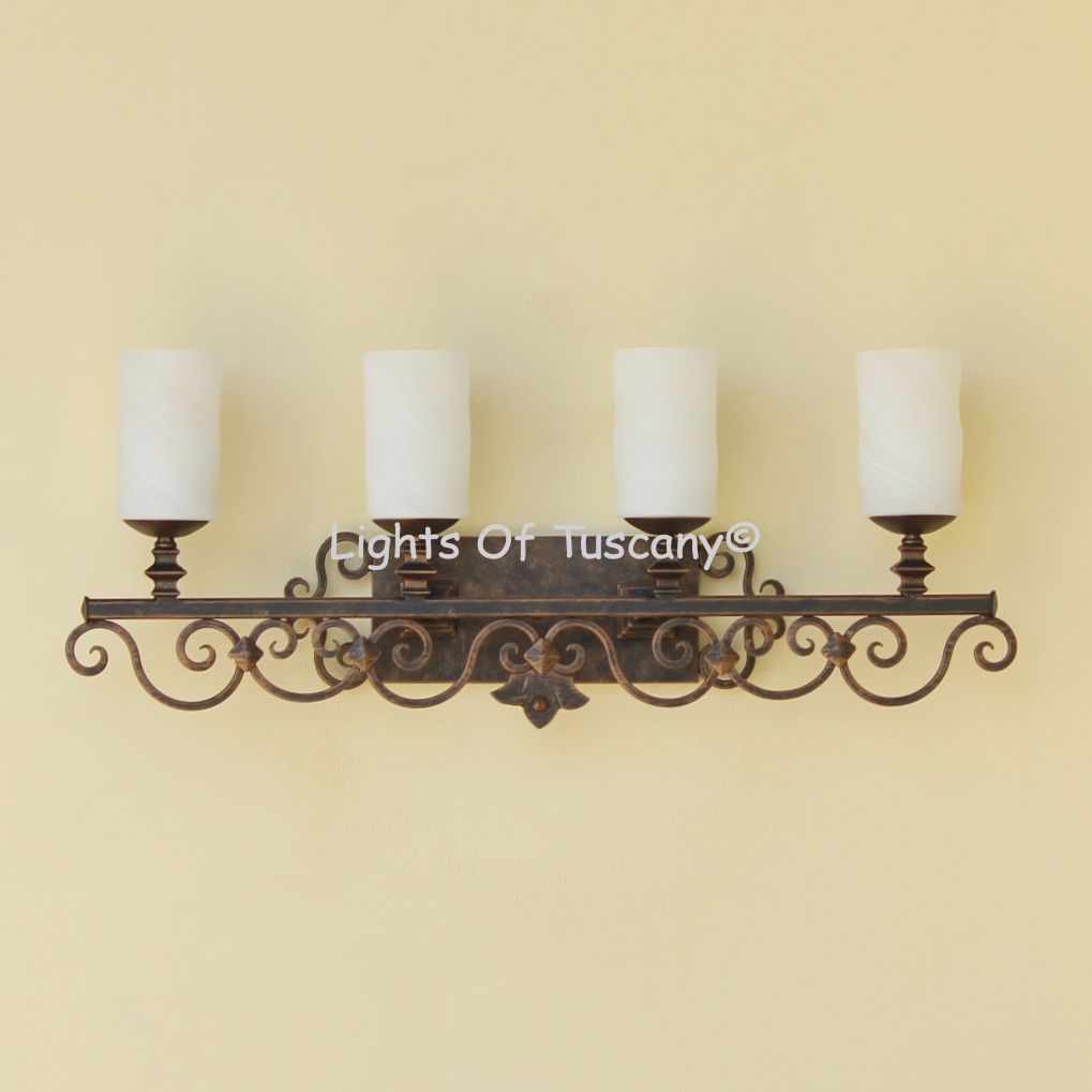 Mediterranean Style bath bar light. Can be installed face down or up. Shown in antique copper with with candle shapped glass. Please see our available finishes and glass selection in our option section. 44" wide, 13" high 7" extention. 9" Height / distance from the attachment point to the top of the fixture (lights facing up). Back plate size 18" wide 5" high.