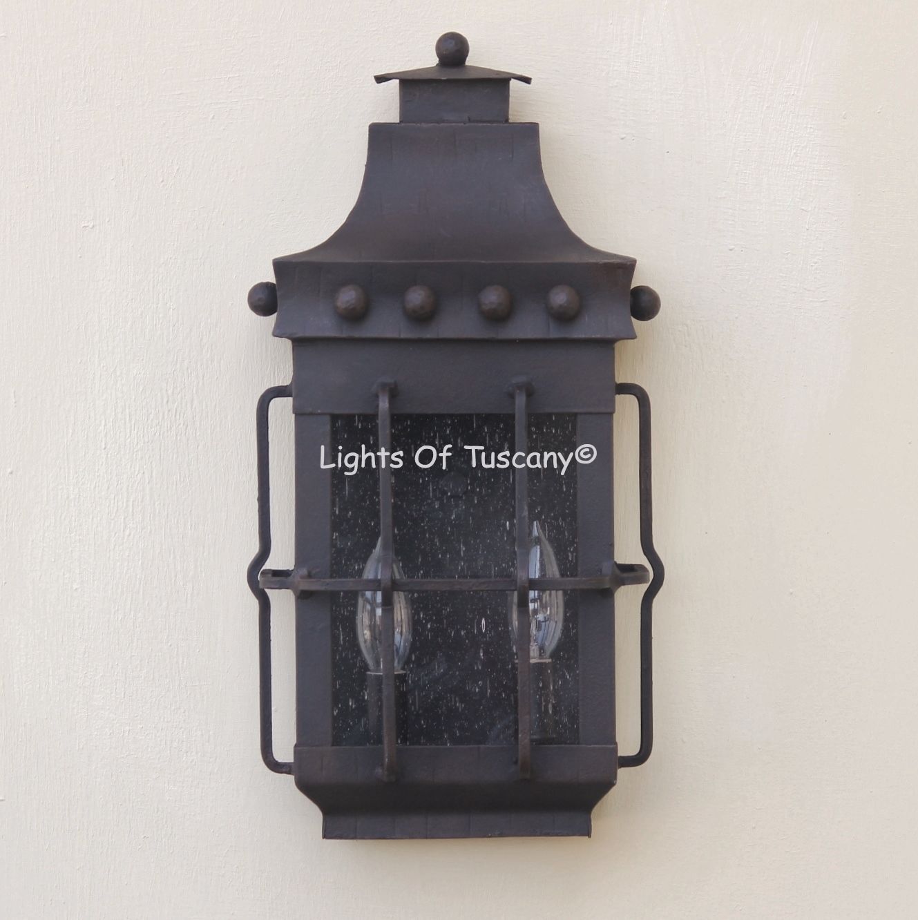This beautiful hand crafted outdoor wall light is made of all authentic hand forged wrought iron. All our fixtures are hand painted and available in any of our finish options. This fixture is perfect for garage lighting, outdoor walls, backyard and patio lighting.