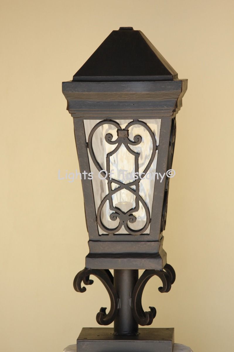 Spanish style column post lantern light. Shown in Dark brown finish with seedy glass. 25" high 9" wide. Cage size 18" high 9" wide. Base size 8" by 8".
