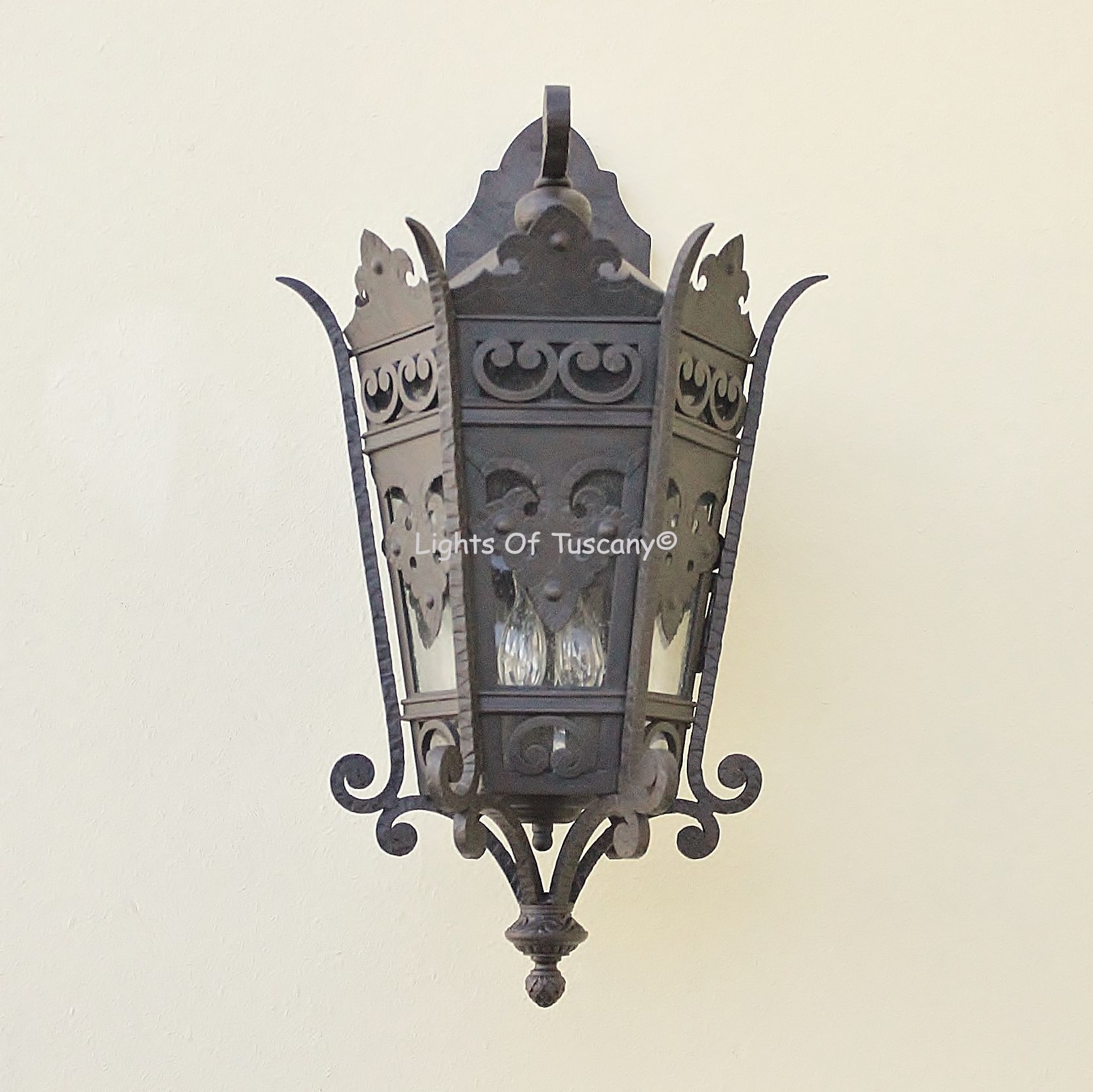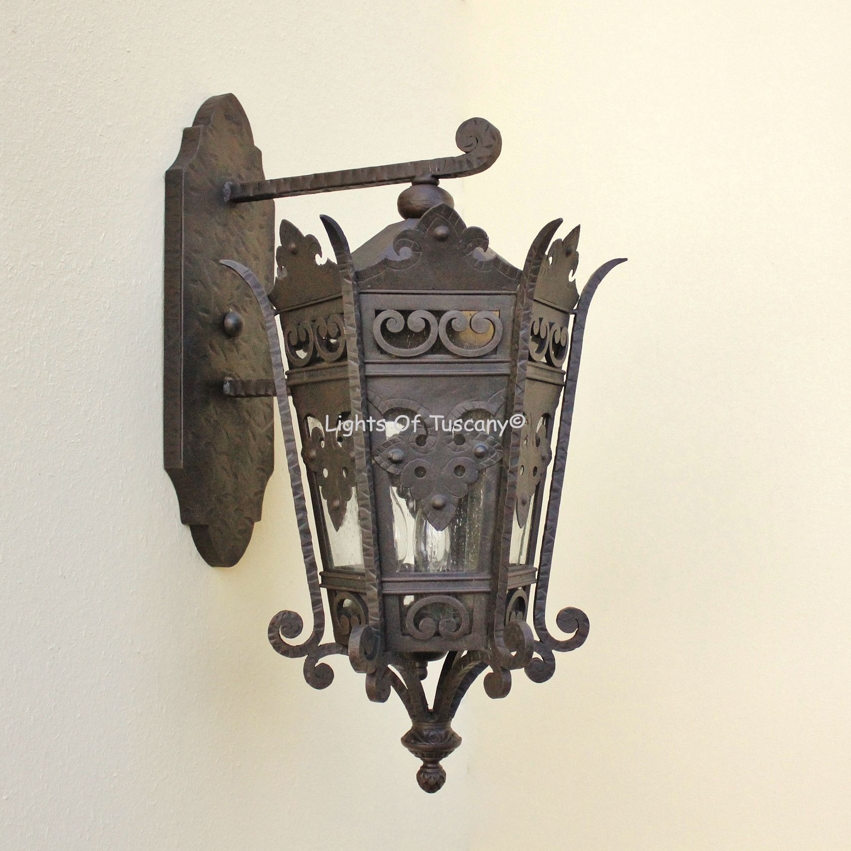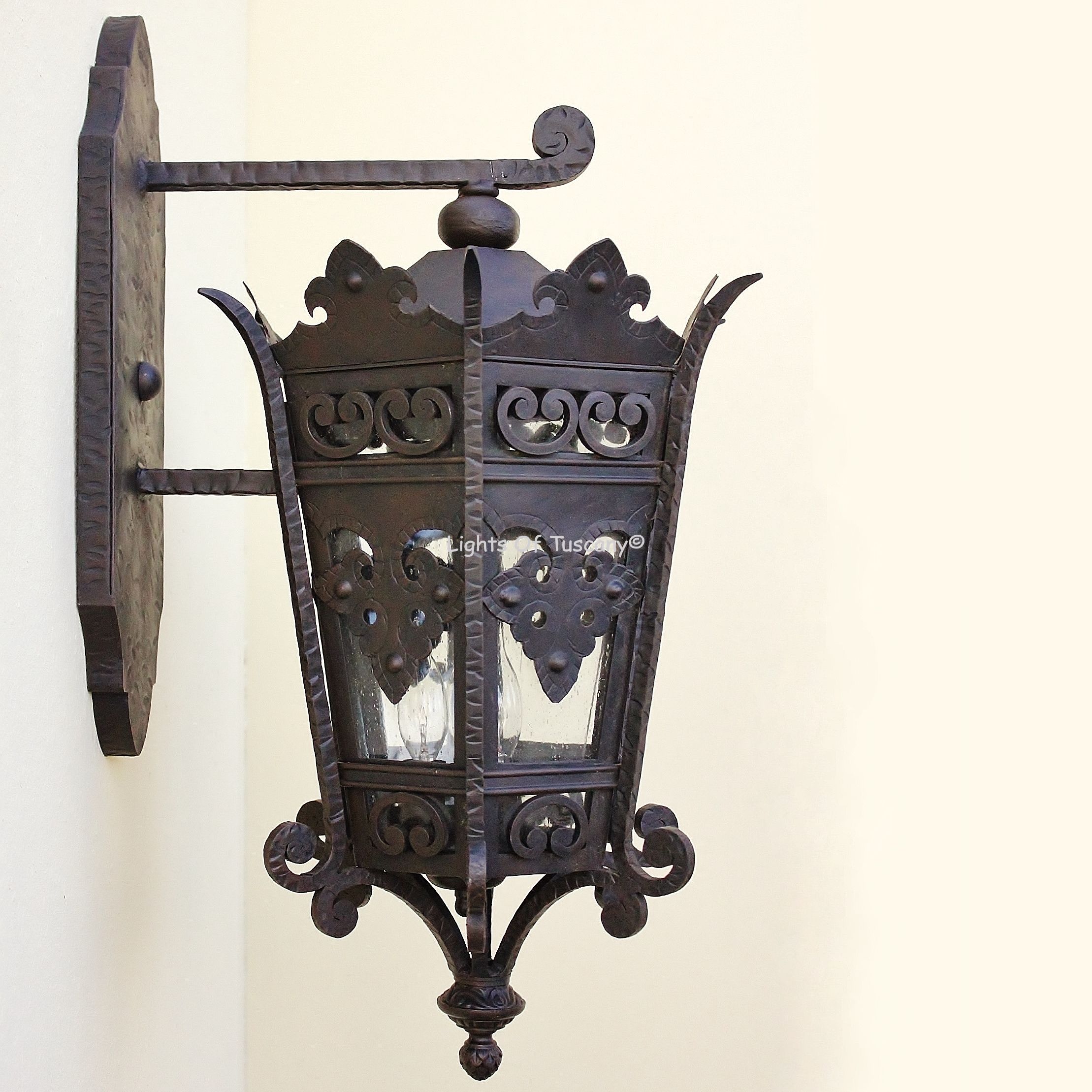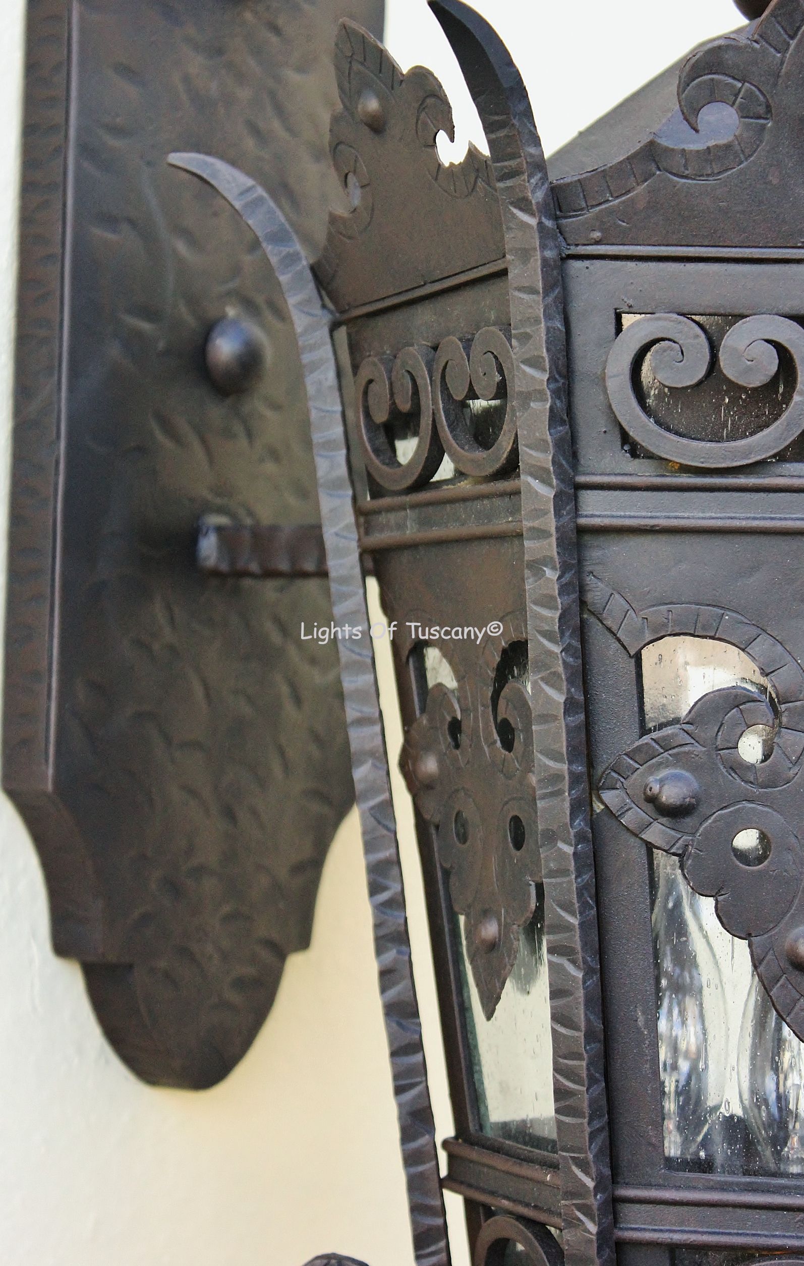 This beautiful hand crafted outdoor wall light is made of all authentic hand forged wrought iron. All our fixtures are hand painted and available in any of our finish options. This fixture is perfect for garage lighting, outdoor walls, backyard and patio lighting.