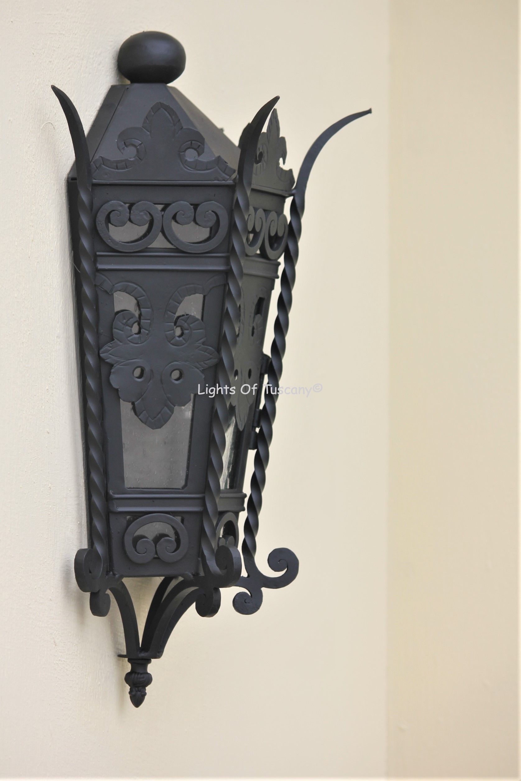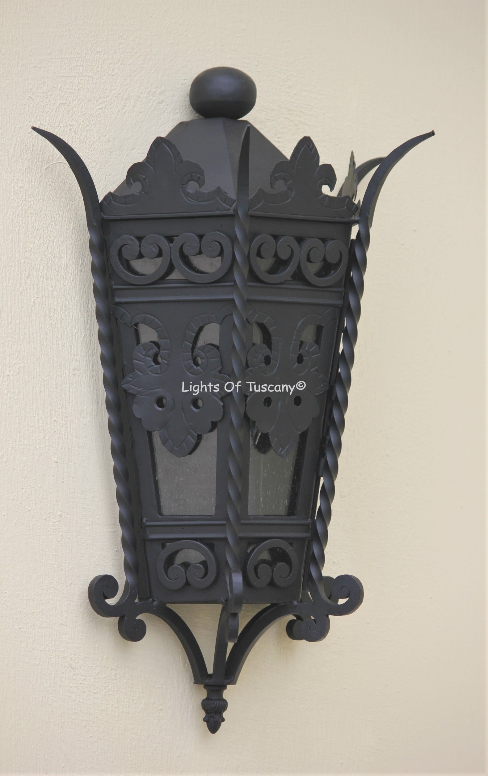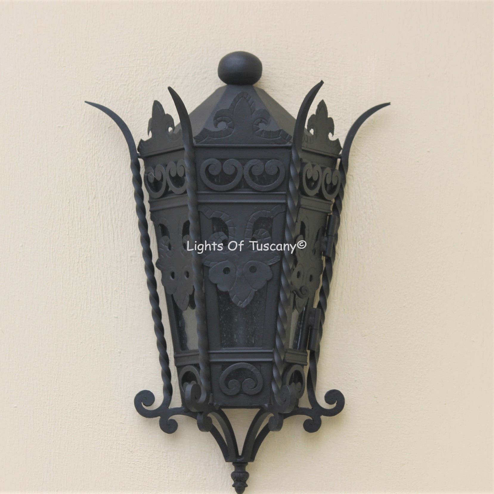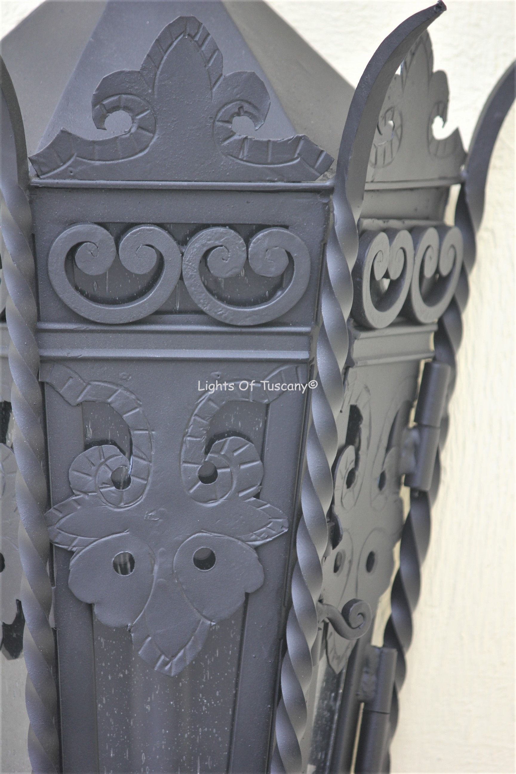 This beautiful hand crafted outdoor wall light is made of all authentic hand forged wrought iron. All our fixtures are hand painted and available in any of our finish options. This fixture is perfect for garage lighting, outdoor walls, backyard and patio lighting.