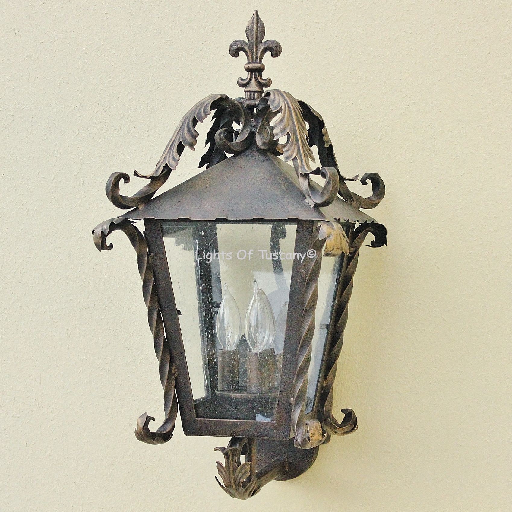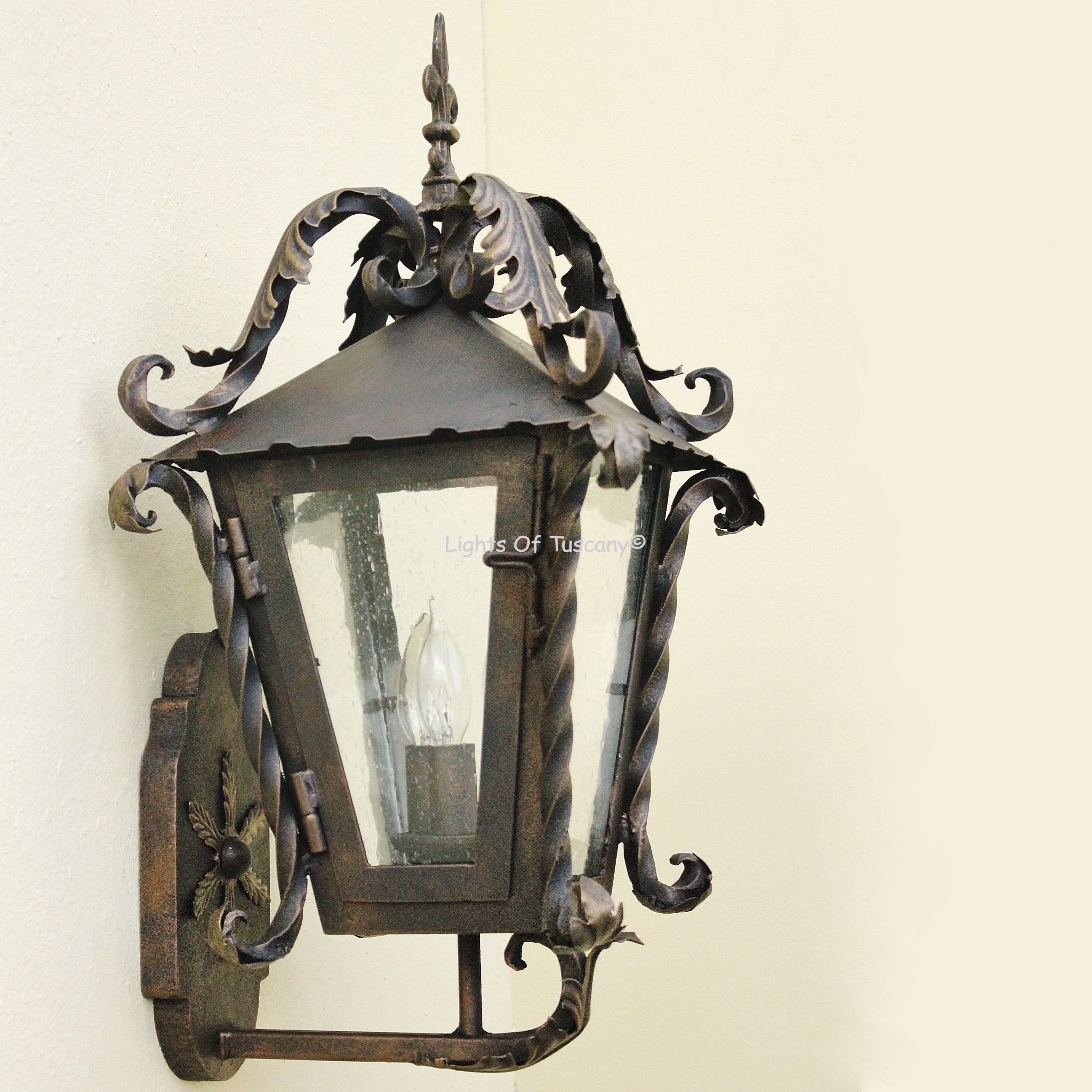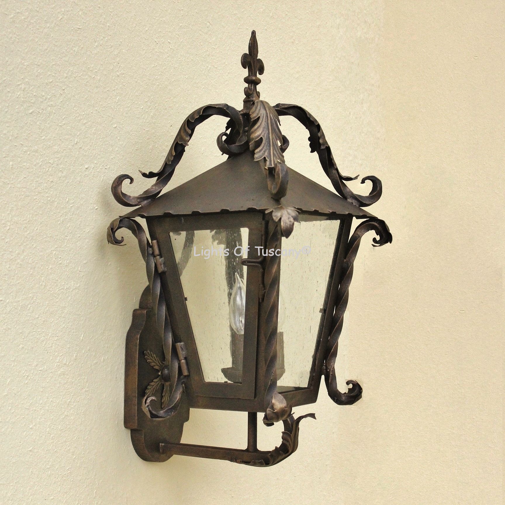 This beautiful hand crafted outdoor wall light is made of all authentic hand forged wrought iron. All our fixtures are hand painted and available in any of our finish options. This fixture is perfect for garage lighting, outdoor walls, backyard and patio lighting.