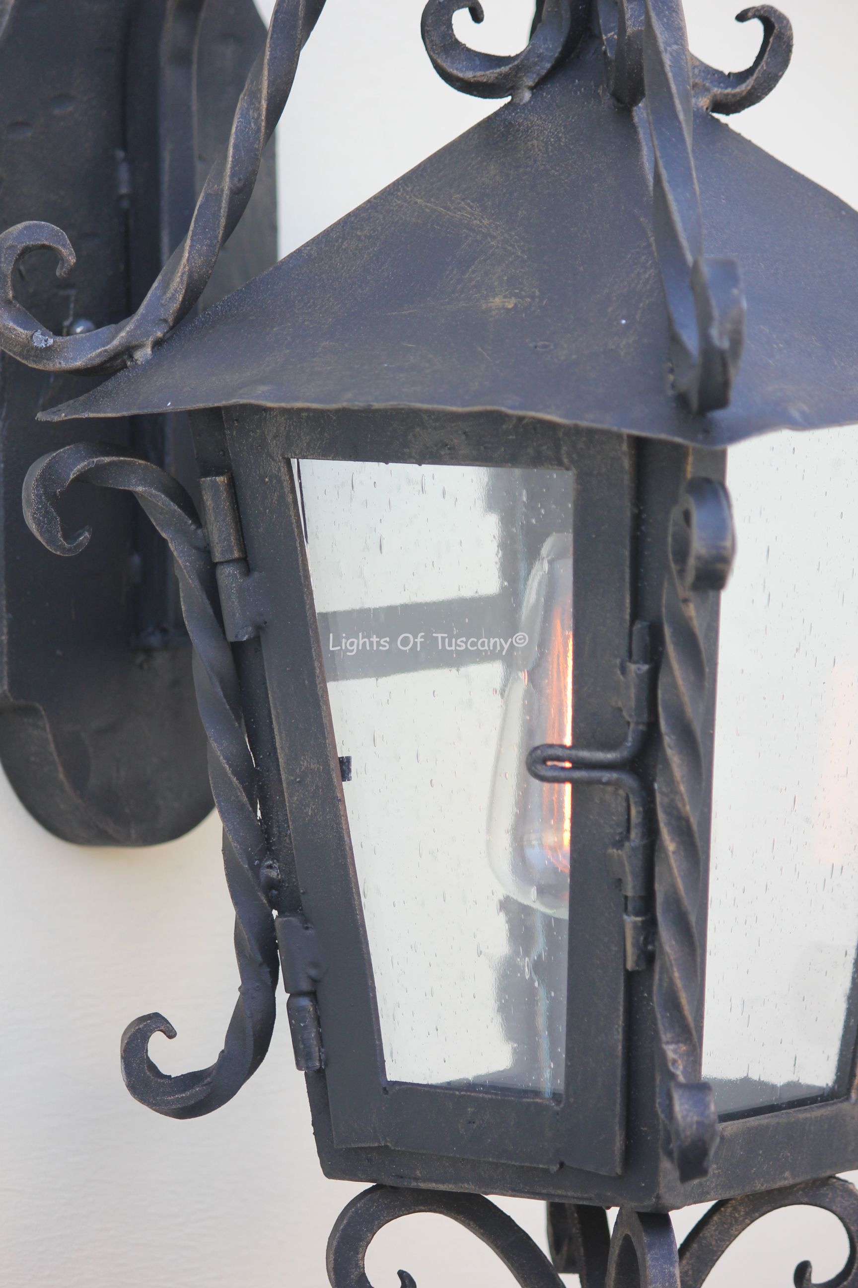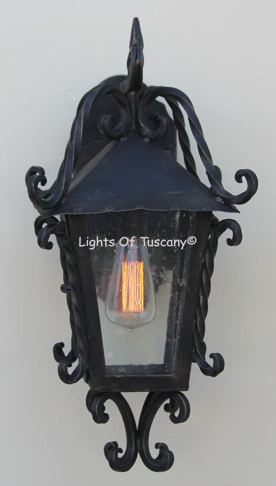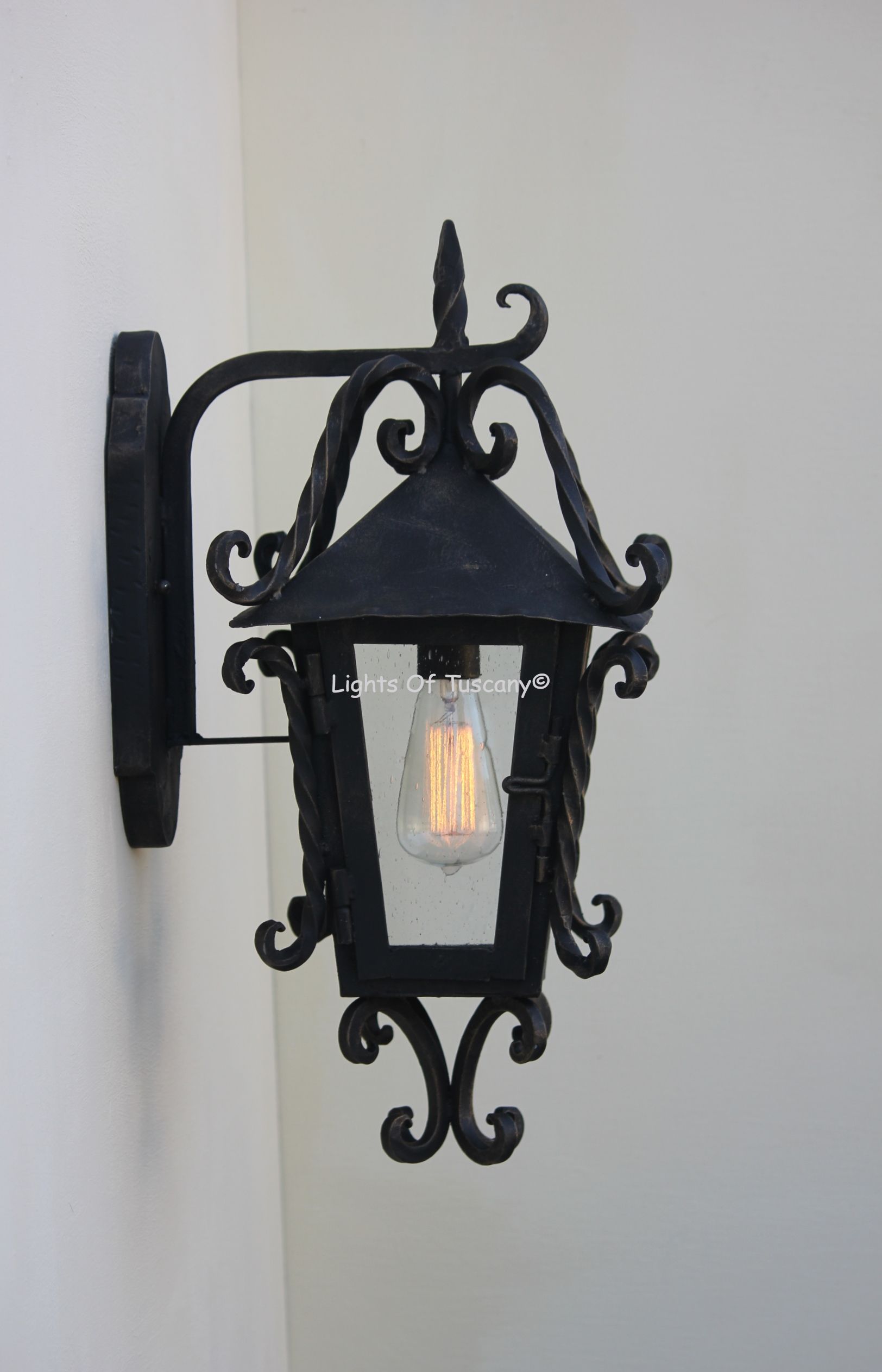 This beautiful hand crafted outdoor wall light is made of all authentic hand forged wrought iron. All our fixtures are hand painted and available in any of our finish options. This fixture is perfect for garage lighting, outdoor walls, backyard and patio lighting.