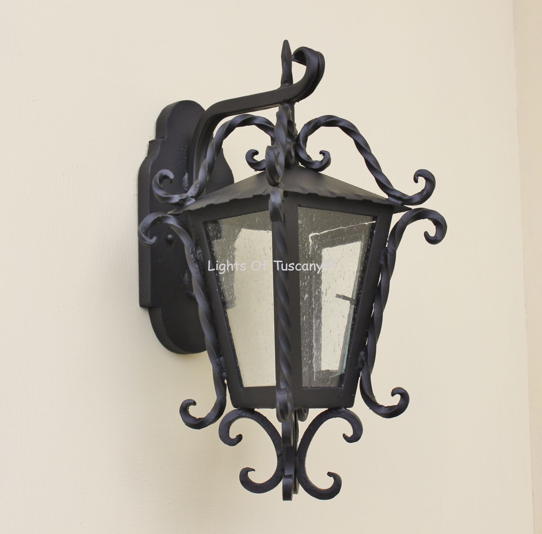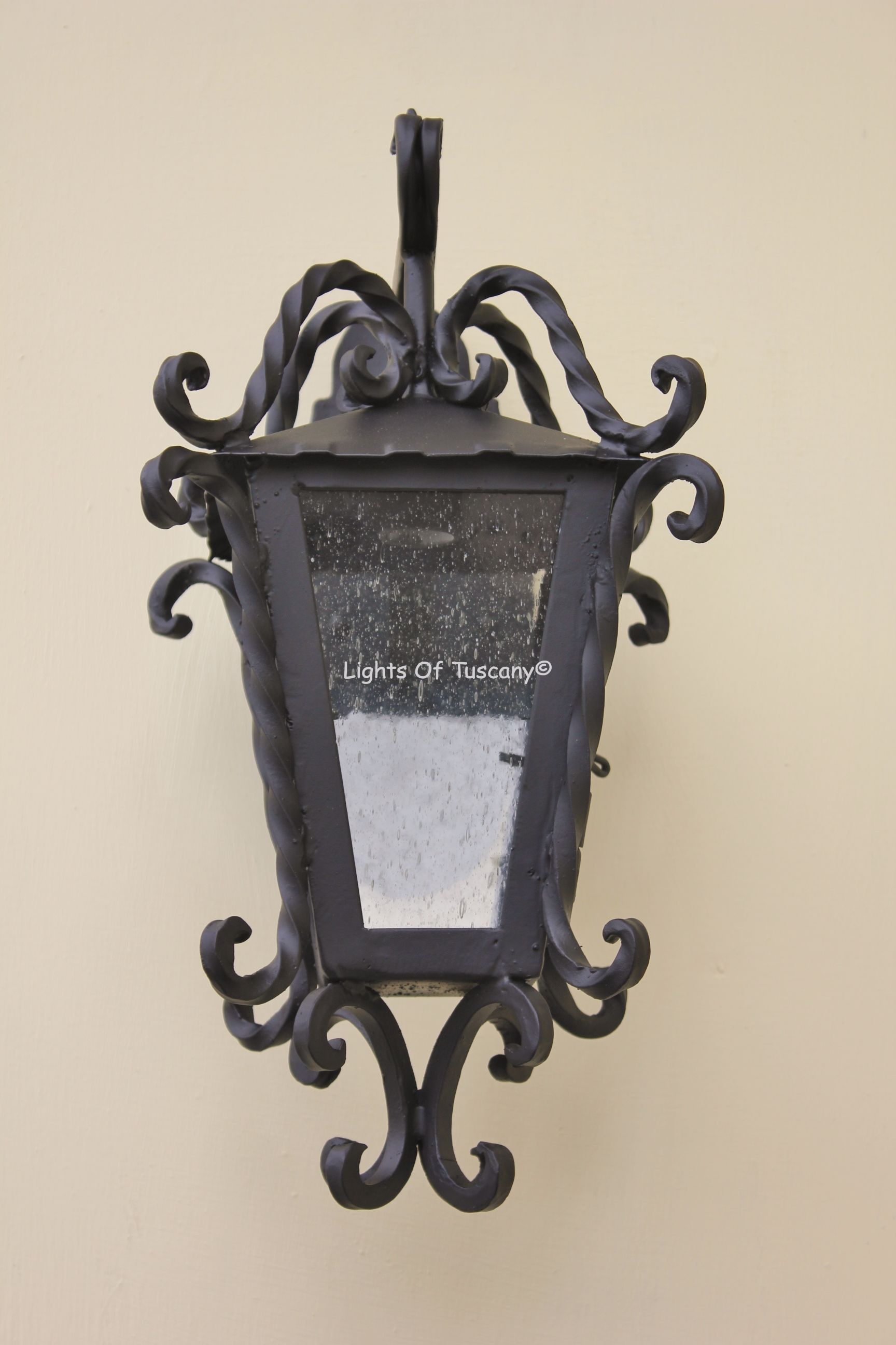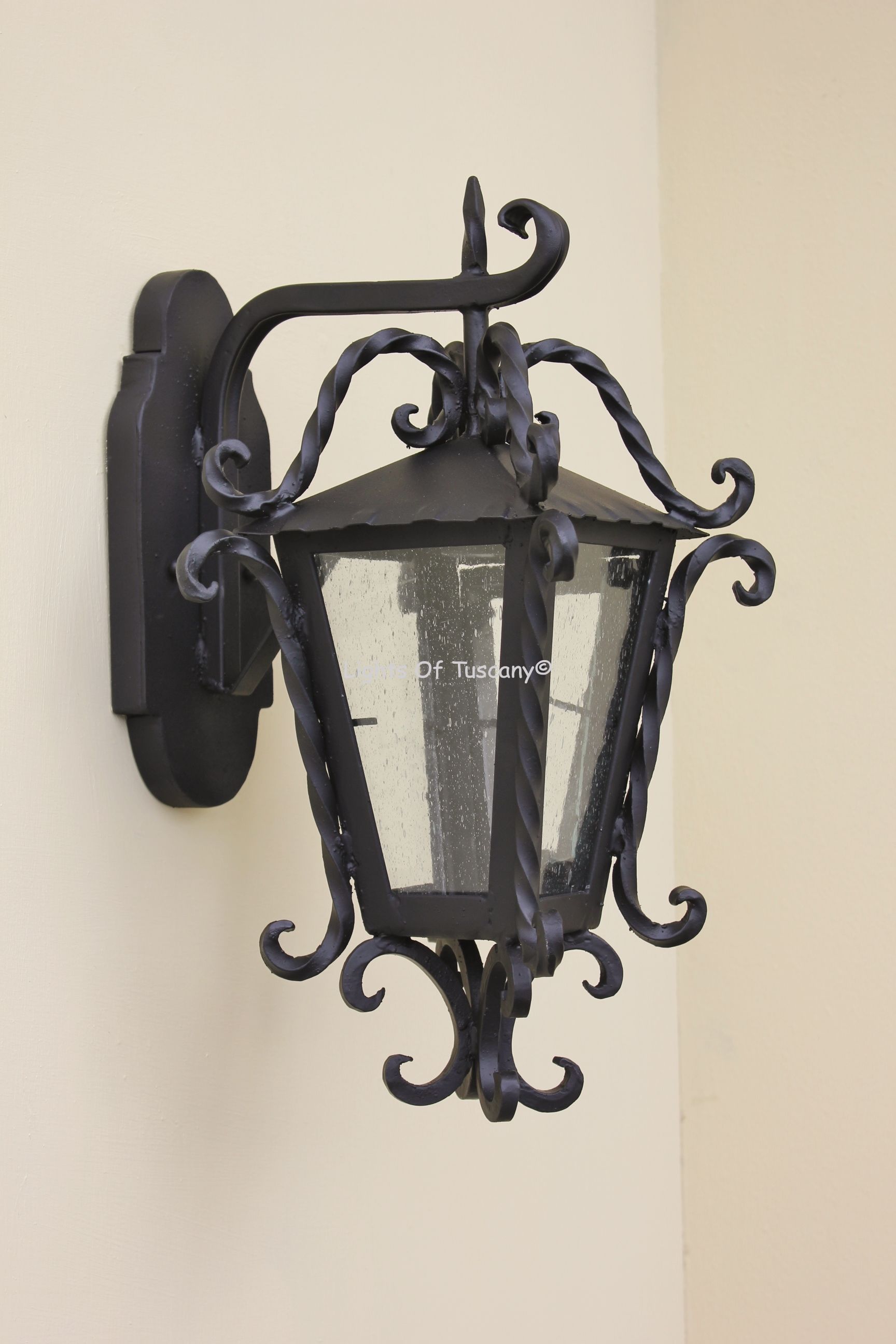 This beautiful hand crafted outdoor wall light is made of all authentic hand forged wrought iron. All our fixtures are hand painted and available in any of our finish options. This fixture is perfect for garage lighting, outdoor walls, backyard and patio lighting.