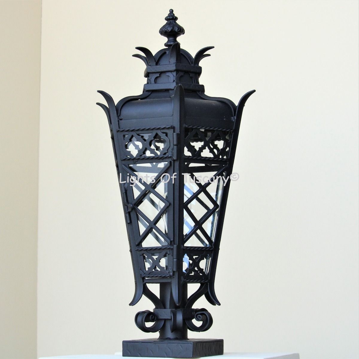 This beautiful hand crafted outdoor post light is made of all authentic hand forged wrought iron. All our fixtures are hand painted and available in any of our finish options. Available for installation on posts and columns. Please see details below.