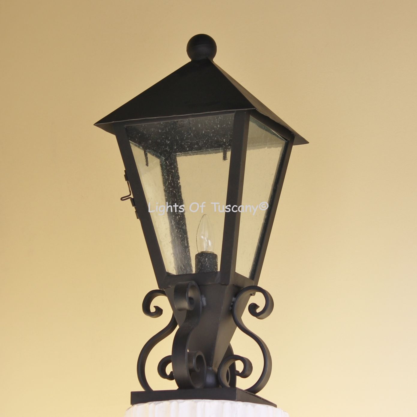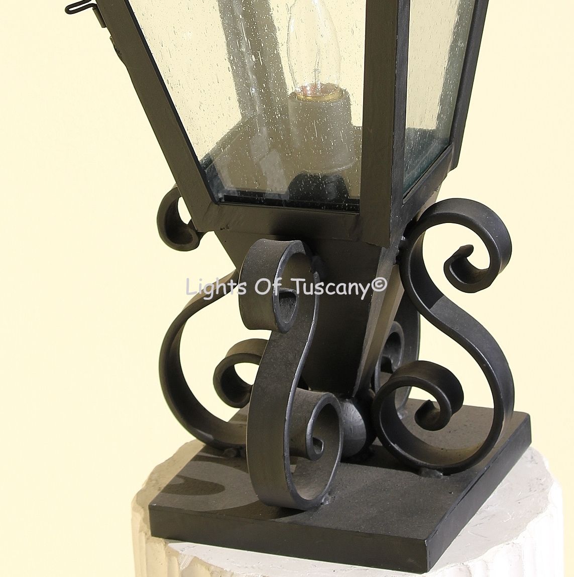 Hand forged wrought iron Tuscan Villa Style Outdoor Post Light. This beautiful lantern post light has a working window door to access interior and sitting on "S" scroll pedestal base. This simple design is perfect for your walkway, porch, or any outdoor living entertainment space. Matching hanging and wall versions available. Shown in our dark brown finish with seeded glass.