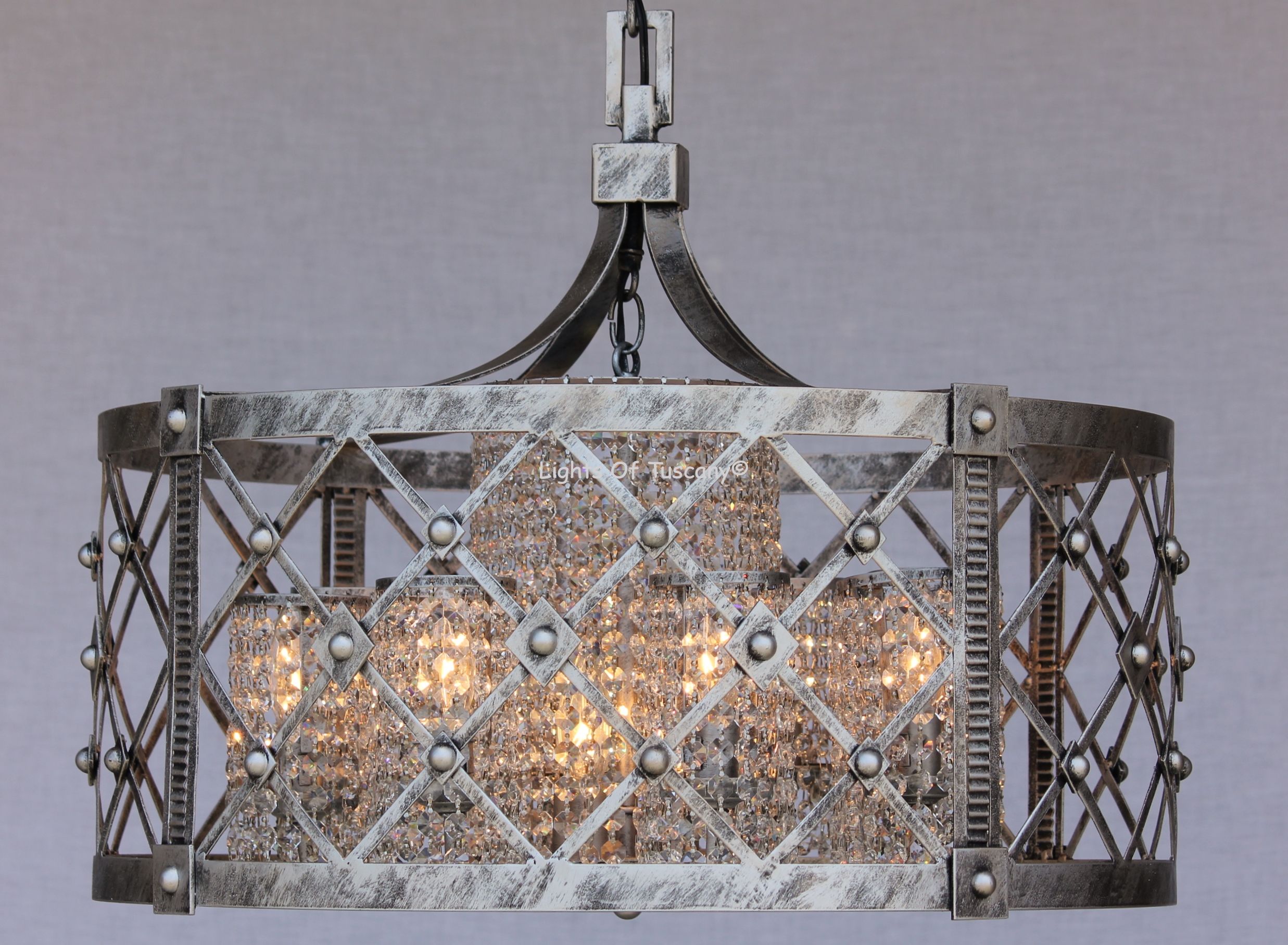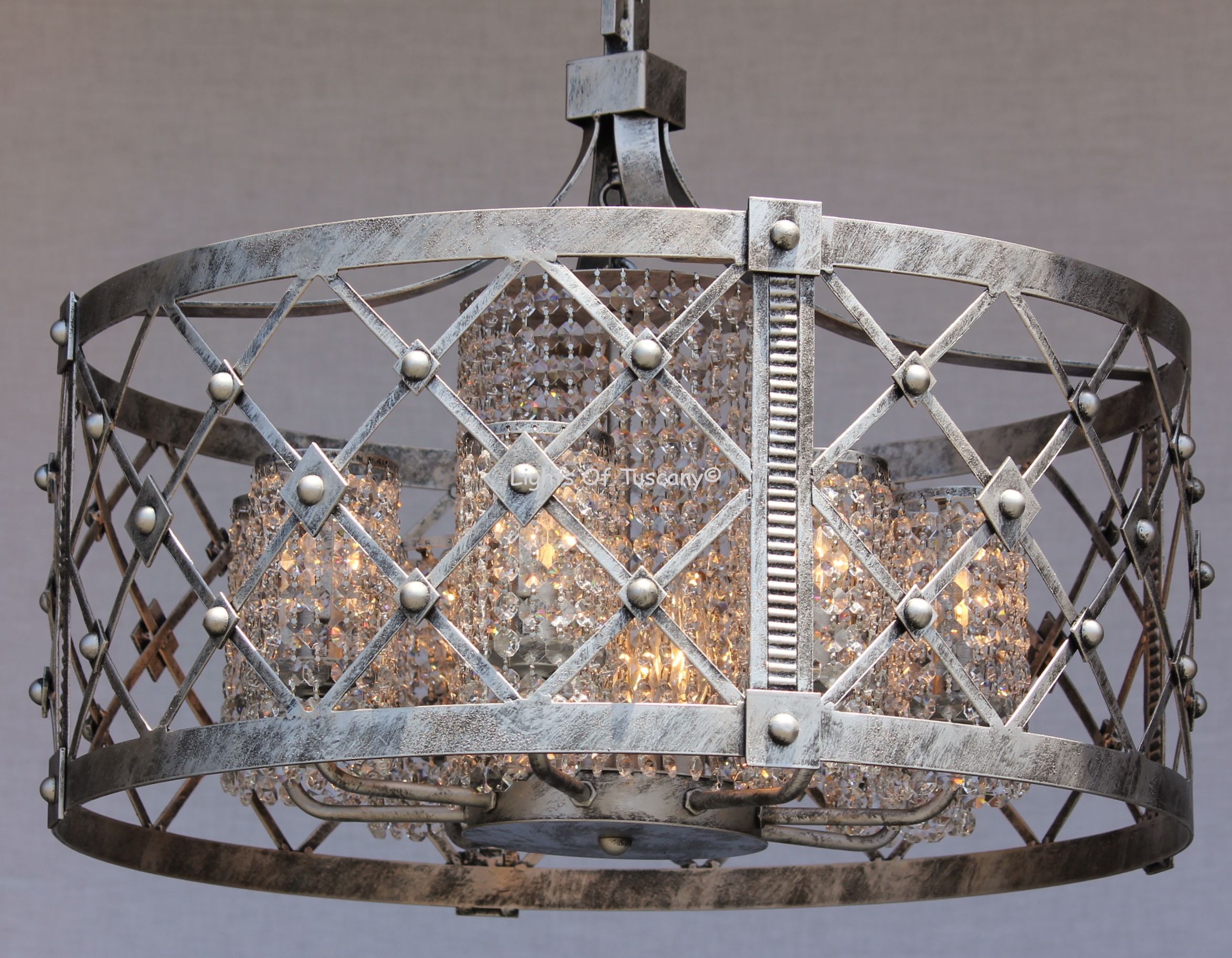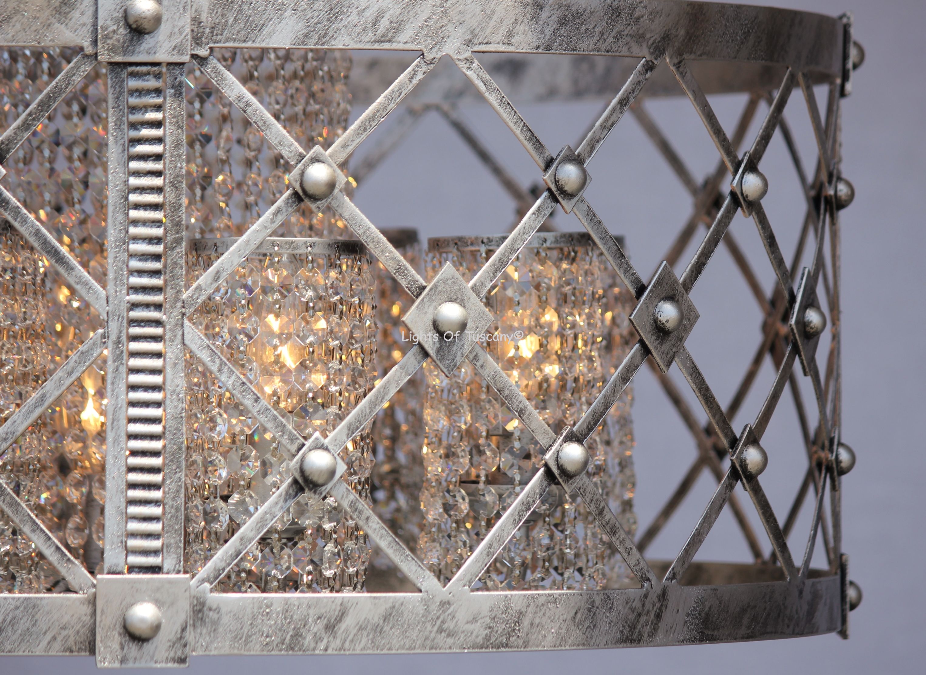 Beautiful crystal contemporary style chandelier. The outside drum shape has beautiful diamond accents with round bolt accents throughout. This fixture is shown in our custom brushed platinum finish.