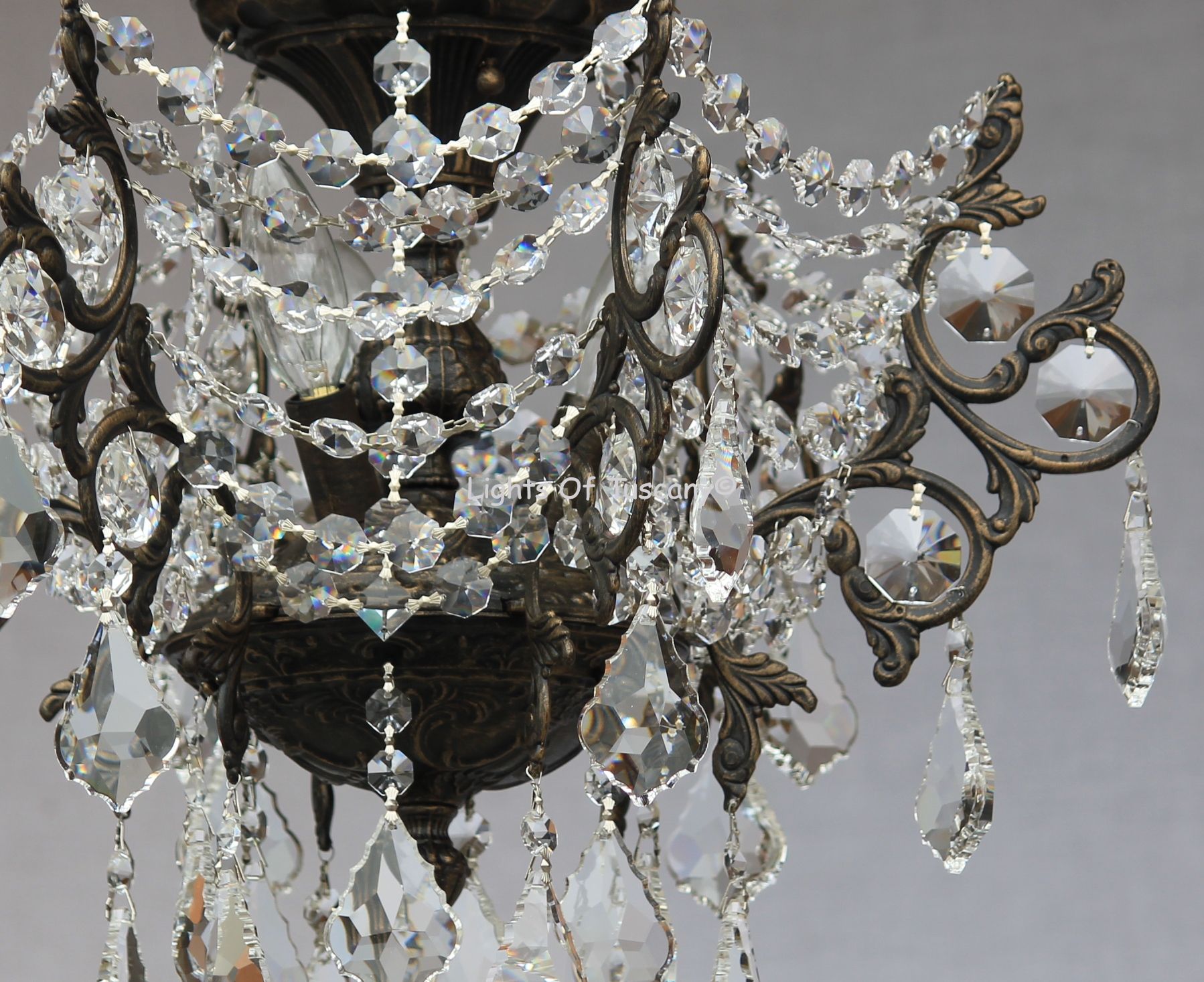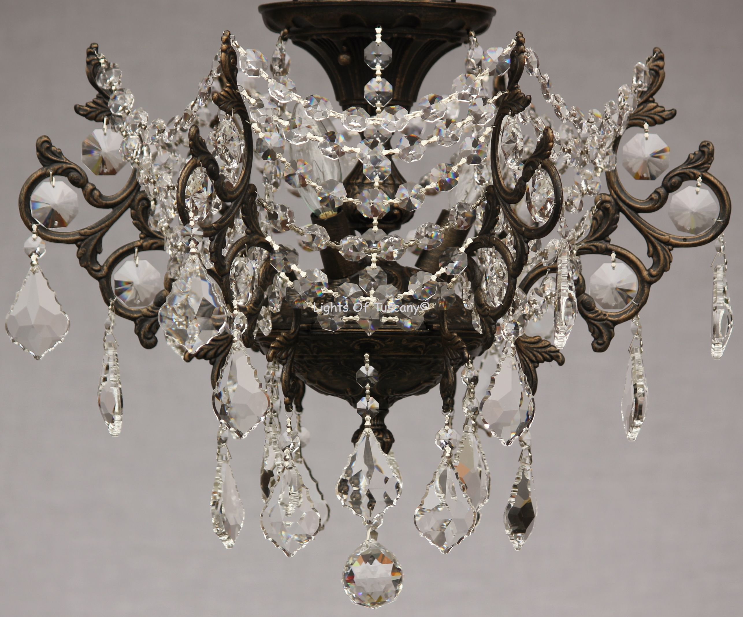 This beautiful Semi Flush Antique European Brass Crystal Chandelier is perfect for height restricted areas. This close to ceiling chandelier is decorated with beautiful real K9 lead crystals and made with imported European brass. Available in any of our finish options. Shown in antique bronze finish.
