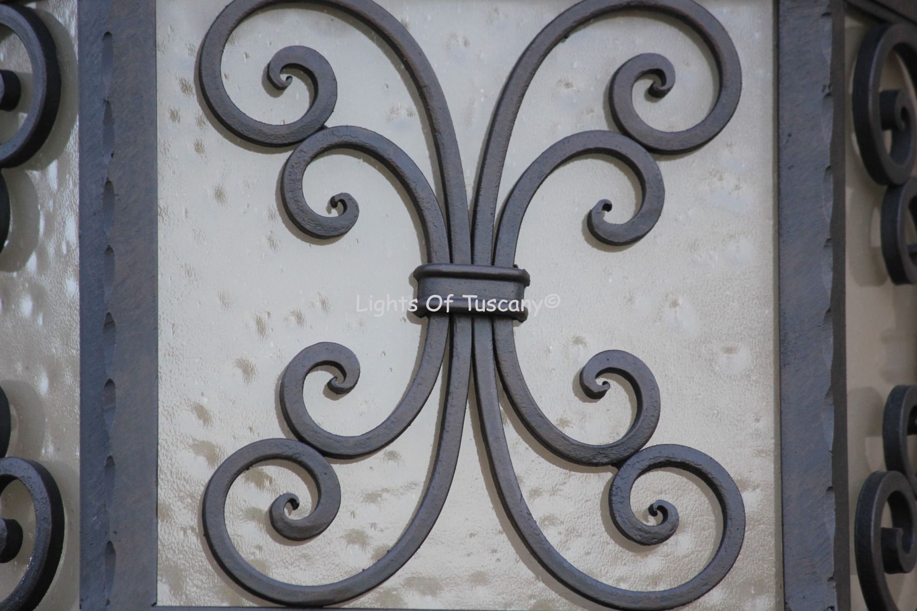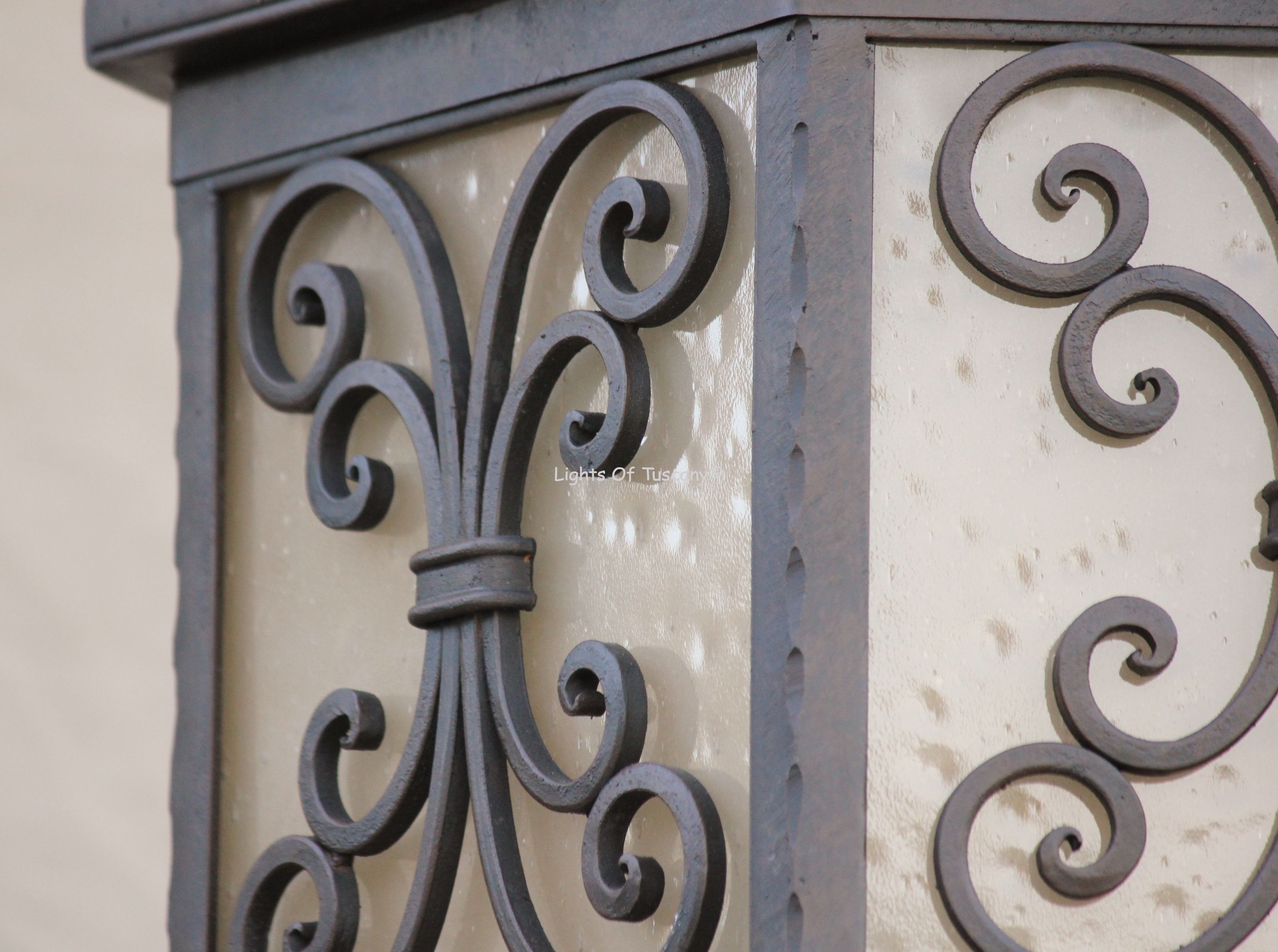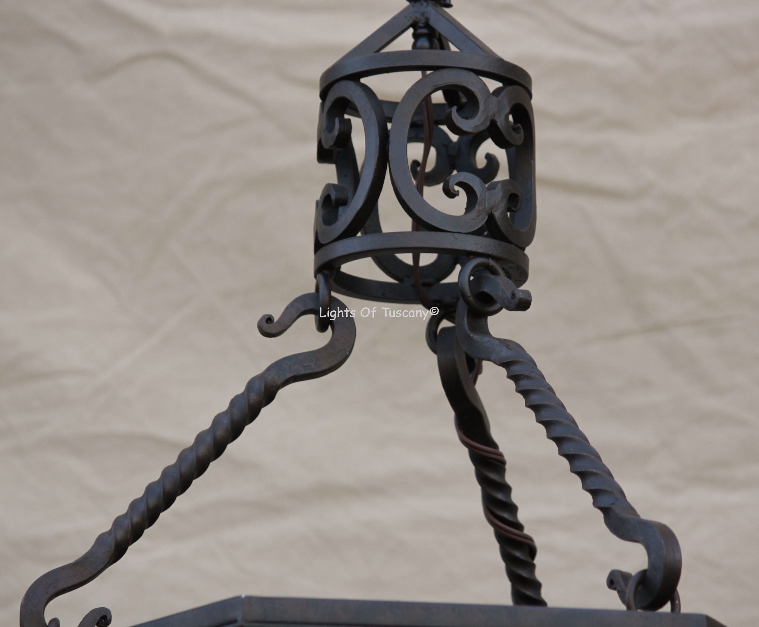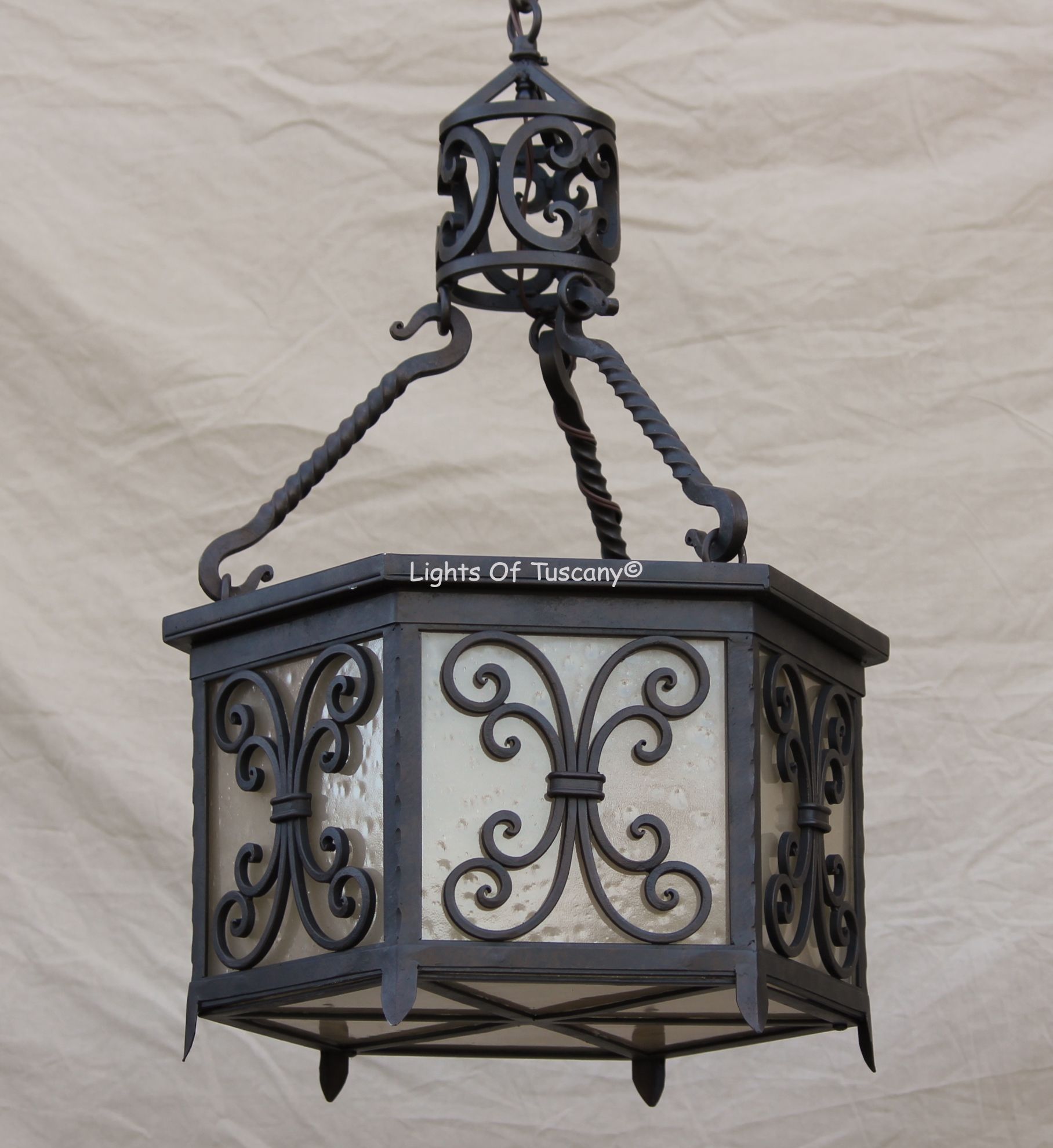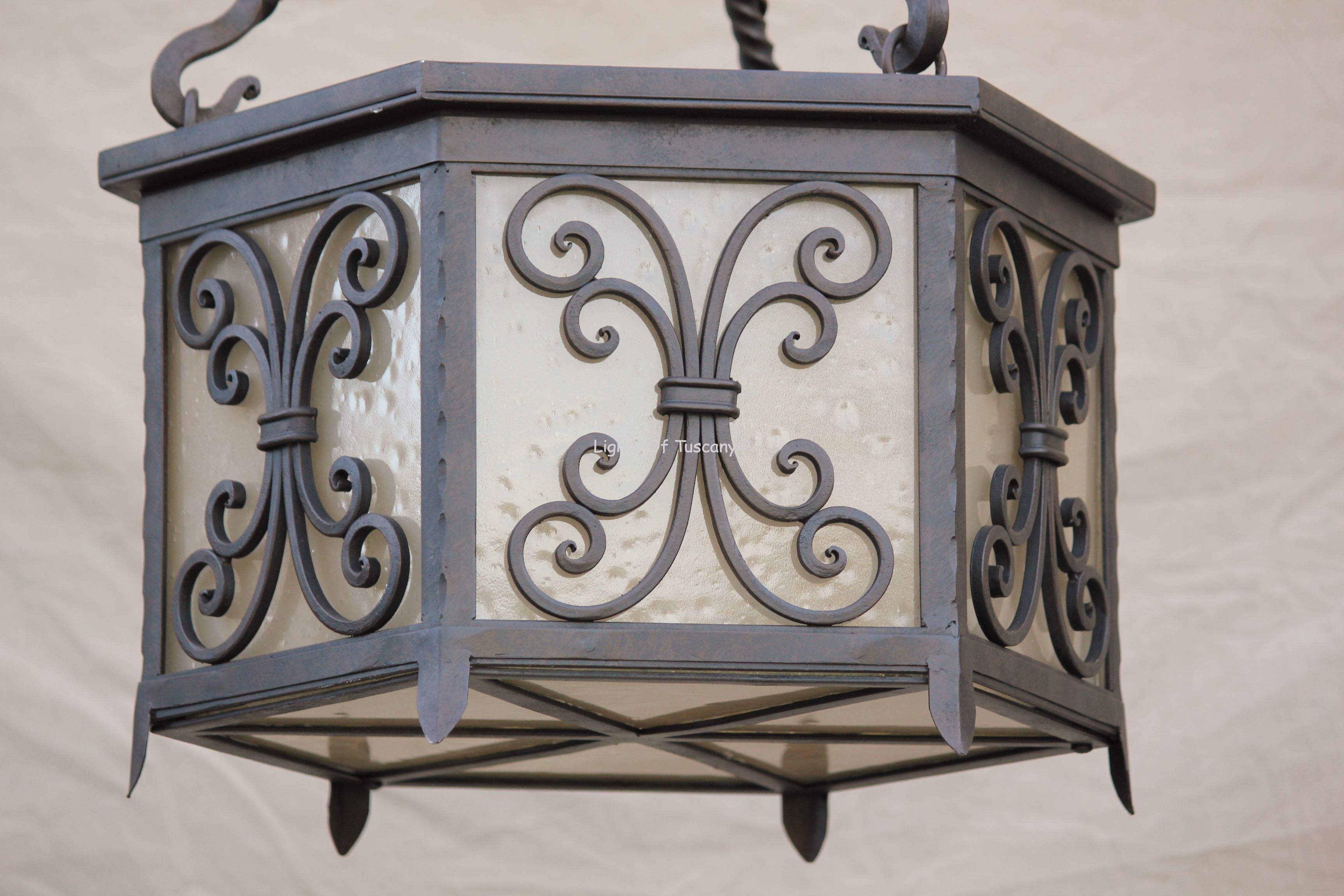 This beautiful hanging pendant is made of all hand forged wrought iron. This beautiful hanging light can be used for indoor or outdoors. For modifications or customization to this fixture, please contact customer service. Shown in our dark brown finish with amber frosted glass.