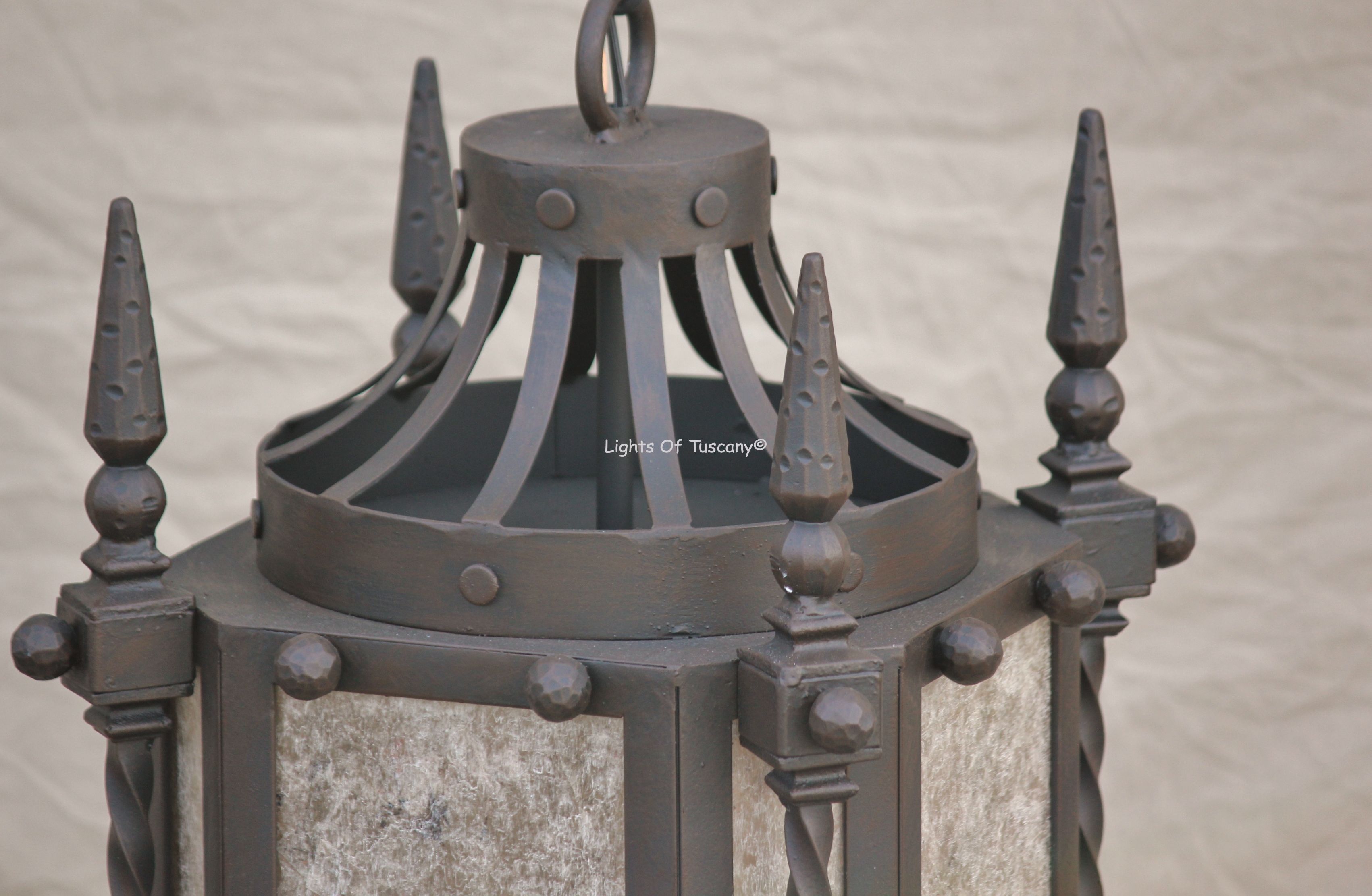 All hand forged wrought iron Gotich Medieval Style Hanging Lantern. This beautiful fixture has hand twisted rods with spear tips and rustic cage on top. This is shown in our dark brown finish with amber mica diffuser. Can be made with glass.