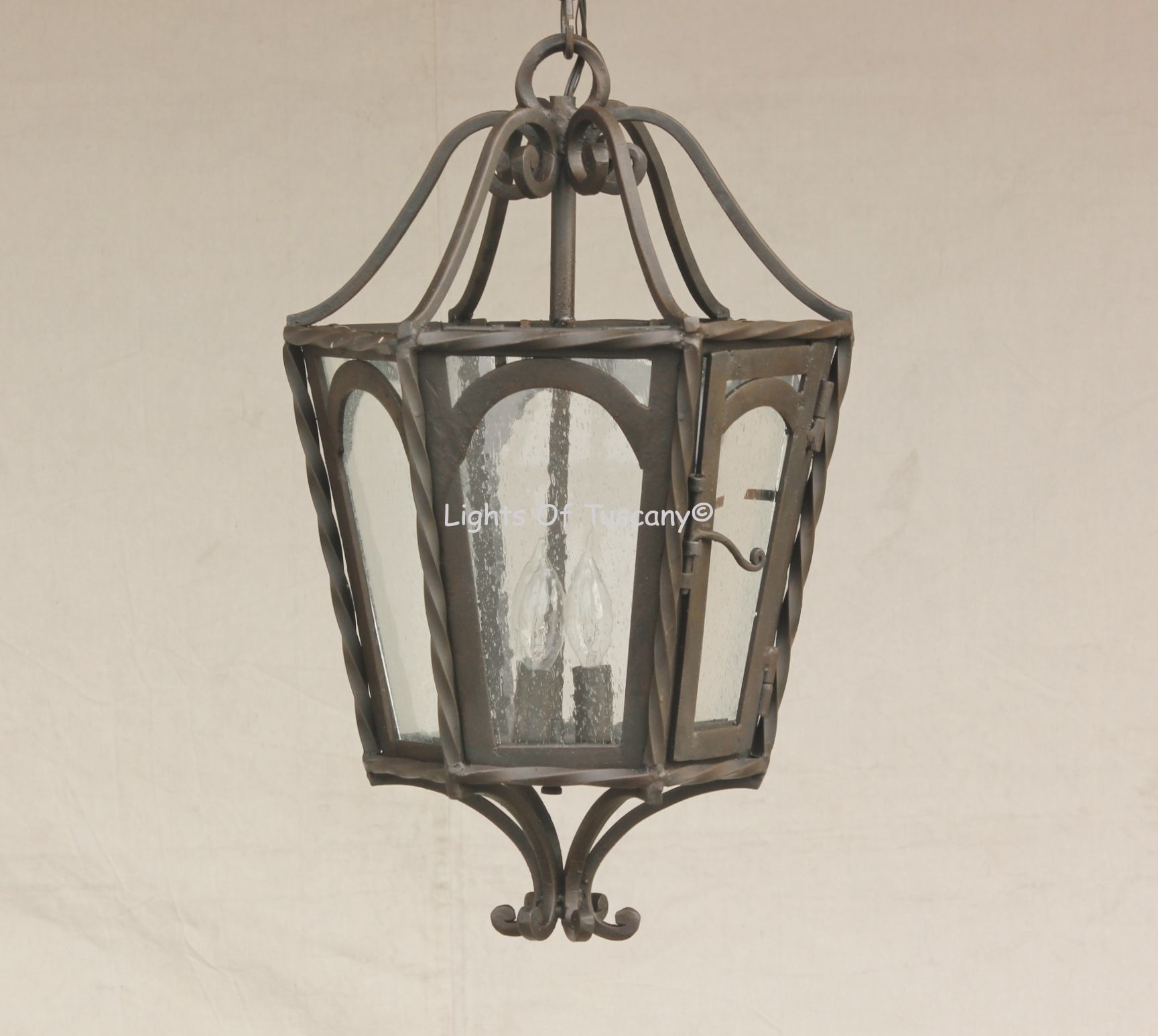Contemporary Style with Spanish style created with wrought iron shown in Dark Brown finish with Seeded glass. Chain provided to increase overall height to proper position. Available with various finish and candle choices, please see our Option section. ______________________________________________________________________________