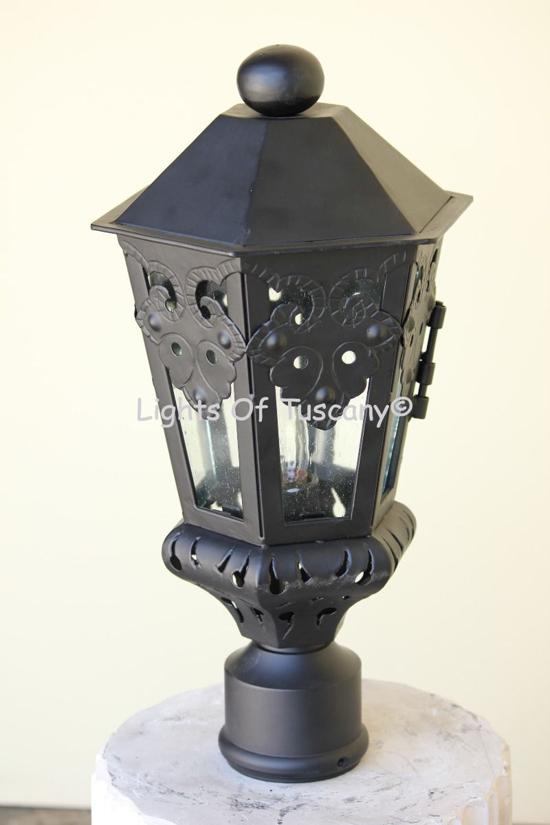 Spanish style small column post light. Shown in matt black finish with seedy glass. Available in Title 20 and Title 24 Compliant Led version. 17" high 9" wide (cage size 12.5" high 9" wide). Uses 1 medium base E26 LED light bulbs, 15W/100W equivalent, dimmable, bulbs not included