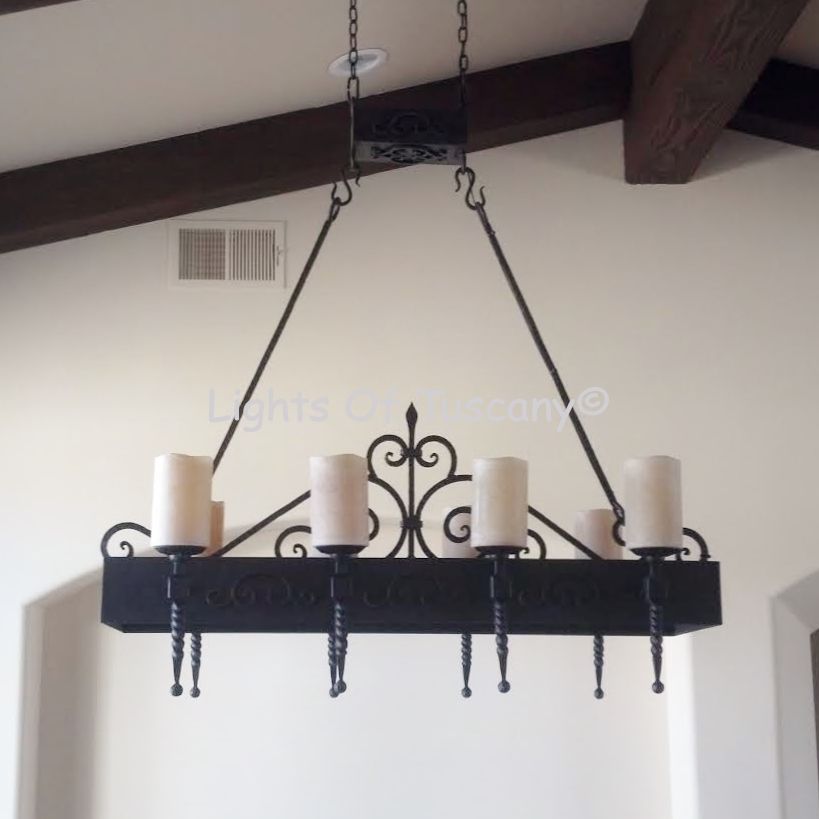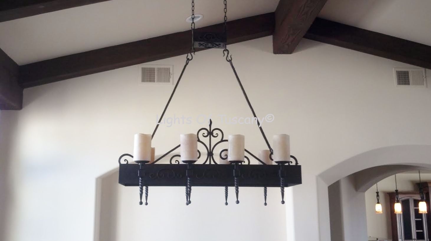 This is our beautiful Tuscan Wrought Iron Island Chandelier. This fixture would go beautifully over your kitchen island or in kitchen living space. Decorated with hand twisted accents and scroll work around the cage of the fixture. This is shown in our dark brown finish with upgraded real onyx stone shades.
