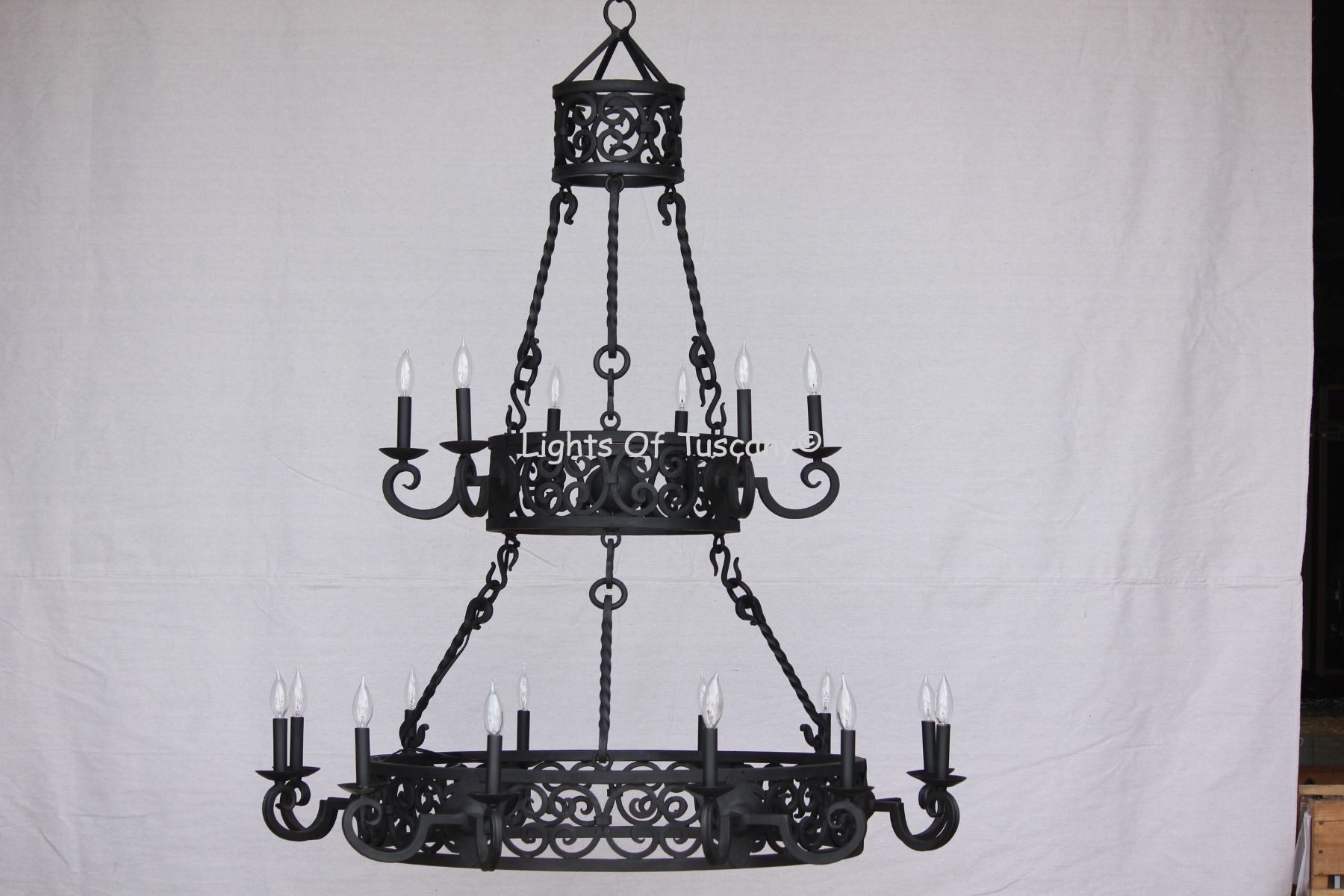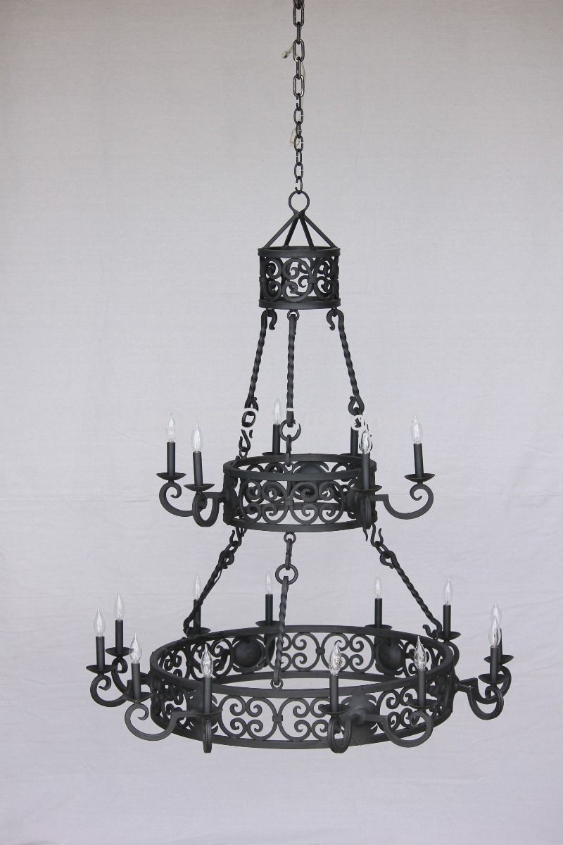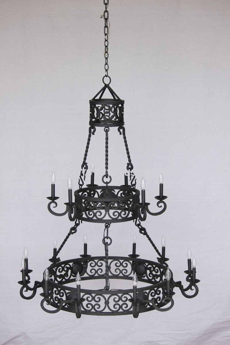 Tuscan chandelier. This two tiered, hand forged, wrought iron Tuscan chandelier will be the focal point of a large entryway or dining hall. Shown here in matte black finish with standard candlestick. This is available with glass candles (SKU 1277-18)