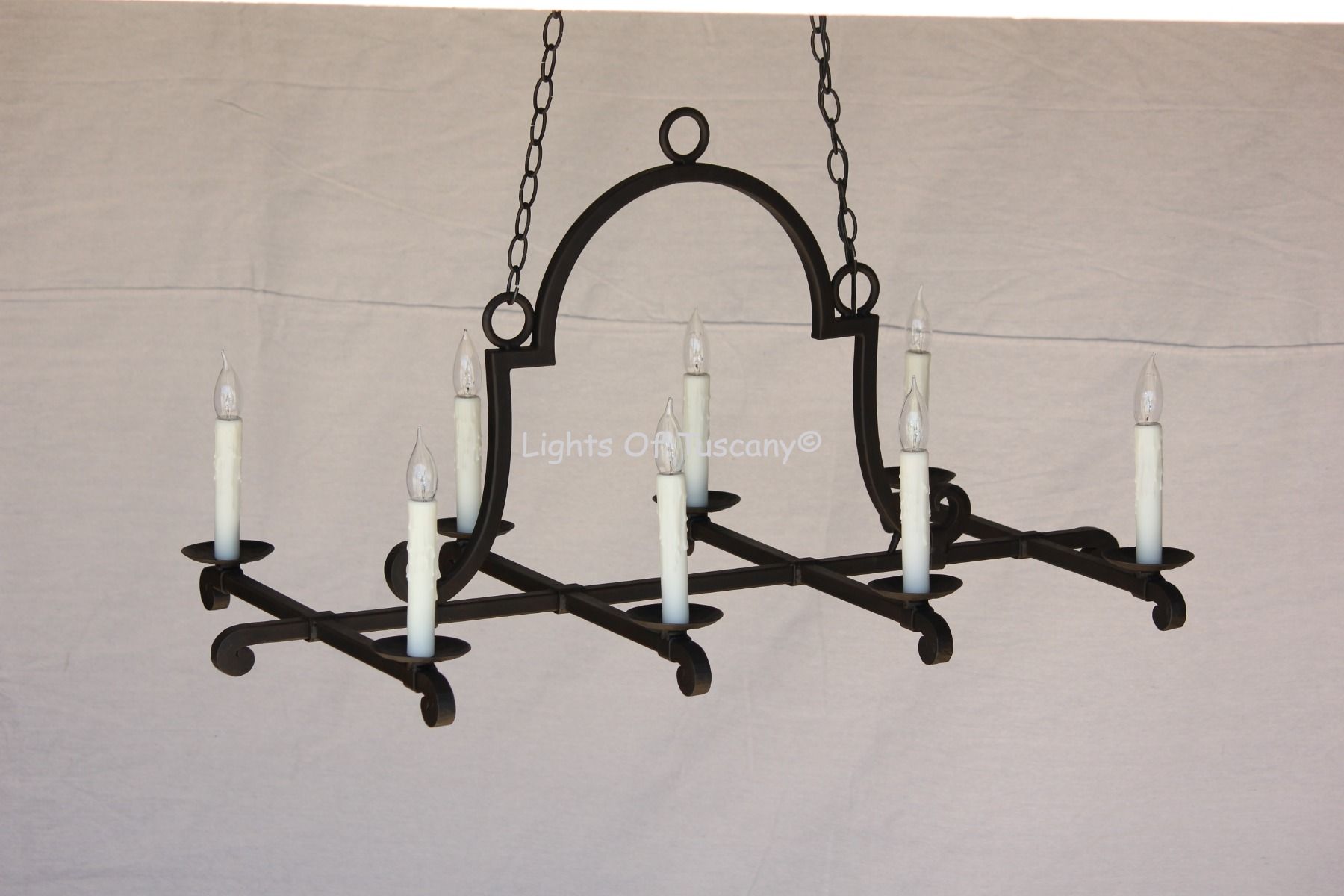Hand forged wrought iron Rustic Spanish Style Farmhouse Chandelier. This 8 light chandelier is perfect for your living area, dining room area, or kitchen. Please contact us for customization/modification options. Can add glass candle shades, please inquire when ordering. Shown in our dark brown finish with standard candles.