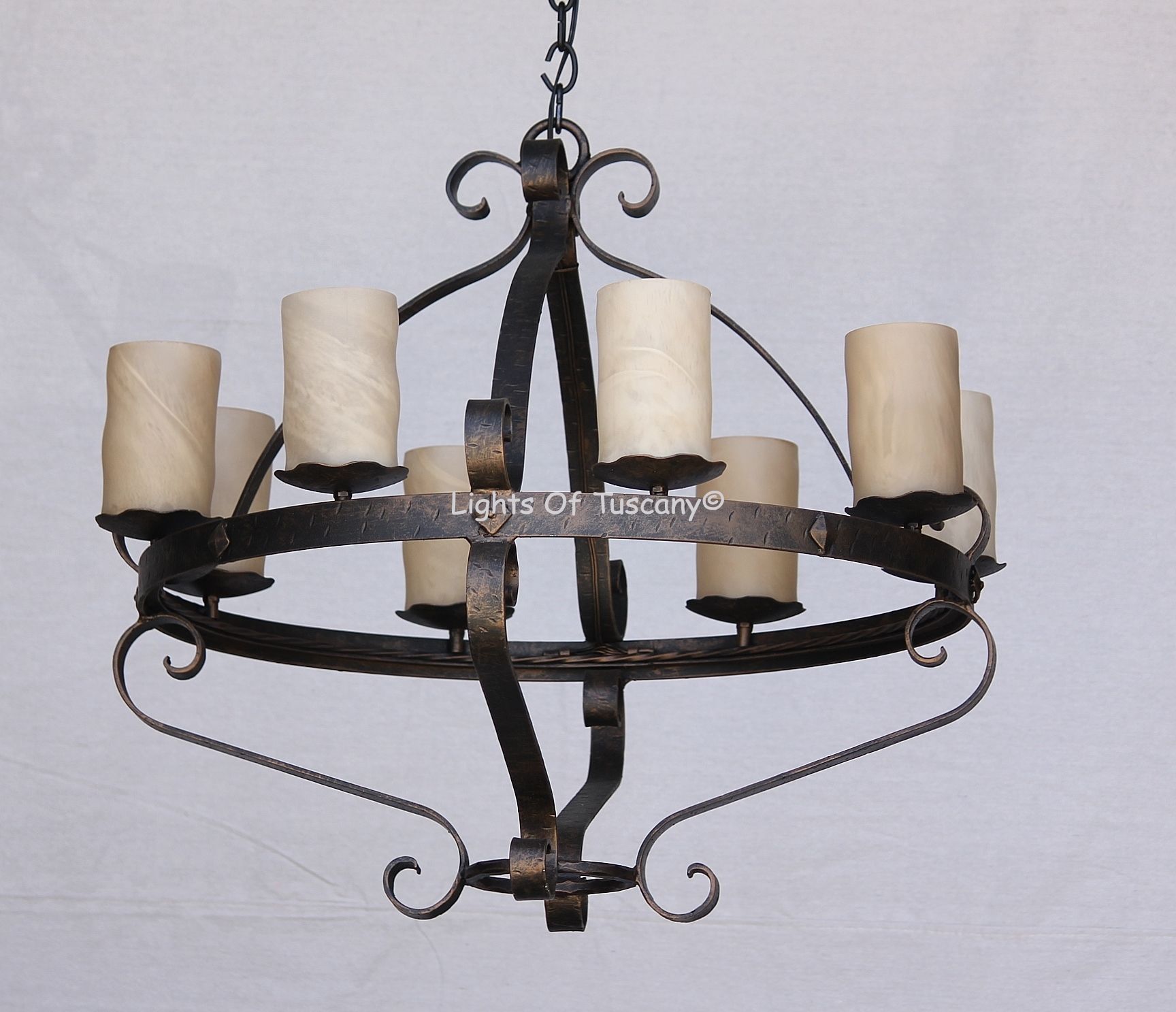 Our beautiful Tuscan-Italian Country Style Chandelier is made of all hand forged wrought iron with 8 lights. Beautiful hand hammered band arms with scroll accent on top and bottom the body of this fixture. This chandelier is perfect for your dining room or any living space. Available with candlestick (SKU 1637-6). Shown in our antique bronze finish with cream candlesticks.