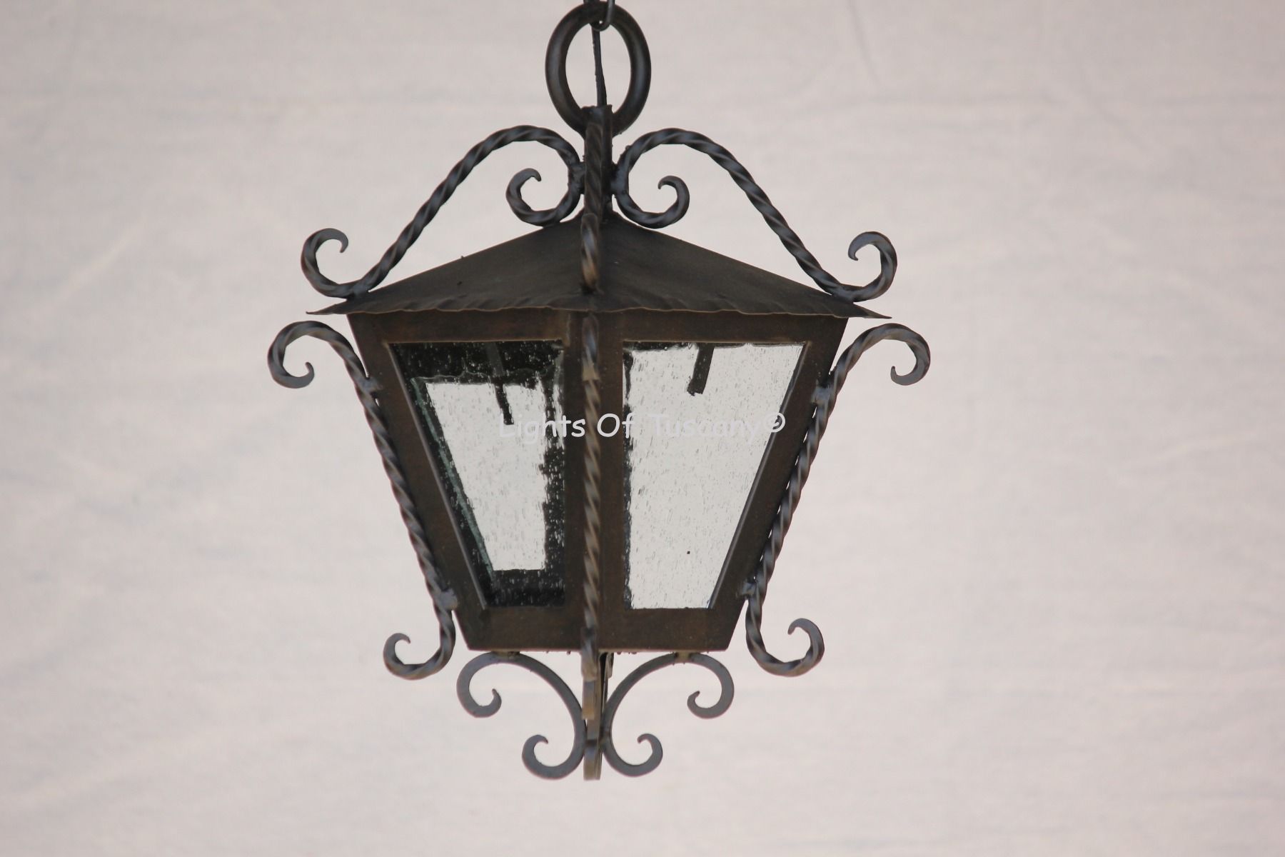 Hand forged wrought iron Spanish/Mediterranean Style Iron Hanging Light . Hangs from a chain with beautiful scroll arm accents on the top and bottom of the cage. The sides of the cage have hand twisted rod designs giving this an authentic Spanish/Mediterranean look. Matching post and wall lights for a complete look available. Perfect for your entry way, available for indoor/outdoor use. Shown in our matte black finish with clear seeded glass.