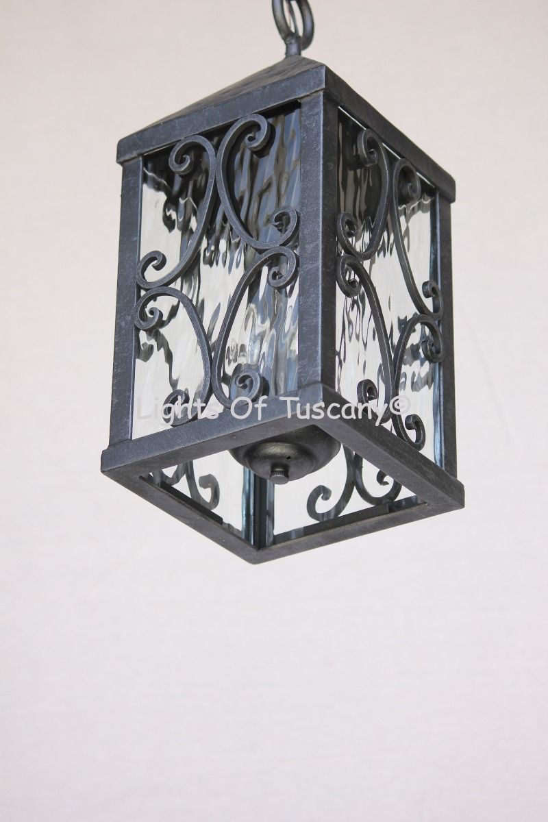 Hand forged wrought iron Tuscan/Mediterranean Style Iron Hanging Light . Perfect for your entry way, available for outdoor use. Shown in our dark brown finish with clear seeded glass.