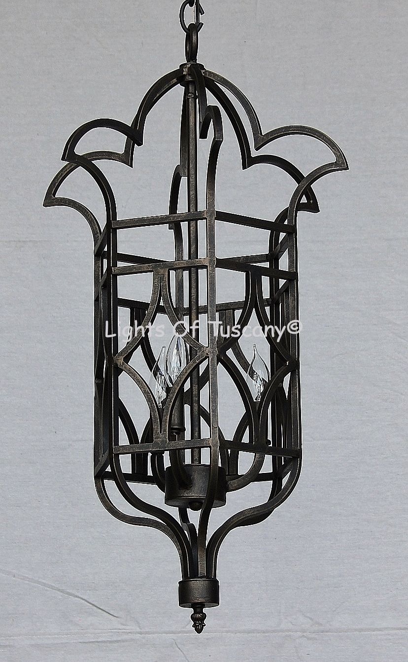 Hand forged wrought iron Contemporary Transitional Iron Hanging Pendant Light. Great contemporary transitional style with geometric design through the top and cage of the fixture. Shown in our antique bronze finish with standard candle.