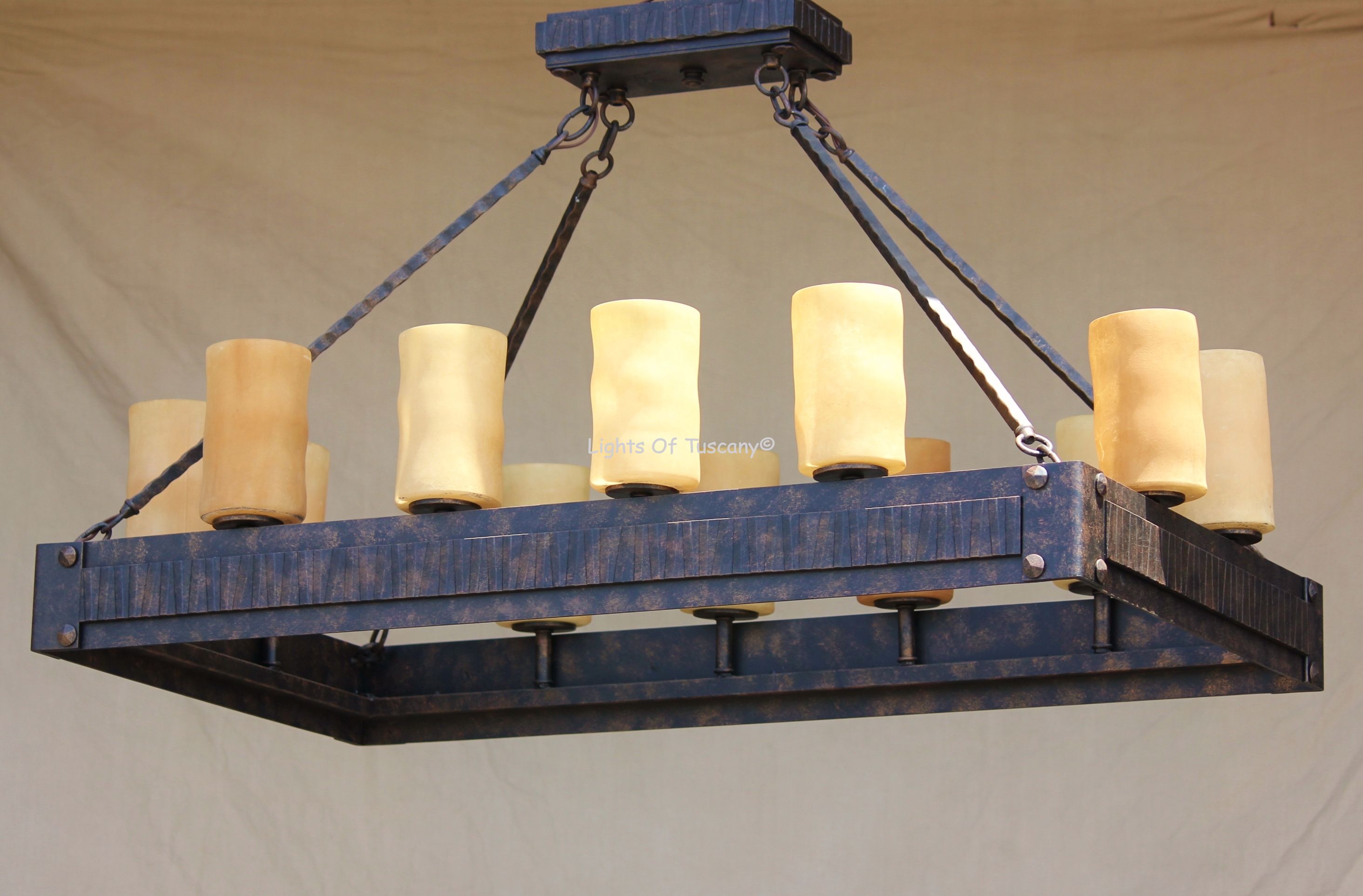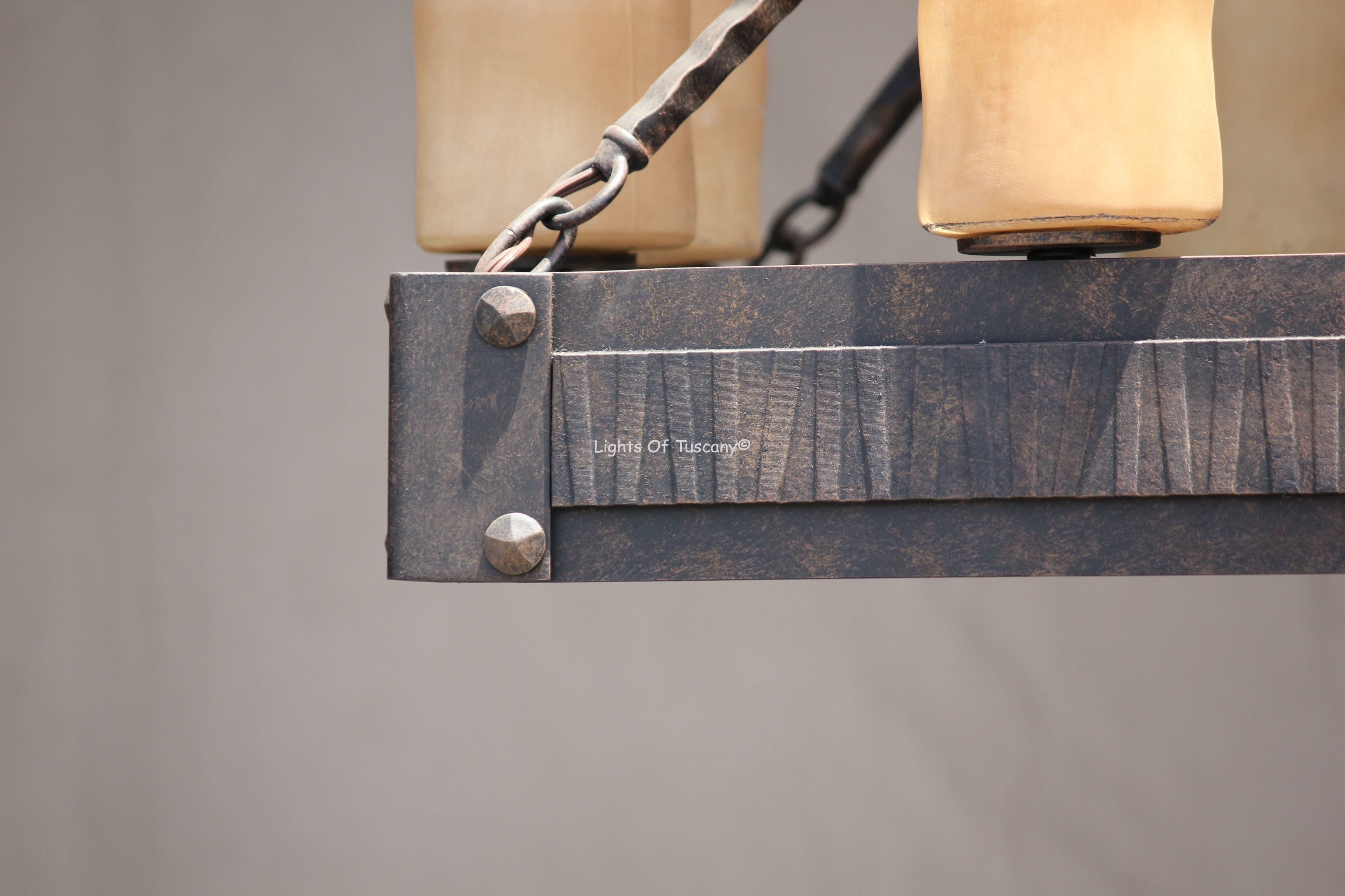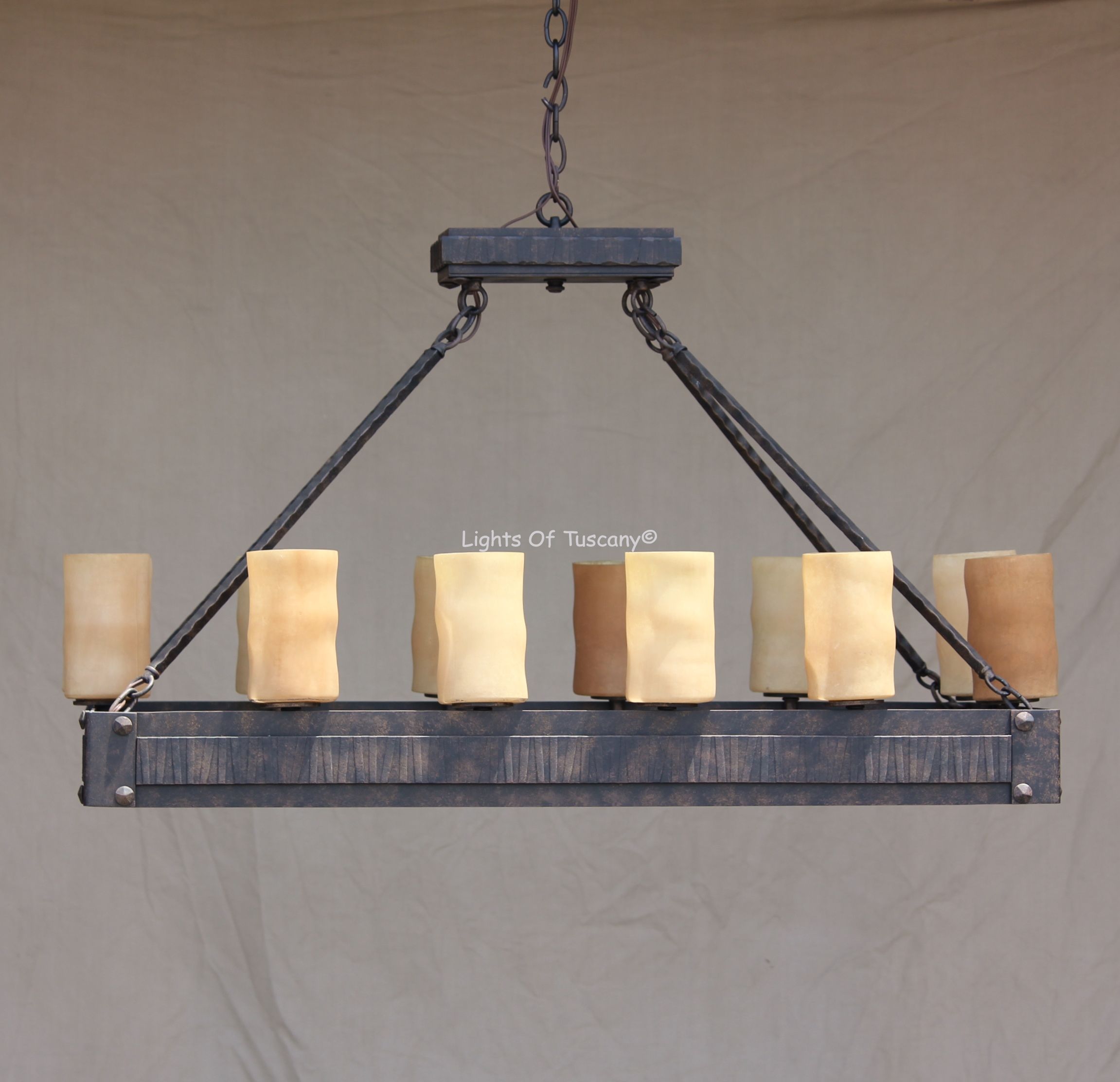 Hand forged wrought iron linear contemporary style kitchen island chandelier. Boasts with contemporary/transitional features, this fixture is perfect for living spaces, over a dining room table or over your kitchen island. Shown in our antique bronze finish with amber glass candles.