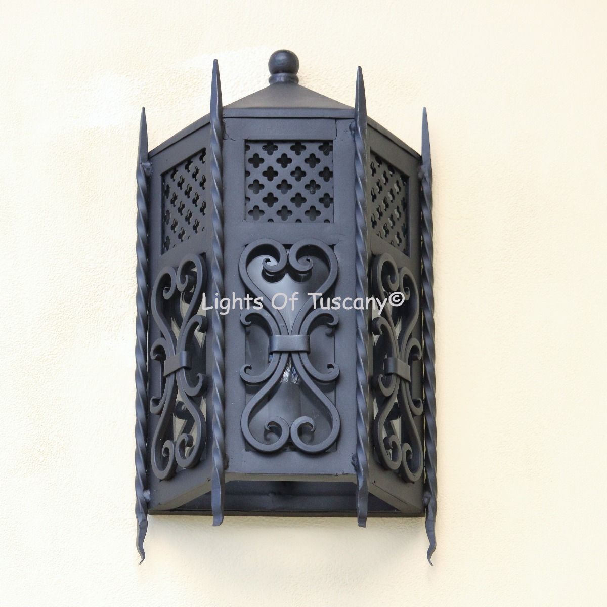 This beautiful hand crafted outdoor wall light is made of all authentic hand forged wrought iron. All our fixtures are hand painted and available in any of our finish options. This fixture is perfect for garage lighting, outdoor walls, backyard and patio lighting.