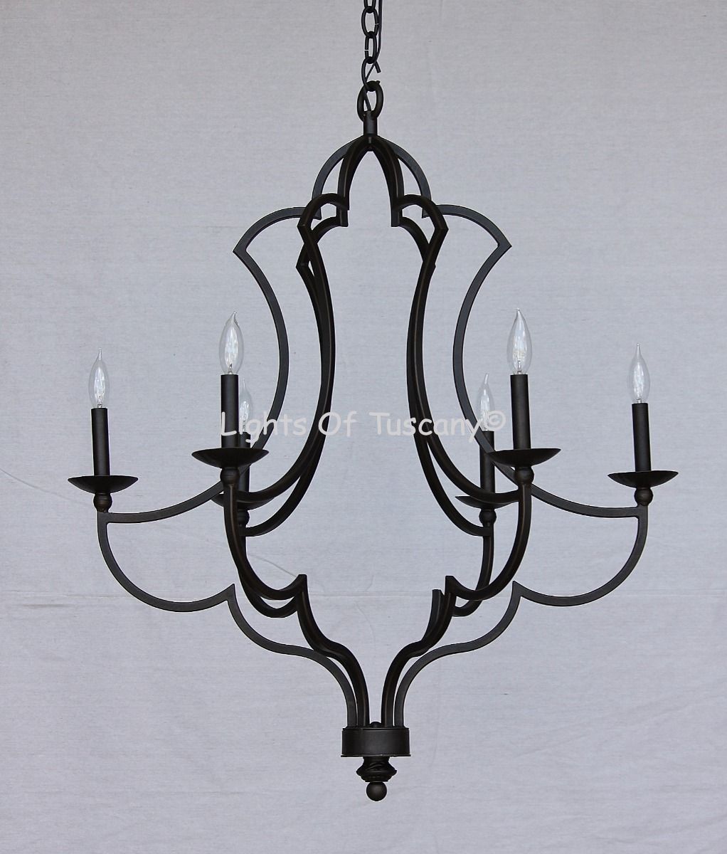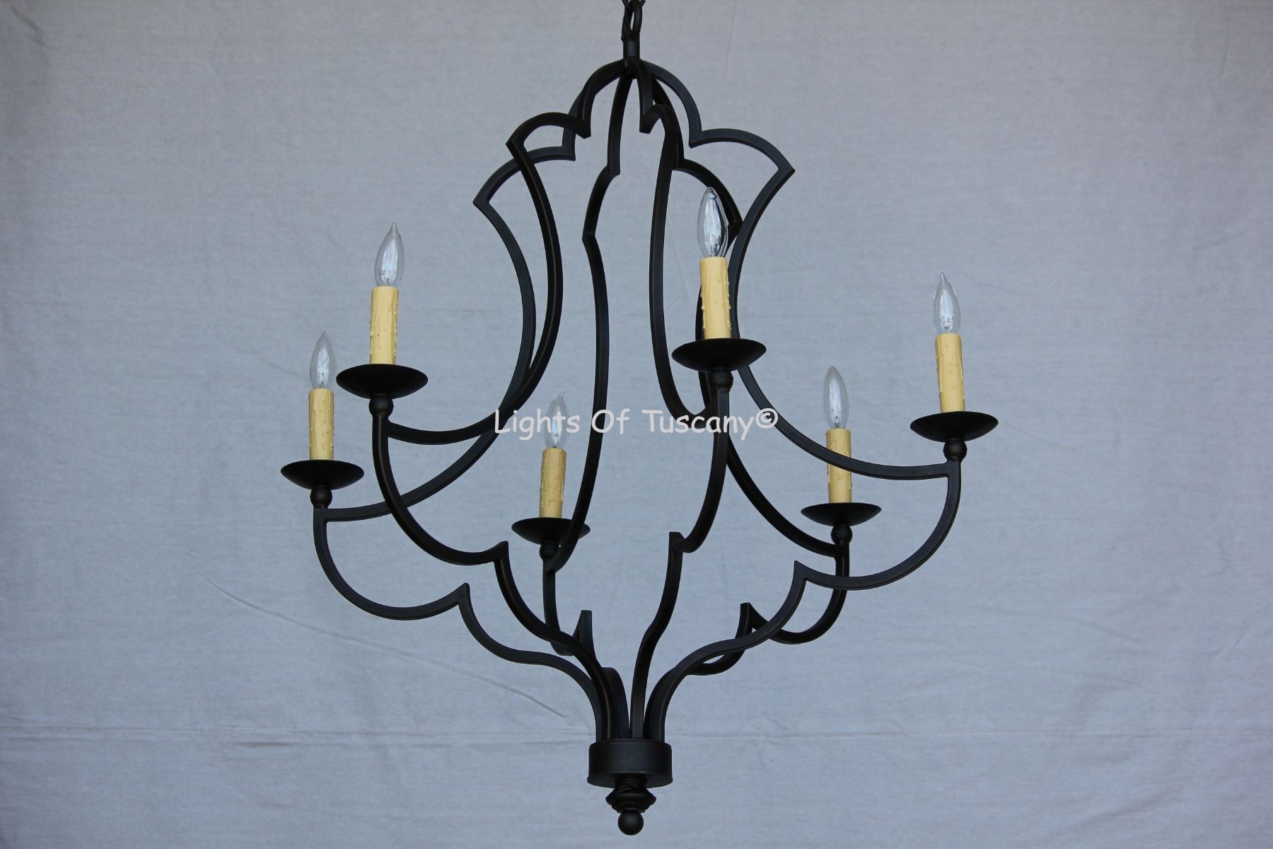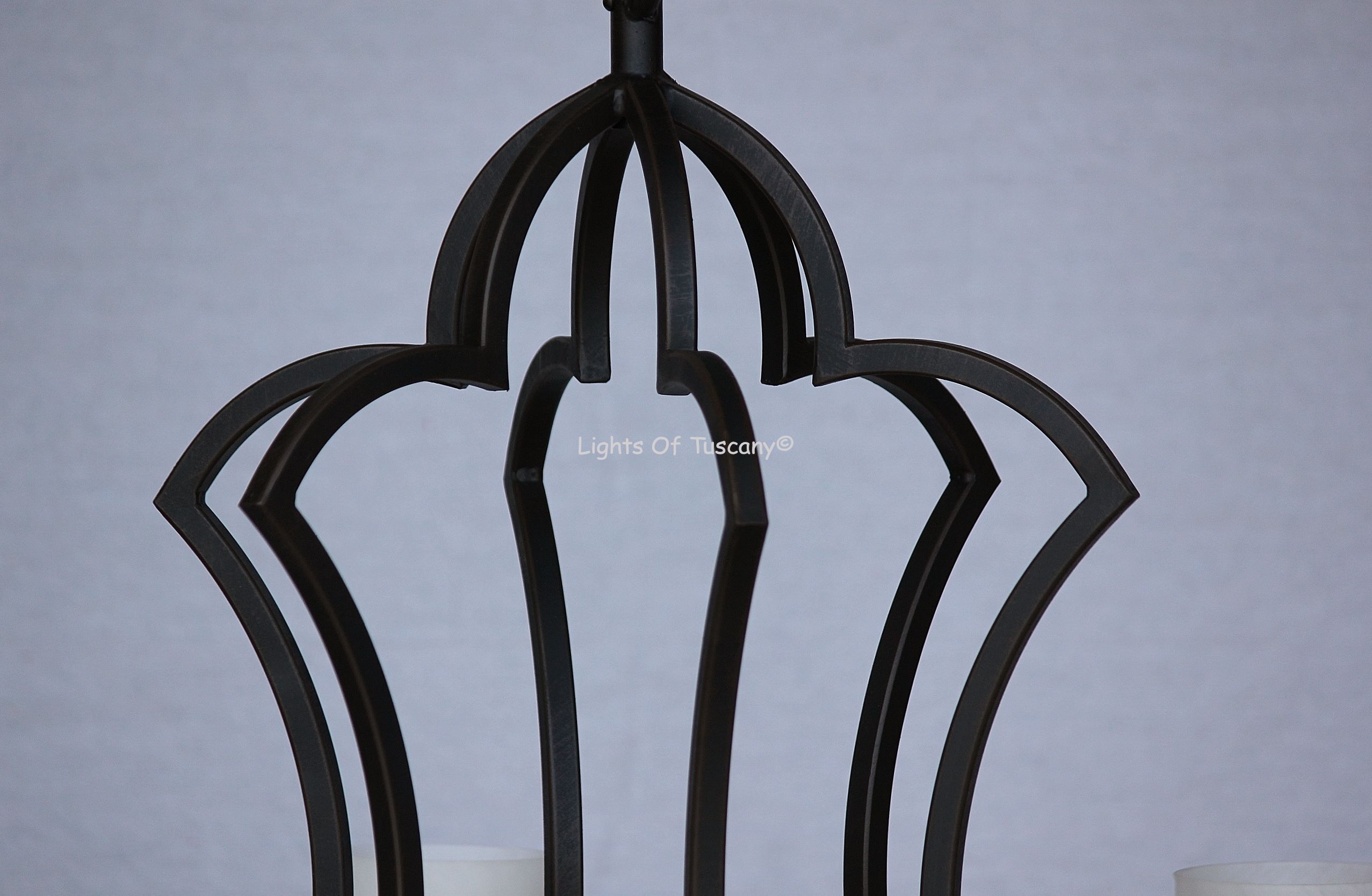 Our beautiful Contemporary Style Chandelier is made of all hand forged wrought iron. Simple beautiful pointed arch cage body with globe accents at the base of the candle cups. This beautiful chandelier is perfect for your dining room or any living space. This can be made with candle sticks. Shown in our matte black finish with off white candles.
