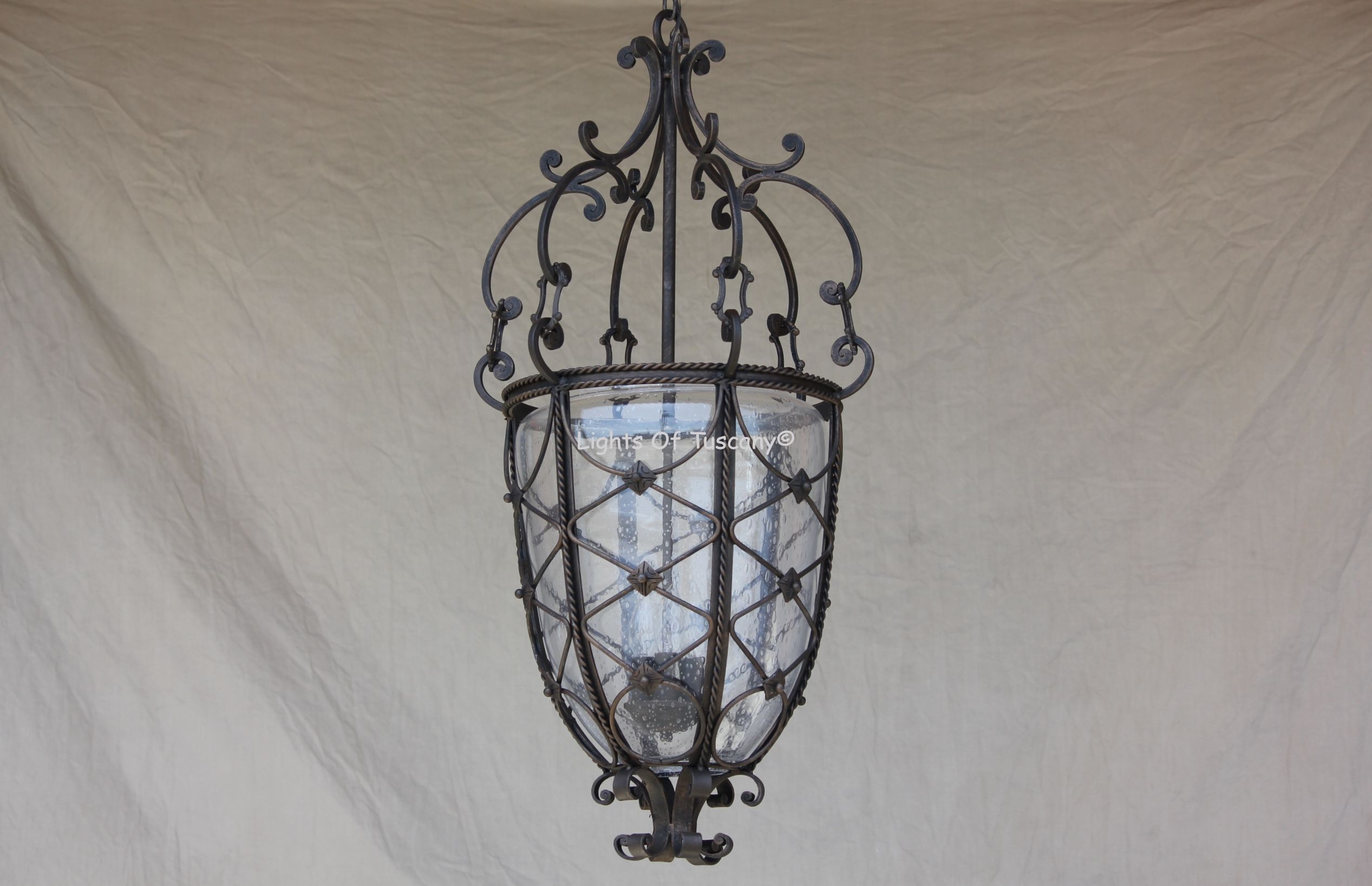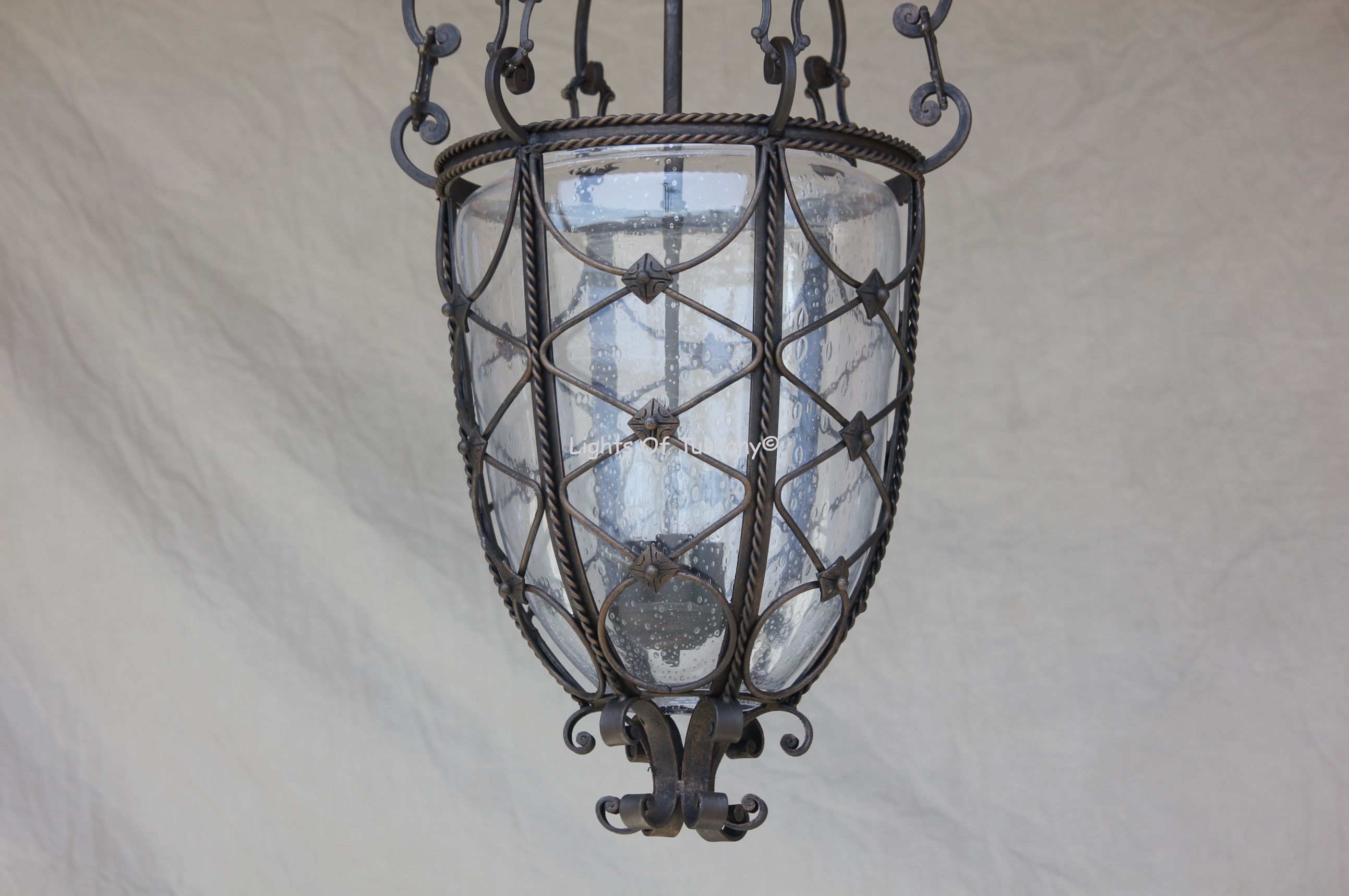 Hand forged wrought iron Tuscan / Mediterranean style hanging pendant light. This lantern light has a traditional designs with detailed tabs and hand bent designs, and a hand forged scroll finial at the bottom. This fixture is a show stopping piece. This fixture complements any design genre and is perfect for entryways, living spaces and outdoor covered areas. Shown in our Antique Bronze and Seeded Glass Bowl.