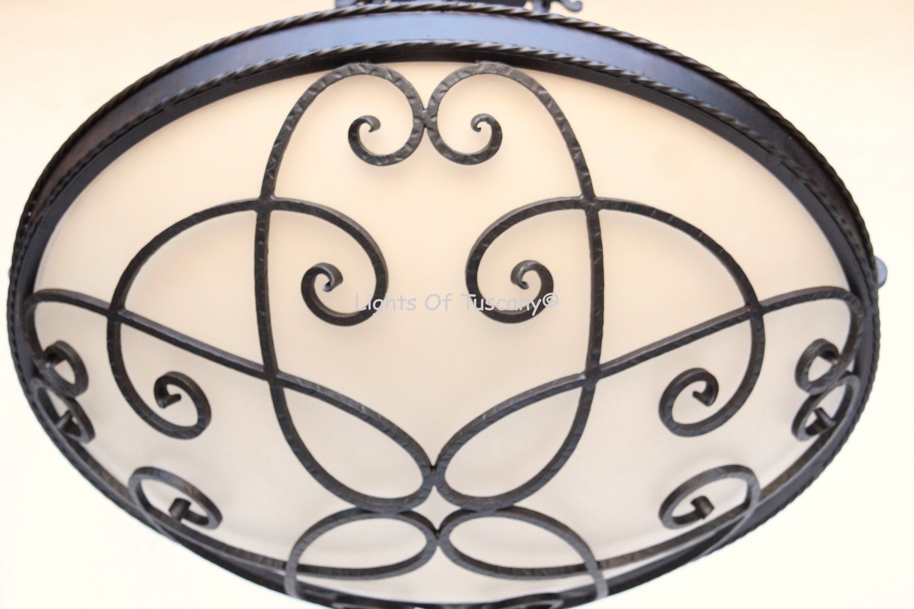 This beautiful hanging light is authentic hand forged wrought iron. Decorated with beautiful hand made iron accents. This fixture is perfect for entryways, dining room, over kitchen islands, outdoor covered areas (dry/damp rated locations), and any living space. Made to order in your choice finish and additional available options at check out.