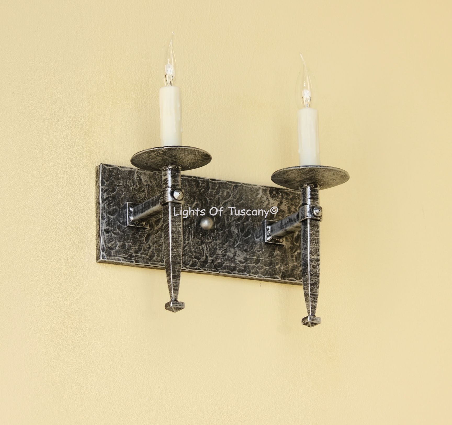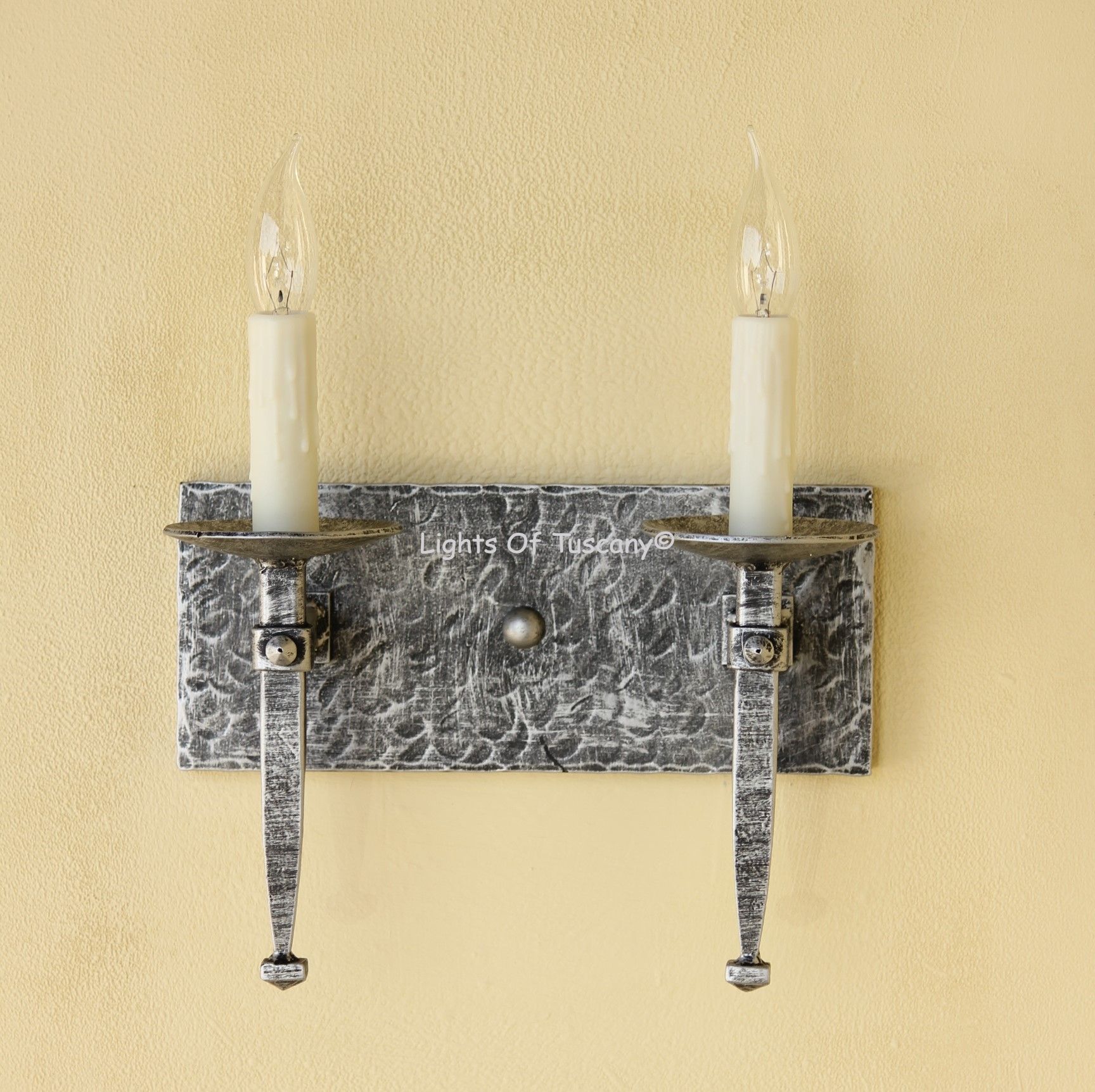 Beautiful authentic hand forged wrought iron bathroom vanity light fixture. Available in your selection of finish options. Online photo shown in dark silver finish with cream candlestick.