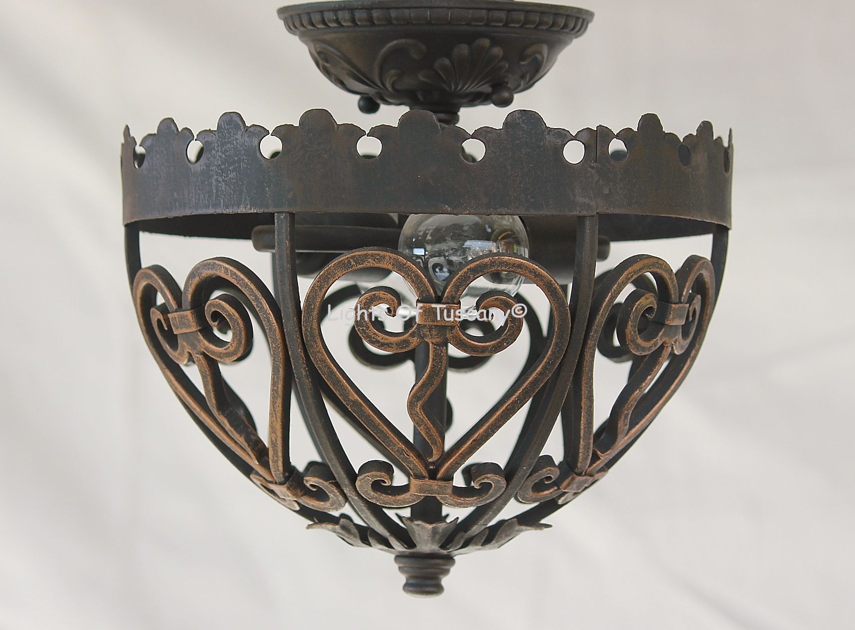 This beautiful semi flush mount fixture is all handmade of hand forged wrought iron. It has beautiful scroll designs with heart shaped style design. This light gives off ample lighting would be perfect for hallways or any living space. Can be used outdoors in covered areas, dry/damp locations. Shown in our antique bronze finish.