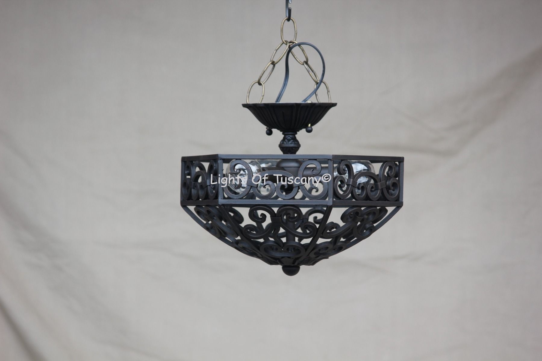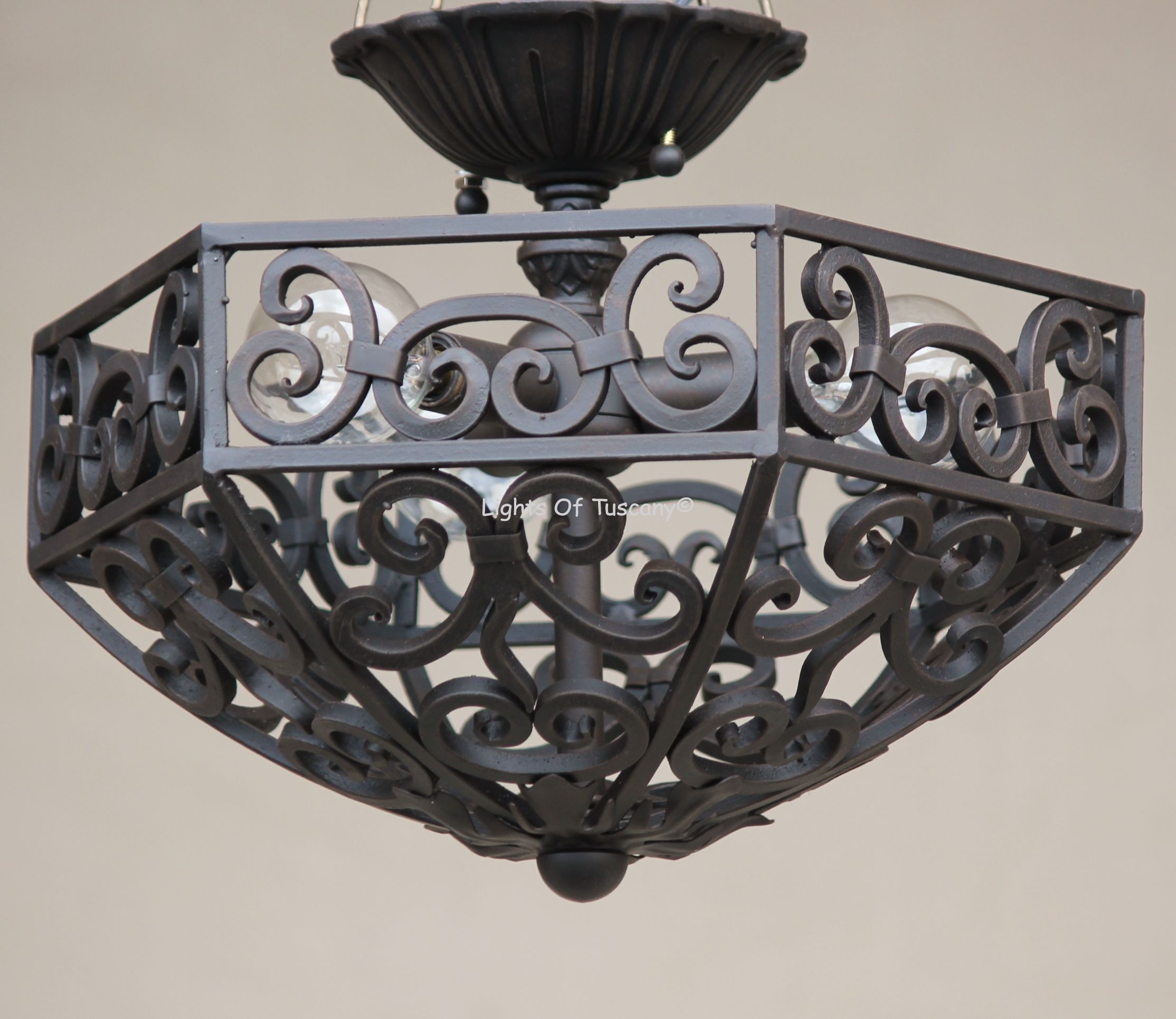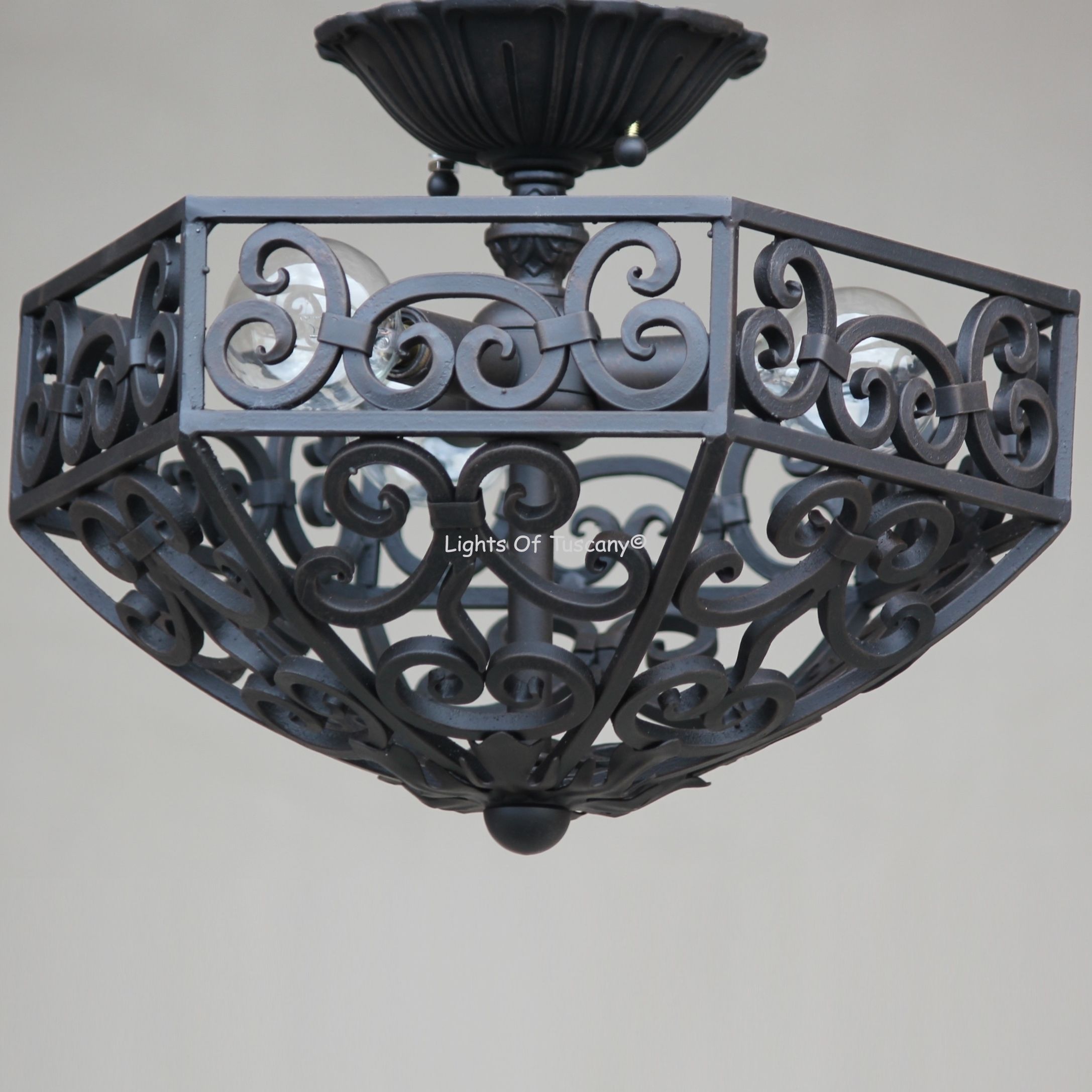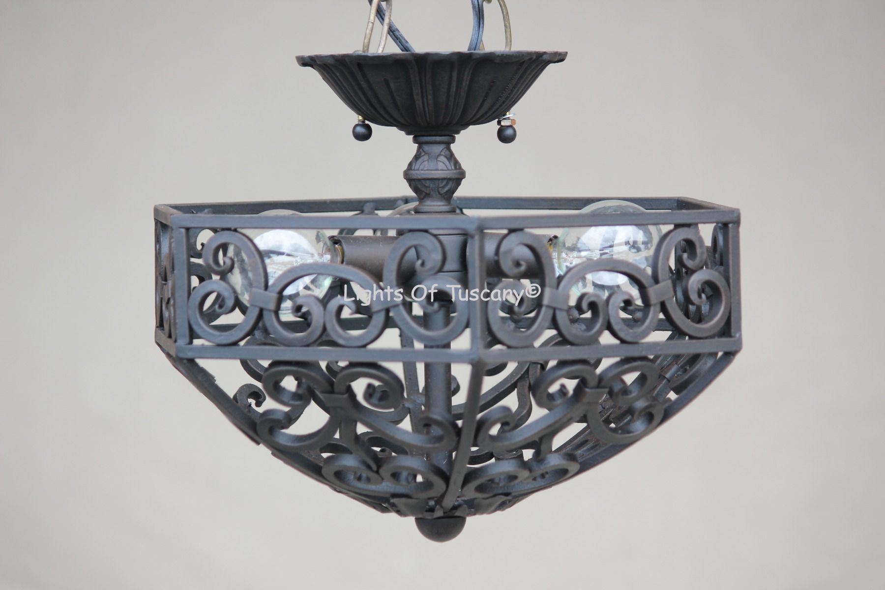 This beautiful Spanish Revival Semi Flush Ceiling Fixture is made with wrought iron scrolling with detailed hand finished iron work. This fixture is perfect for hallways, entryways, and any living space.