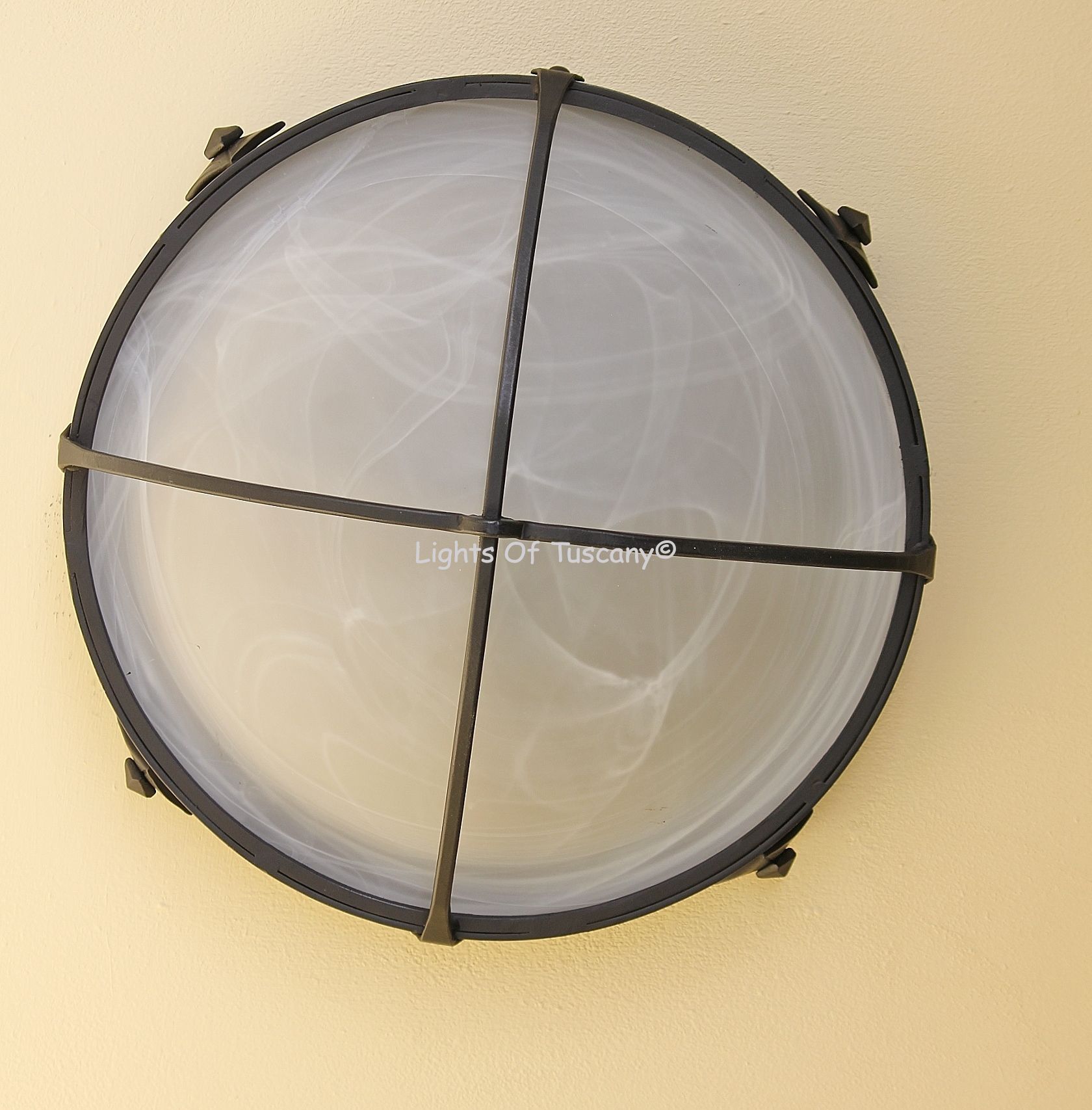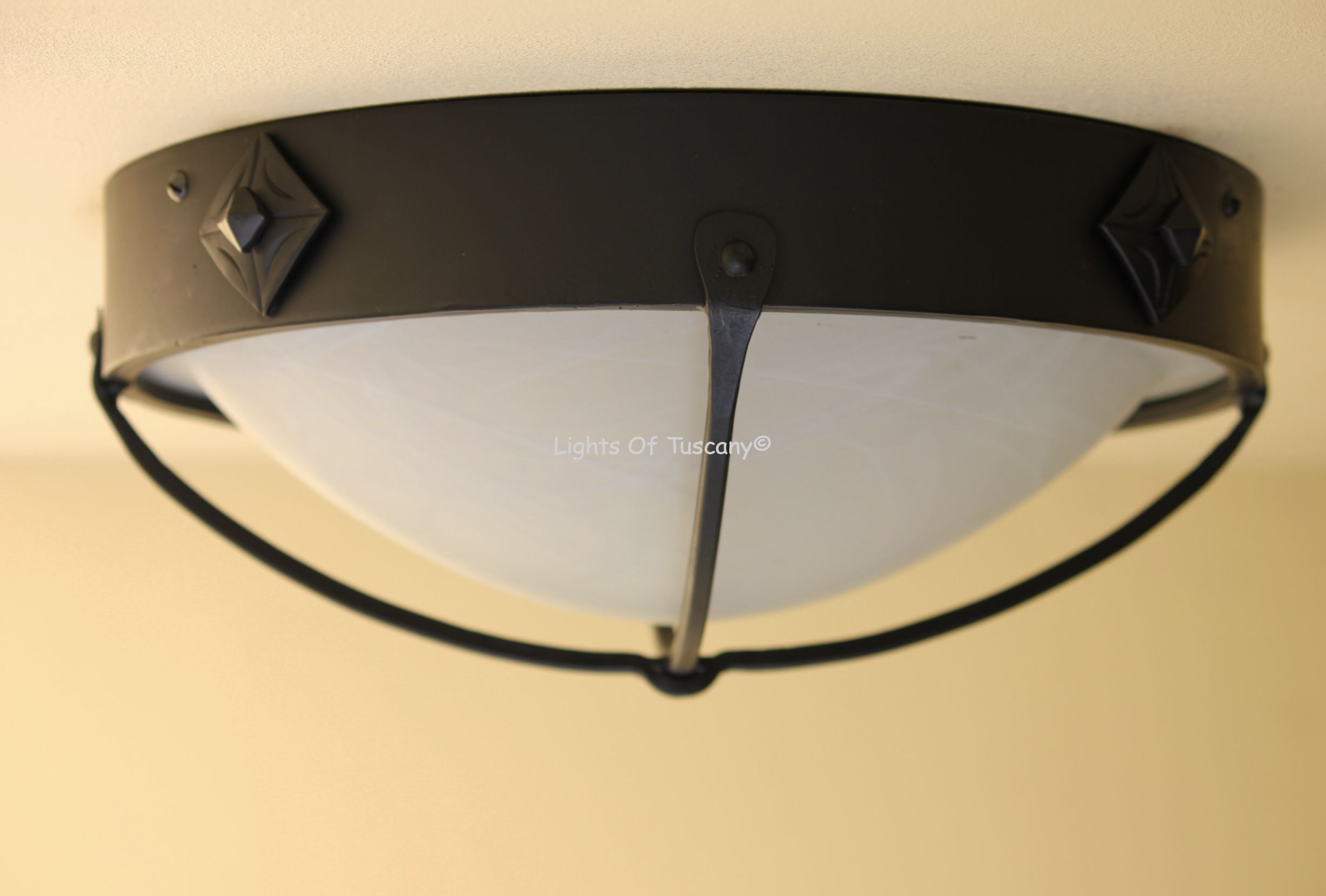 Hand forged wrought iron Spanish Contemporary Style Flush Ceiling Light. This beautiful Spanish Contemporary style ceiling light has hand forged cross iron bars supporting the alabaster glass bowl with accented square bolts. This fixture sits flush to your ceiling. This light fixture can also be used outdoors is perfect for any indoor/outdoor living space, hallway, and/or entryway. Can be made semi-flush, please contact us for customization modifications. Shown in our popular dark brown finish with a white alabaster glass bowl.
