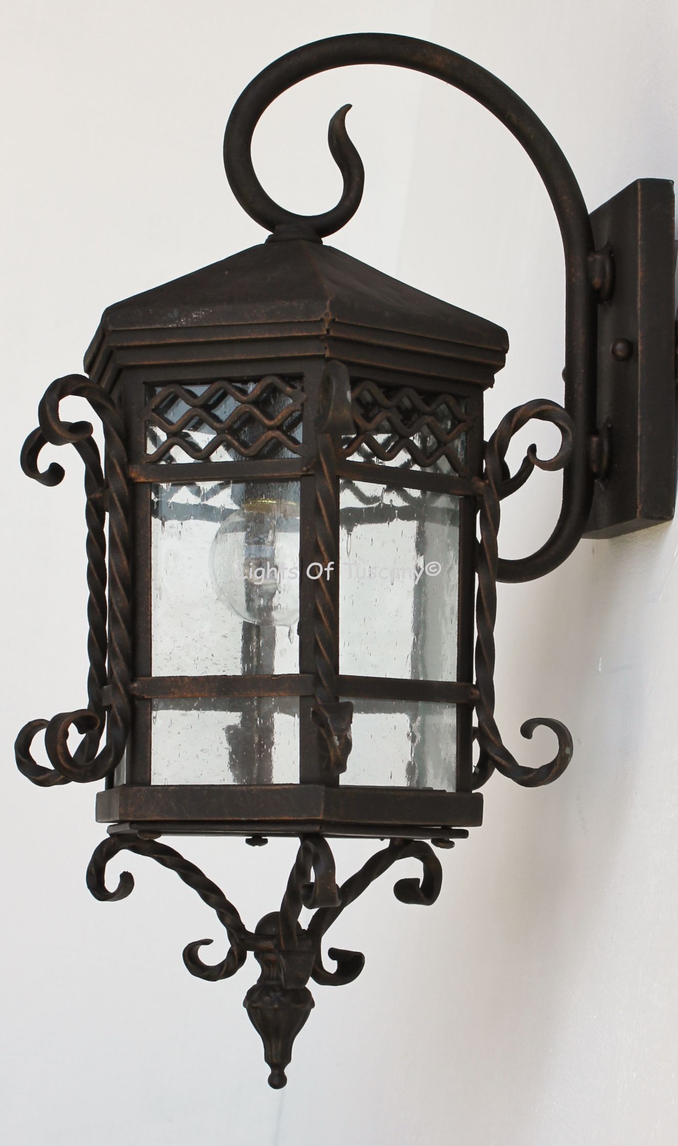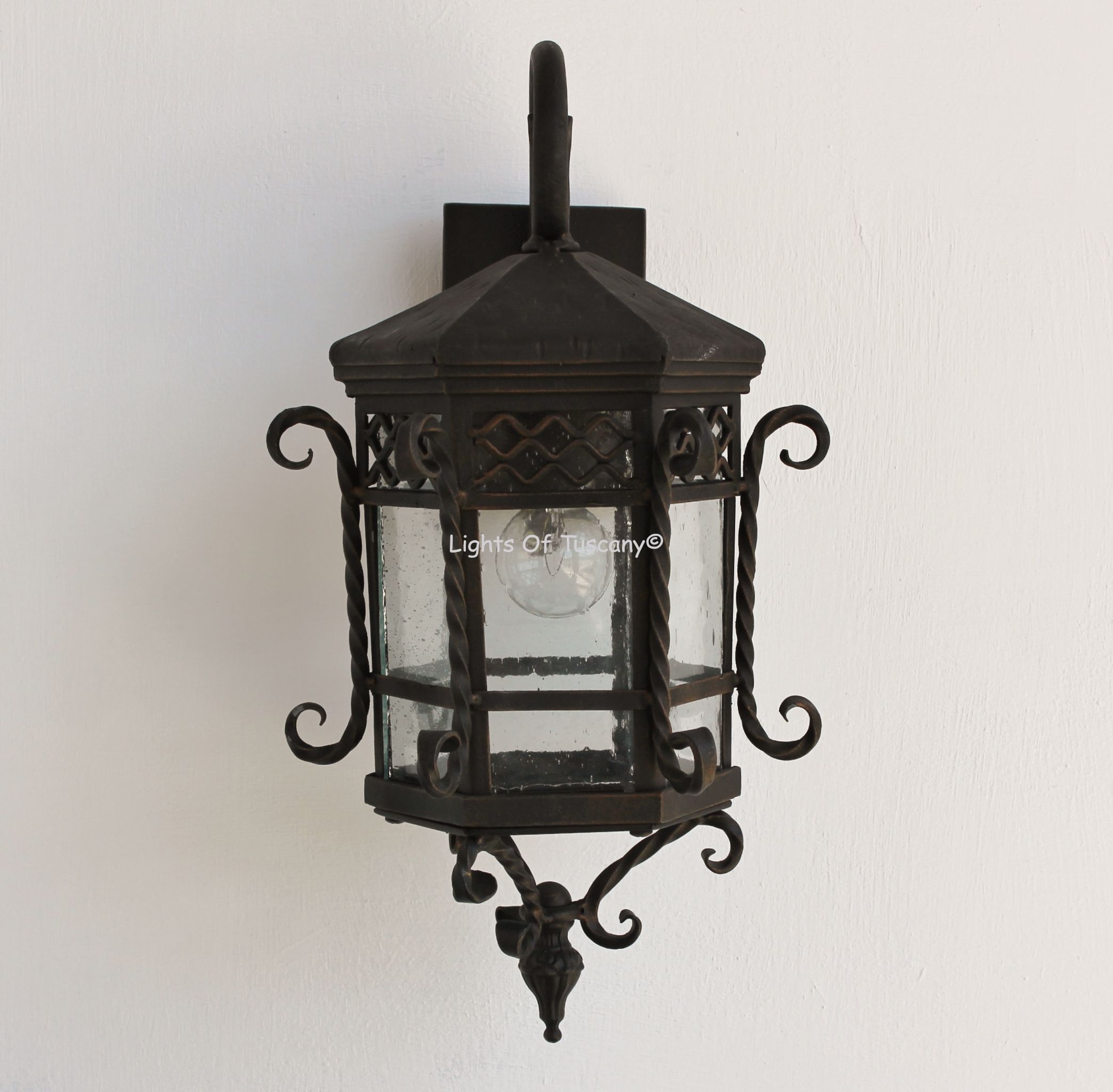 This beautiful hand crafted outdoor wall light is made of all authentic hand forged wrought iron. All our fixtures are hand painted and available in any of our finish options. This fixture is perfect for garage lighting, outdoor walls, backyard and patio lighting.